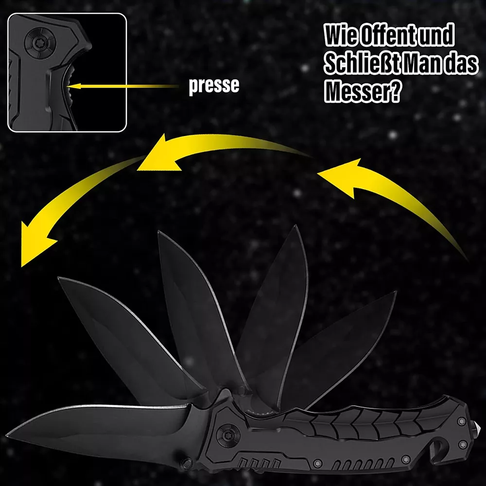 Knife type: folding knife You buy here a very high quality outdoor folding knife of the brand The extremely sharp blade, is made of stainless steel and can be opened comfortably with one hand, by means of flip function. The knife meets all the criteria you would expect from a Survival pocket knife! In addition to an extremely high overall stability of the knife, it additionally has a belt cutter and a glass breaker. In addition, you can easily carry your faithful companion with you with the existing belt clip and have your tools at hand at any time. Whether you are carving, cutting, guttering, refining or crushing, the robust, ergonomically shaped handle made of aluminium is perfect for you and carbon perfect in the hand. Features: robust and wear-resistant, sharp and durable, easy to carry, suitable for hand shape, carefully selected materials, mini and compact, foldable Specificaiton: Blade length: 9cm Blade angle: 50 ° Length of knife handle: 110mm Application: Outdoor, Self-defense Material: aluminium alloy+stainless steel 3cr13 Applicable audience: It is not recommended for minors to buy and use, and during use supervision by adults is required. P ackage included: 1 x Knife