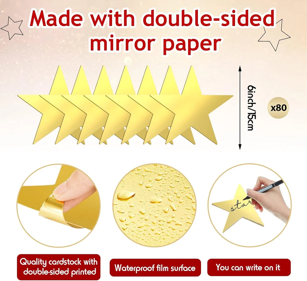 Store New Arrivals Add to Favorite View Feedback Contact 80 Pieces Stars Cutouts Double Printed Paper Star Decorations Glitter Star Confetti Cutouts Cardboard Stars for Bulletin Board Classroom Wall Party Decoration Supply, 6 Inches (Gold) Description Item model number LN--1405 Color Gold Material Cardstock Item Weight 5 ounces Theme Space Package Dimensions 10.55 x 7.13 x 0.63 inches Number of Pieces 80 Size Information: the star decorations for party are approx. 15 cm/ 6 inches in diameter, proper in size and light in weight, you can hang them on the wall, door, window or other places (punch a hole on your own) without taking up too much space Reliable and Long Lasting: these stars party decorations are made of cardstock material with double sided printed technology, reliable and sturdy, will not tear or break easily, safely to use, you can use them with confidence, they can serve you for a long time DIY Your Own Decors: you can draw some beautiful patterns or write some meaningful sentences on these cardboard stars decorations, and then use them to decorate the places you want, which can better attract guests' attention Rich in Quantity: you will get 80 pieces of stars cutouts decorations, the quantity is sufficient for your party decorative needs, you can also share them with your close friends or neighbors Add a Strong Party Vibe: these hanging stars are designed in cute five star shape, applying them as wall decorations, party pendants or background and photo props can bring you nice visual enjoyment and creating an intense party atmosphere Product Description ABOUT US We offer the best prices around on high quality products. Our E-store includes media such as books, movies, music and games while offering electronics, toys, sporting apparel, clothing, tools, general home, garden items and more. SHIPPING We are always working hard to ensure your package arrives as soon as possible. Please understand that some factors like weather, high postal traffic, and the performance of shipping companies are outside of our control. We offer free shipping to the lower 48 states and ship within 2 business days of payment, usually sooner. We do not accept P.O. Boxes. Please provide a physical address. RETURNS We offer a 30-Day Return Policy on items which you are not completely satisfied with. You have the option for a full-refund or an exchange of the item. No returns are available on items shipped outside of the USA. PAYMENT We accept PayPal. CONTACT US This page content is yet to come Please ad us to your favorite seller and visit again later Thank You CUSTOMER SATISFACTION We try our very best to make sure every customer is completely satisfied. If there's a problem, message us! We're happy to help.