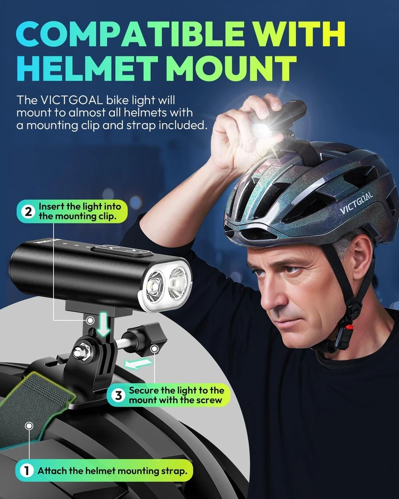 Product Description: Brightness: 800 Lumen Waterproof: IPX5 Size: 4.1*7.5*2.4cm Weight: 105g Material: Aluminum alloy Battery: 2000mAh rechargeable LED Bulb: LED*2 Lighting Modes: 13 lighting modes High Beam Modes: High-Medium-Low-Strobe-SOS Low Beam Modes: High-Medium-Low-Strobe-SOS Double Click to switch dual light mode: High-Medium-Low Battery Display: 3-level battery indicator Package include: helmet light*1, adjustable helmet mount *1, handlebar mount*1, type-C cable*1, instruction*1. Features: 1.The Powerful Bike Headlight that fits any bike or scooter handlebar is the essential accessory for night rider. 2.The High performance front bike helmet light that can be mounted to any helmets will enhance visibility and safety while illuminating your path. 3.The cycling helmet light is equipped with dual beam, can help us deal with different situation and demands while providing 13 modes and 3 brightness levels. 4.The light for bike helmet is so portable and waterproof that can be perfect for multi-activities as cycling, hiking, camping and repairing. 5.The front helmet lamp with 2000mAh battery provide long battery life on a single charge, can be speedy Type-C charging and easy battery monitoring. High Brightness & Easy Operation: Super bright 800 Lumens bike helmet light with dual beam can provide 13 modes and 3 brightness by 2 buttons. Easy switch between High and Low Beam of the bicycle headlight can ensure the maximum visibility in night cycling, farther, wider and safer. Mount on Helmet & Handlebar: The bike helmet light provides an adjustable helmet mount and a handlebar mount that suitable for most helmets or the handlebar of any bikes and scooter. Ensuring the front bike light always illuminates the path effectively and safely as a perfect addition for biking, hiking, or any nighttime adventure. Long Battery Life & Quick Charge: Helmet light features a 2000mAh battery to provide extended use of 8 hours on a single charge, ensuring stay illuminated during outdoor activities. Type-C quick charging and battery indicator of the bike front light makes it easy to power up and monitor before next outing. Durable, Lightweight & Waterproof: Bike headlight is crafted from high-quality aluminum alloy, weighs only 105g making the helmet light easy to carry and mount. Its IPX5 waterproof rating offers protection against rain and splashes, ensuring use in various weather conditions. Versatile Use of Helmet Light: With the handlebar base and helmet mount, the portability, high brightness and IPX5 waterproof of the front bike light is ideal for multiple outdoor activities, including cycling, camping, camping and repairing. Being safe in low-light situations with our reliable illumination bicycle headlight.
