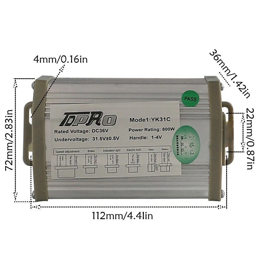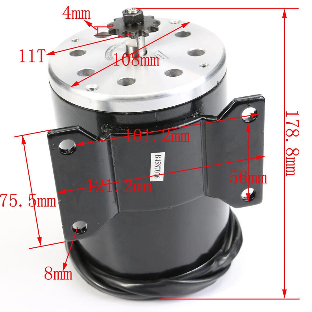 Electric Bike Scooter 36V800W Motor Engine Unite Motor Brush Motor Model MY1020 Electric EVO scooter parts Fits : trycicle , electric scooter , extreme scooter and similar bikes 36V800W Brushed motor Unite Brand Motor motor sprocket 11 teeth Diameter :10.5cm Bracket foot width:12cm Motor length :13.5cm Fit:25H Chain Speed reduction motor /Permanent Magnet Motor - Low speed with large torque Rating power : 800W 36V Rating speed rate/rpm 2800rpm Rating torque /N.m : 2.8 N.m Efficiency : 78 Use : tricycle , bicycle , E-scooter, EVO scooter ,Extreme scooter Speed Controller: Works on 36V, 800W scooters and electric bikes Type: brush speed controller Voltage: 36V Wattage: 800W Casing material: aluminium Colour: silver Dimensions: 122 x 97 x 50mm Package includes : 1x controller + 1x throttle+ 1x Motor + 1x 36V charger + 3x battery+ 1x charging port + 2x battery connecting wires
