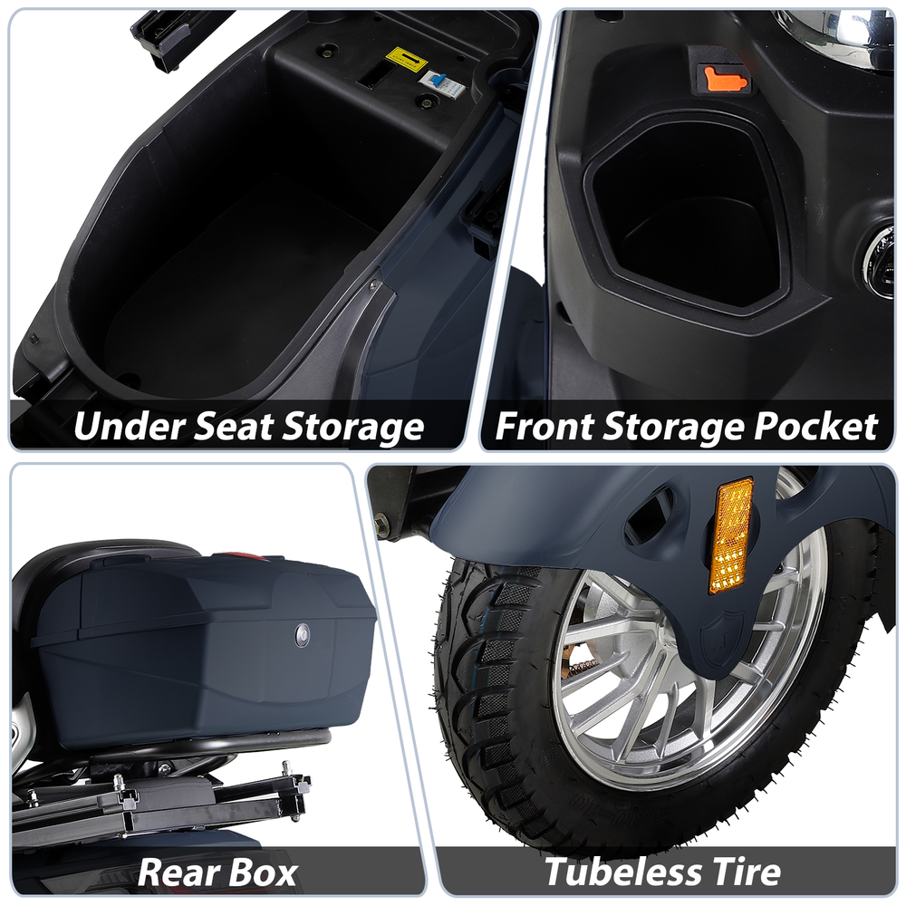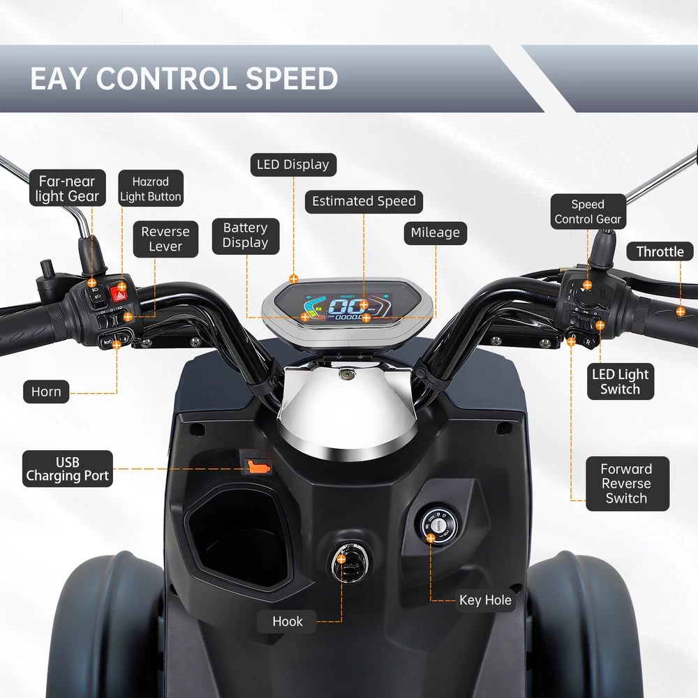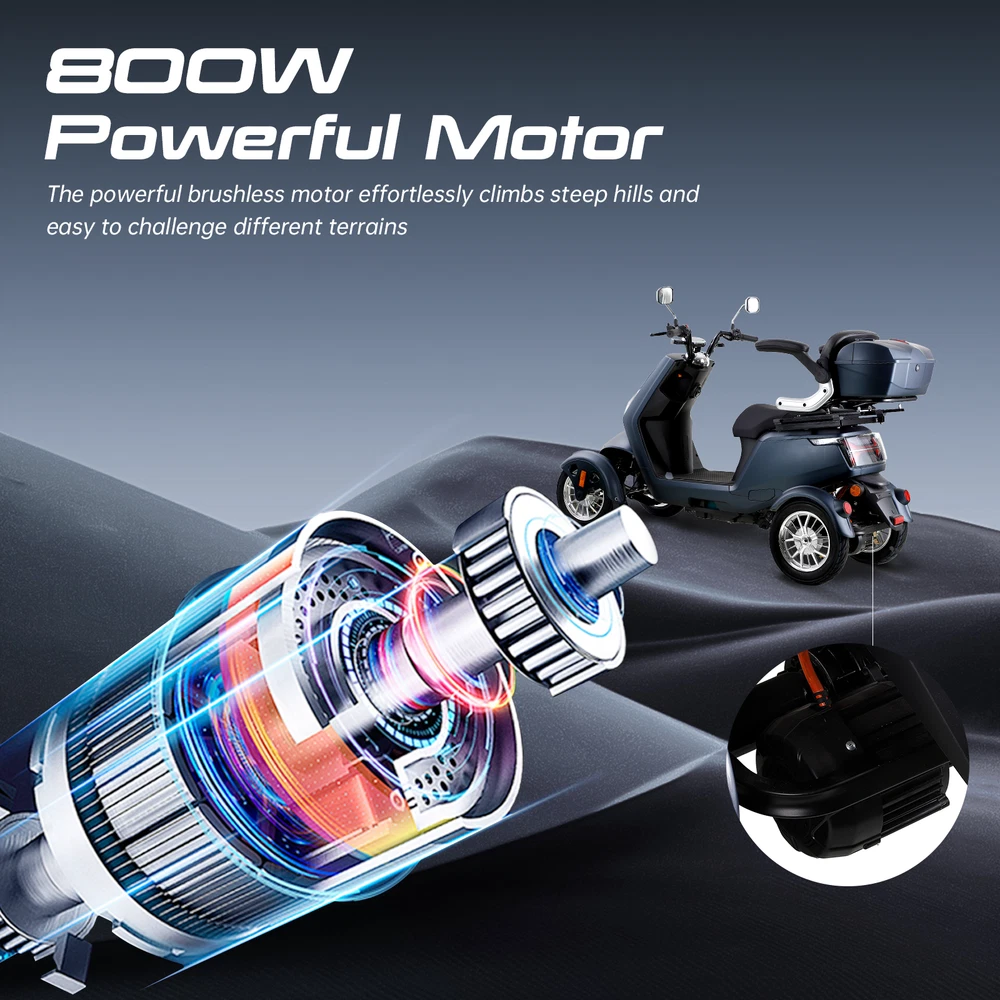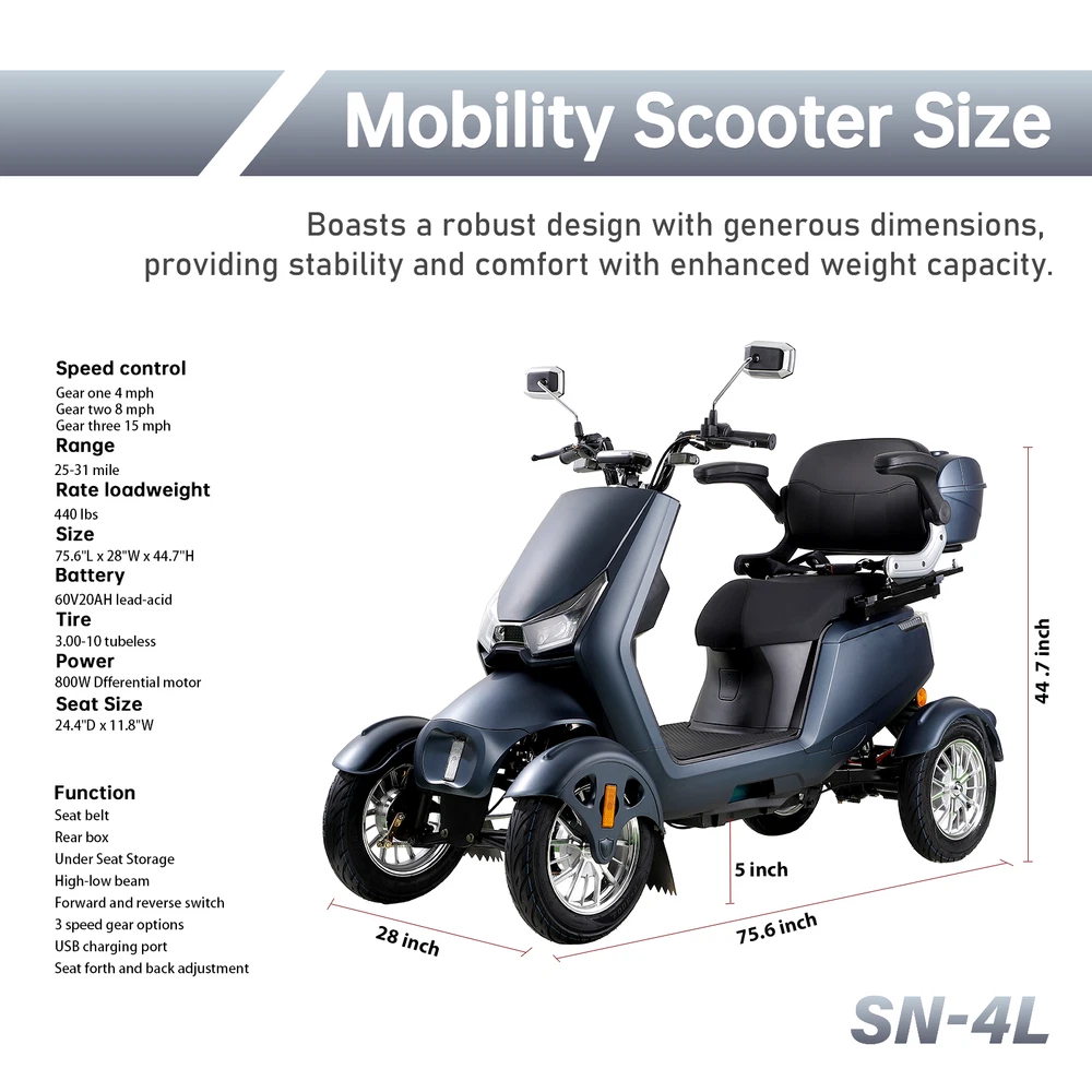 Product Features: POWERFUL DESIGN: The 800W brushless motor drives the scooter up to 15 mph. It is powered by a 60V20Ah (12V/20AH*5 pcs) lead-acid battery, offering an impressive range of up to 31 miles per charge. The spacious legroom accommodates users up to 6.5 ft tall. It can effortlessly conquer 20° inclines and, with its sturdy construction, it supports up to 440 lbs, ensuring reliable performance across various body types. SAFETY FIRST: This powered mobility scooter features a complete lighting system (headlights, taillights, turn signals, front and side running lights, high/low beam, and hazard light switch). Dual rear-view mirrors allow you to see what's behind you, enhancing safety. And a USB charging port can charge you phone easily. EASY TO OPERATE: You can control the three-speed gear to limit the maximum speed (4/8/15 mph). It features a right twist throttle, making it easy to control your speed with a simple twist of the handle. The display shows the current speed, mileage, speed gear status, and remaining charge, allowing you to quickly check the battery status to ensure safe travel. It is also equipped with a reverse switch and a FOB remote, allowing you to start, stop, control the alarm system, and unlock with ease. RIDE COMFORTABLY : This easy-to-drive electric mobility scooter, equipped with 3.00-10 tubeless tires, is designed to provide comfortable travel for the elderly. The adjustable seat depth of up to 24.4 inches and a width of 11.8 inches ensure a personalized fit for each user. Additionally, the smart backrest feature automatically conforms to your back, enhancing the overall comfort of the riding experience. For added safety, the scooter is equipped with a seat belt, ensuring a secure and worry-f Product Specification: Speed: 3-Speed, 4/8/15 mph Motor Power: 800W Size: 75.6'' x 28'' x 44.7'' Battery: 60V 20Ah Lead Acid Batteries Tire: 3-10 tubeless Speed: 15 miles/h Max. Load: 440lbs Cruising Range: 25-31 miles Seat Size: 24.4'' x 11.8'' Payment 1. We accept paypal and all forms of credit card. 2. Payment is required to be made within 7 days of ordering to avoid a UPI case. Shipping 1. All items are dispatched from our demostic warehouse in CA, GA or NJ, America. 2. Under normal conditions, delivery will take between 3 and 8 working days after dispatch, depending on your location. Remote areas will required longer delivery time. 3. If you're given a tracking number, please use it to track the delivery status of your order. We regret that our warehouse is not accessible to the public. As such, we don't offer a pick-up option. 4. Please note: Some products maybe dispatched in more than one carton, they may arrive at different time. If you only received partial box please don't worry, contact us and we will tell you where are the rest packages. Returns We accept returns, Please contact our customer service team immediately if: 1. You changed your mind and wish to request a return; 2. Your product was damaged during transit; 3. You wish to make a warranty claim for any product you have purchase; 4. You're not satisfied with any product that you have purchased. Please note all returns must be directed to through Customer Service, please do not return or post items before obtaining instructions from us. If you do, there is a risk that your returned item may not be identifiable and accepted. Applicable freight fees will be deducted from your refund incases where you changed your mind and wish to return the product. This also applies to order cancelled while in transit.