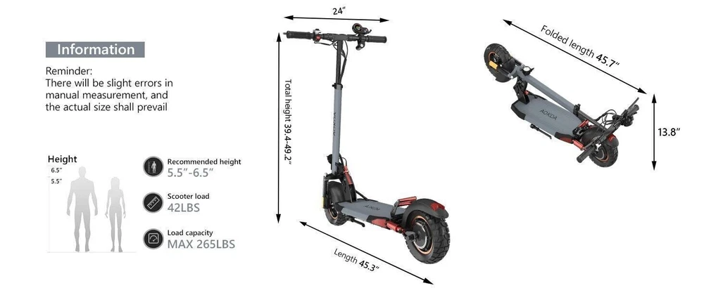 New Way to Across the City Freely The AOKDA electric scooter for adults which is powered by 48V/10Ah battery, makes it easier for you to complete daily travel. One charge is enough for you to ride for 20 miles under specific conditions. Max load 265 lbs. Let You Ride As You Want, Easy to Drive Our e-scooter has three different riding modes (Eco: 15Mph, D: 22Mph, S: 28Mph), you can choose the most suitable mode for you according to your needs, and the strong 800W brushless motor allows you ride speed up to 28Mph. Comfortable Riding Experiences, Enjoy Every Trip Our electric scooter for adult adopts front and rear wheel suspension system and 10-inch pneumatic tires, which means you can enjoy a smoother and more comfortable riding experience, even on rough roads. Make Riding More Safety Our e-scooter for adult is not only equipped with super bright headlight & taillight, but also has a side ambient light, which improves the safety of night riding and allows you to travel with peace of mind at any time. The perfect front & rear dual brakes and electronic braking system allow you to stop whenever you want. Easy to Fold & Carry You can fold the electric scooter for adults with two-steps only in a few seconds for carrying and storage. The unfolded size: 45.28"L x 23.62"W x 47.24"H. The folded size is 45.28"L x 8.66"W x 17.72"H, easy to put in your garage or office. Buy with Confidence We have always focused on the quality and technical improvement of electric scooters. Our adult electric scooter is designed to be the most sturdy and powerful electric scooter which will quickly become your favorite commuting or outdoor travel companion. We offer 180-days warranty for different parts, contact us to get fast and professional service. Important Note The max speed and max range per full charged vary based on several factors, including: rider weight, riding surface, incline, ambient temperature, battery level, riding style (stop/start vs cruising), etc. Q&A: How fast can the electric scooter go? Top Speed: 28MPH / 45KMPH (the speed greatly depends on the rider weight, road condition, riding mode...etc) How long do the electric scooter last? Well, with proper care and maintenance, this e-scooter can last anywhere more than 5 years or even longer. What are the benefits of this off road electric scooter? This off road electric scooters with high power motor, fast, portable, and with detachable seat. Not only good for off road riding, but also good for urban commuting. It also save you money on gas because they can be charged quickly. Do this electric scooter work in the rain? Well, it support IP6 waterproof. It's OK to work in small rain, but not recommend in heavy rain. And the pedal of the e scooter cannot be submerged in water. Or the battery and controller will be damaged.