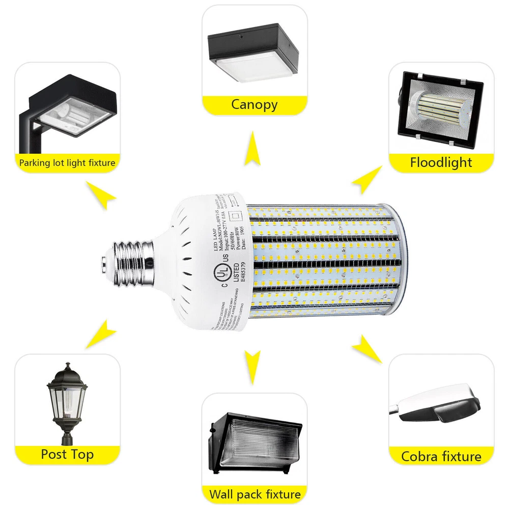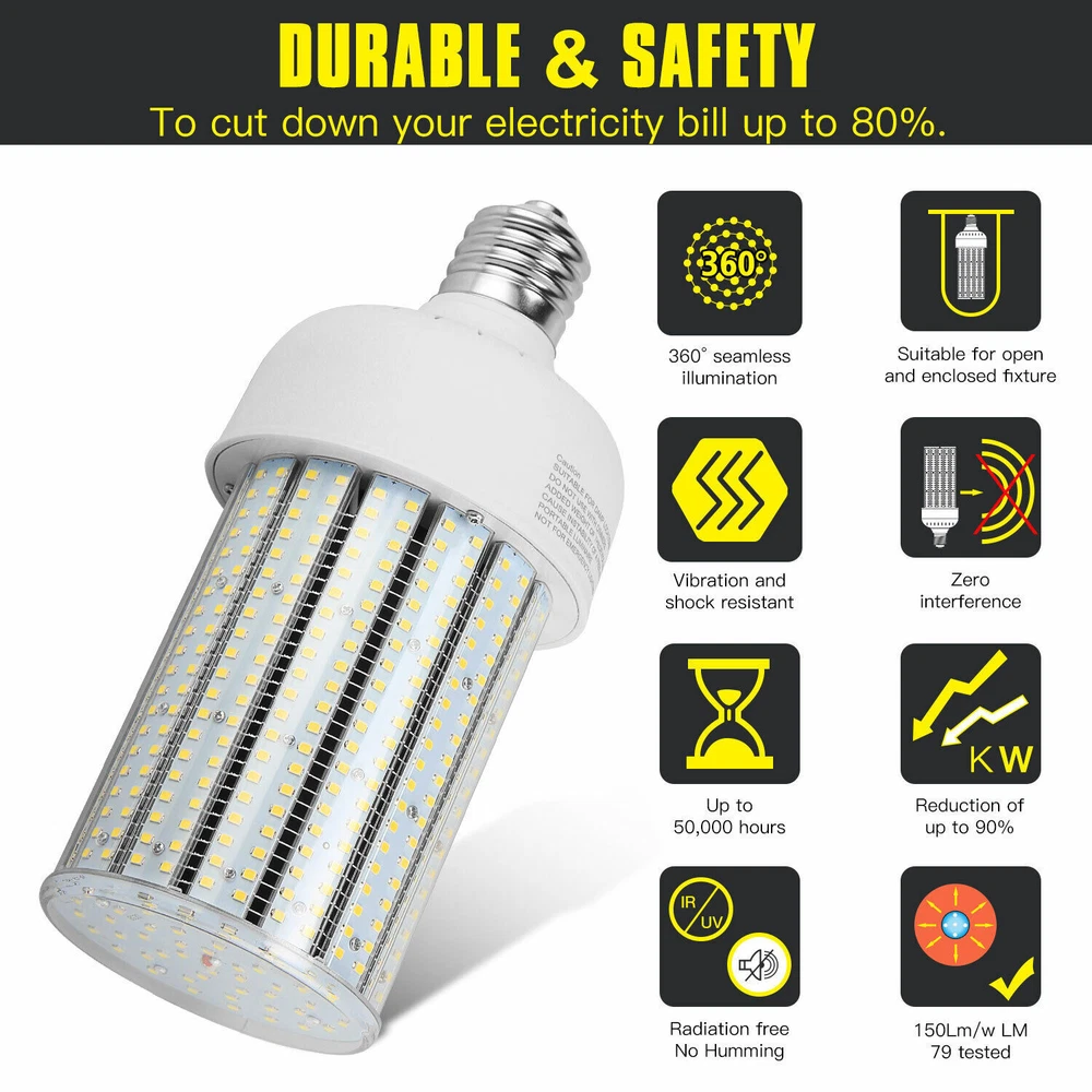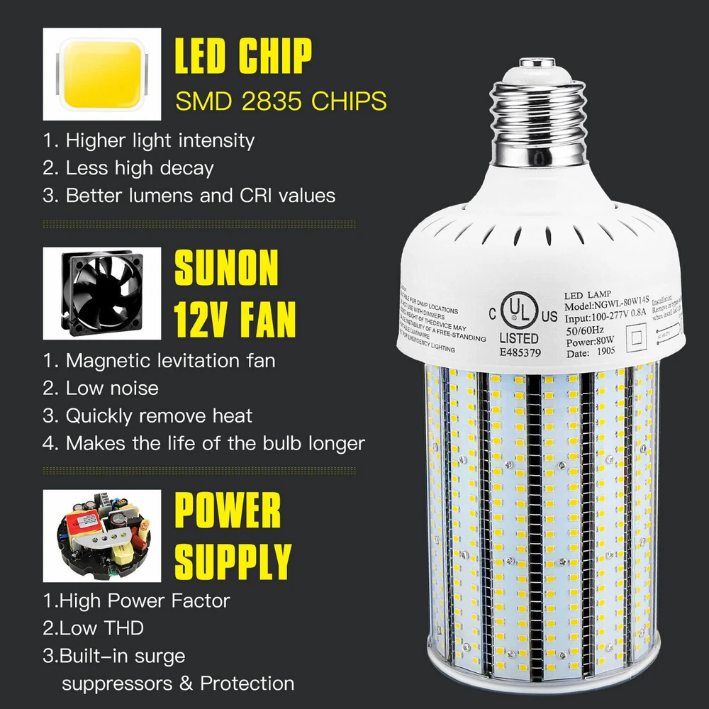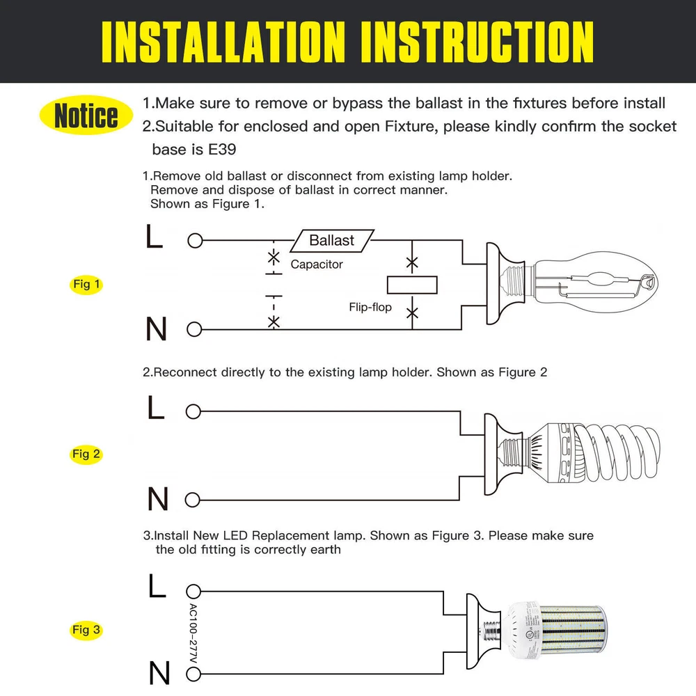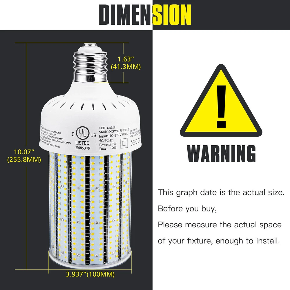 Product Description 80W LED Corn Cob Bulb Light Daylight for Warehouse Factory Workshop (350W Equiv) 【Super Bright】 80W led corn cob with 11000 lumens and 360 degree beam angle fits to be 300W HID Replacement retrofit. The installation height is recommended between 8ft and 10ft. 【90% Energy Saving】The LED corn light reduce more than 90% electricity consume than traditional light. Available for working voltage from 100VAC to 277VAC 【Quality Listed】The industrial quality light passed UL certification. It offers a safer using at home, commercial, industrial area. 【Easy Installation】E39 Base is easy to Connect directly a screw base. Must be remove or bypass the ballast in your electric circuit before installation. 【Long Lifespan】This bulb has 50,000 hours lifespan. Offering at least 11 years of lighting time if used 12 hours a day. 【Warranty】We provide with 5 years warranty for all our bulbs. If any problem or question about bulbs please contact us by email. We will reply within 24 hours. Product description The LED cob bulb are UL/ETL listed with outstanding industrial quality, superb energy efficiency, long lifespan and easy installation. Compared with traditional light bulbs, we provide brighter lighting and wider applications, but we have achieved up to 90% energy saving. So our LED light bulbs can help you save more than 90% of electricity bills. The design of Non-flickering No UV or IR radiation can provide higher stability and reliability when using the bulbs. Feature: 1.UL Listed 2.Replace 300W HID bulb 3.Instant lighting 4.6K high voltage surge protection 5.Non-flickering No UV or IR radiation Technical Data: 1.Lighting Technology: LED 2.Bulb Shape: Corn Cob 3.Rated Power: 80 watts 4.Input Voltage: AC100-277V 5.Bulb Base: E39 Base 6.Power Factor: >90% 7.Power Efficacy: 135 Lm/W 8.Color Temperature: 5,000K 9.Color Rendering Index (RA) : >80 10.PC Cover: Transparent 11.Materials:Aluminum+ASA 12.Lifespan: 50,000 hrs Wide Application: Indoor High Bay Area: warehouse, factory, workshop, shopping mall, church, garage, grocery, car wash-shop, gym, basketball court, tennis court, office, garden, community, back-yard, aircraft storage, farm, restaurant, airport, subway, convention center, swimming pool etc. Outdoor: Parking lot: shoebox, pole/box fixture. Street: cobra head, pole fixture. Gas station: canopy/High bay fixture. Yard/Garden: post top, floodlight/wall pack fixture, Billboard etc. About Us Payment Shipping Returns Contact Us SHENZHEN NUOGUAN TECHNOLOGY CO. LTD founded in 2010. We are high-technology comany specialized in manufacture Commercial and industrial LED light. Advanced production equipment and excellend R&D ability help us to combining service ,production sell together provide top-level products to our customers. 1. Payment is expected within 7 days of auction close. Or Unpaid Items will be forfeited per eBay . 2. Taxes may be applicable at checkout as states adopt new laws and regulations regarding sales tax collection. 1. We ONLY ship to USA . 2. Orders processed within 1-2 business day of payment verification. There’s no Delivery service or courier service on Saturdays, Sundays or Public Holidays. 3. We have 3 different warehouse in US,so due to stock status and time differences, we will choose to ship your item from our first available warehouse for fast delivery. 4. We offer Free Shipping within the Lower 48 states! All packages are sent via UPS or USPS.The delivery time for UPS Ground is typically 2-5 business days. We strive to ensure 100% satisfaction for each and every one of our customers. we offer a 30-day 100% money-back guarantee on all eBay orders. If your item isn't just as you wished, simply send it back to us and we'll refund or replace your item. Please note that all returns must be authorized by our Customer Service department. please contact us though message first if you have any problem. USA Warehouse. Fast shipping! We are appreciated your purchasing form our eBay store. Office Time: 9:30 - 18:30, Monday - Saturday (UTC+8) Please contact us with eBay Message. We will respond you within 24 hours on business day. About Us SHENZHEN NUOGUAN TECHNOLOGY CO. LTD founded in 2010. We are high-technology comany specialized in manufacture Commercial and industrial LED light. Advanced production equipment and excellend R&D ability help us to combining service ,production sell together provide top-level products to our customers. Payment 1. Payment is expected within 7 days of auction close. Or Unpaid Items will be forfeited per eBay . 2. Taxes may be applicable at checkout as states adopt new laws and regulations regarding sales tax collection. Shipping 1. We ONLY ship to USA . 2. Orders processed within 1-2 business day of payment verification. There’s no Delivery service or courier service on Saturdays, Sundays or Public Holidays. 3. We have 3 different warehouse in US,so due to stock status and time differences, we will choose to ship your item from our first available warehouse for fast delivery. 4. We offer Free Shipping within the Lower 48 states! All packages are sent via UPS or USPS.The delivery time for UPS Ground is typically 2-5 business days. Returns We strive to ensure 100% satisfaction for each and every one of our customers. we offer a 30-day 100% money-back guarantee on all eBay orders. If your item isn't just as you wished, simply send it back to us and we'll refund or replace your item. Please note that all returns must be authorized by our Customer Service department. please contact us though message first if you have any problem. Contact Us USA Warehouse. Fast shipping! We are appreciated your purchasing form our eBay store. Office Time: 9:30 - 18:30, Monday - Saturday (UTC+8) Please contact us with eBay Message. We will respond you within 24 hours on business day. You may also like 100W LED Barn Light with Dusk To Dawn Photocell Outdoor Garden Yard Night Light 69.05 USD Free shipping 200W UFO LED High Bay Light 