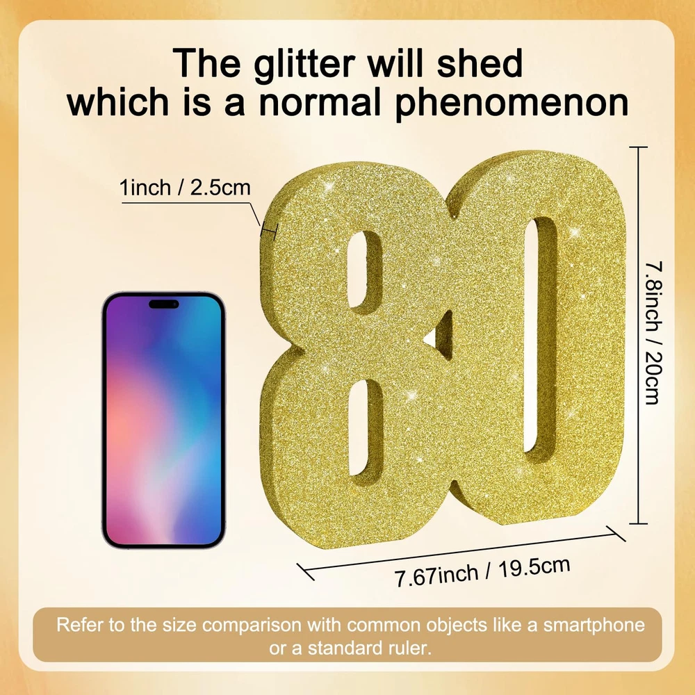 Product informatio 1*80 gold glitter number decoration. Size: 20*20*3CM.(7.8*7.8*1.2 Inch) Exquisite design The appearance is made of fine golden glitter, and the "80"-shaped wooden decoration is fully wrapped 360 degrees. When light hits it, it reflects and glows, attracting everyone's attention.This is a great party decoration. The shining points twinkle like the charming starry sky. Usage scenario Suitable for 80th birthday party, 80th anniversary party, 80th anniversary celebration party. Especially used during the day when there is strong light or at night when there is light. It will brighten up your party. Advantage All-in-one product design, no assembly required. You just open the package and place it where you want to decorate and add to the party atmosphere. The items compared with other products, the powder falling off phenomenon is relatively small. It won't cause problems for your party. ITEM INFORMATION AND SIZE: 1 Pcs * 80 Gold Glitter Number Ornament. Size: 7.8 * 7.8 * 1 inches (20*20*2.5cm). Before purchasing, Please check the size carefully to make sure it meets your needs PLEASE NOTE: Adorned with gold glitter powder, this item beautifully reflects light and is perfect for party decorations. However, please note that due to the use of glitter powder in its craftsmanship, a small amount will fall off. This is normal and should be expected. Therefore, please take care to keep other items free from the powder HIGH QUALITY: The item uses high-quality wood and glitter powder, and the texture is great. Compared with other item, the phenomenon of powder falling off is relatively minor. It won't ruin your party EASY TO USE: The integrated design of the product requires no assembly. You only need to unpack it and place it where you want to decorate, adding to the party atmosphere USAGE SCENARIOS: This Gold Glitter Number Centerpiece is a Great Party Decoration for Birthday,Halloween,Thanksgiving,Christmas,Valentine's Day,2025 Graduation,Birthday,Wedding,Bridal Shower,Bachelorette,New Year Eve,Halloween,Christmas,Independence Day,Father's Day,Mother's Day or Other Party Occasions