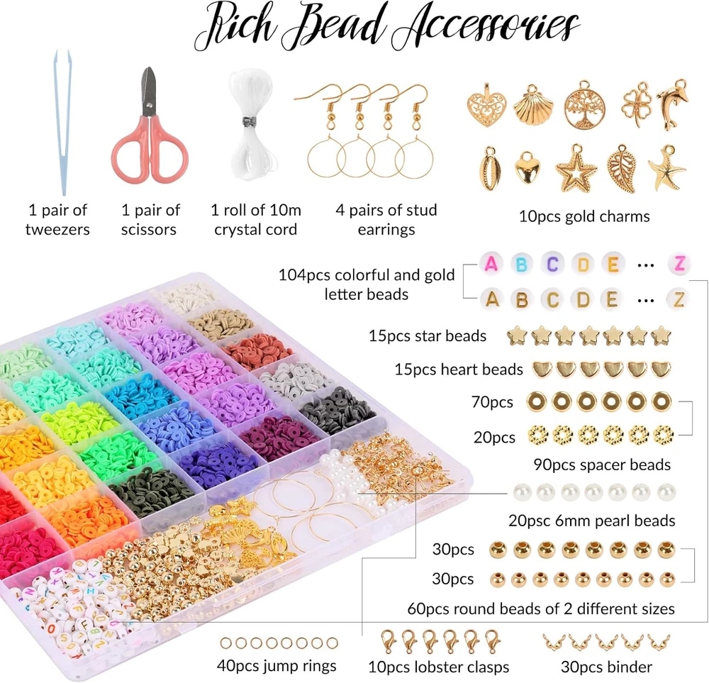 Store New Arrivals Add to Favorite View Feedback Contact Fast deliveries to the customer's home Quality customer service John Make the customers happy! 8200Pcs Clay Beads Bracelet Making Kit, 30 Colors Flat Preppy Beads for Friendship Bracelets, Polymer Heishi Beads with Charms for Jewelry Making, Holiday Crafts Gift for Teen Girls Adults Description PERFECT BRACELET MAKING KIT: Package includes approx. 7800 clay beads and 400 gold-tone decorative accessories (including colorful and gold letter beads, star beads, heart beads, spacer beads, jump rings, lobster clasps, round beads of 2 different sizes, 6mm pearl beads, gold charms, 1 pair of tweezers, 1 roll of 10m crystal cord, 1 pair of scissors, etc.), with a wide variety of accessories to meet your different needs of bracelet making. QUALITY COMBINATION: Clay beads are made of polymer clay. Each bead is unbreakable, with uniform size (6mm diameter, 2mm hole diameter), very easy to pierce. We optimized and upgraded the packaging of the product to provide you with 30 different color choices, including the current popular gradient rainbow colors as well as some dark colors, which can be used to make both beautiful colorful bracelets and elegant light-colored bracelets, match as you like. CREATIVE HANDMADE PRODUCTS: This clay beads kit can be used to make bracelets, necklaces, earrings, pendants and more, you can match with other accessories and release your creativity to make beautiful jewelry. This is especially great for kids, they can feel the fun of making handicrafts. PERFECT FOR GIFTING: This friendship bracelet making kit is perfect as a gift for craft lovers, suitable for children over 6 years old as well as adults. It is good for birthdays, Valentine's Day, Thanksgiving, Christmas and all kinds of festivals, the gold accessories can make the jewelry more fashionable, enjoy a happy leisure time with your kids or partners and make your own special friendship bracelets. WARM TIPS: Clay beads are sliced by machine, so there may be some unevenness in the production process, but we try our best to screen to ensure uniform thickness. If you encounter any dissatisfaction, you can leave your feedback and we will make sure that your experience can reach full marks. Thank you for choosing Quefe. Quefe 8200pcs clay beads bracelet making kit for jewelry making, holiday crafts gift for teen girls and adults. This friendship bracelet making kit is perfect as a gift for craft lovers, suitable for children over 6 years old as well as adults. It is ideal for birthdays, Valentine's Day, Thanksgiving, Christmas and all kinds of festivals, the gold accessories can make the jewelry more fashionable, enjoy a happy leisure time with your kids or partners and make your own special friendship bracelets. Item model number 24411445 Item dimensions L x W x H 0.03 x 0.03 x 0.03 inches Age Range (Description) Adult Color 30 colors Included Components 7800 clay beads and 400 gold-tone decorative accessories (including colorful and gold letter beads, star beads, heart beads, spacer beads, jump rings, lobster clasps, round beads of 2 different sizes, 6mm pearl beads, gold charms, 1 pair of tweezers, 1 roll of 10m crystal cord, 1 pair of scissors, etc.) Material Polymer Clay Country of Origin China Style Custom Item Weight 15.5 ounces Theme clay beads Model Name Clay Beads Seasons All Seasons Art Craft Kit Type Bracelet Making Number of Pieces 8200 Special Feature bracelet making kit, gold-tone decorative accessories, 30 colors option, polymer clay material Product Dimensions 0.03 x 0.03 x 0.03 inches ABOUT US We offer the best prices around on high quality products. Our E-store includes media such as books, movies, music and games while offering electronics, toys, sporting apparel, clothing, tools, general home, garden items and more. SHIPPING We are always working hard to ensure your package arrives as soon as possible. Please understand that some factors like weather, high postal traffic, and the performance of shipping companies are outside of our control. We offer free shipping to the lower 48 states and ship within 2 business days of payment, usually sooner. We do not accept P.O. Boxes. Please provide a physical address. For shipping outside of the continental USA, we only use eBay's Global Shipping Program. The item is shipped to KY and then sent to the rest of the world. International customers are responsible for all duties and taxes. Continue to 'check out' to calculate costs for shipping the item to your country. Messages regarding eBay's Global Shipping Program MUST be directed at eBay EXCLUSIVELY. RETURNS We offer a 30-Day Return Policy on items in which you are not completely satisfied with. You have the option of a full-refund or an exchange of the item. No returns are available on items shipped outside of the USA PAYMENT We accept PayPal. CONTACT US This page content is yet to come Please ad us to your favorite seller and visit again later Thank You CUSTOMER SATISFACTION We try our very best to make sure every customer is completely satisfied. If there's a problem, message us! We're happy to help. WE ACCEPT