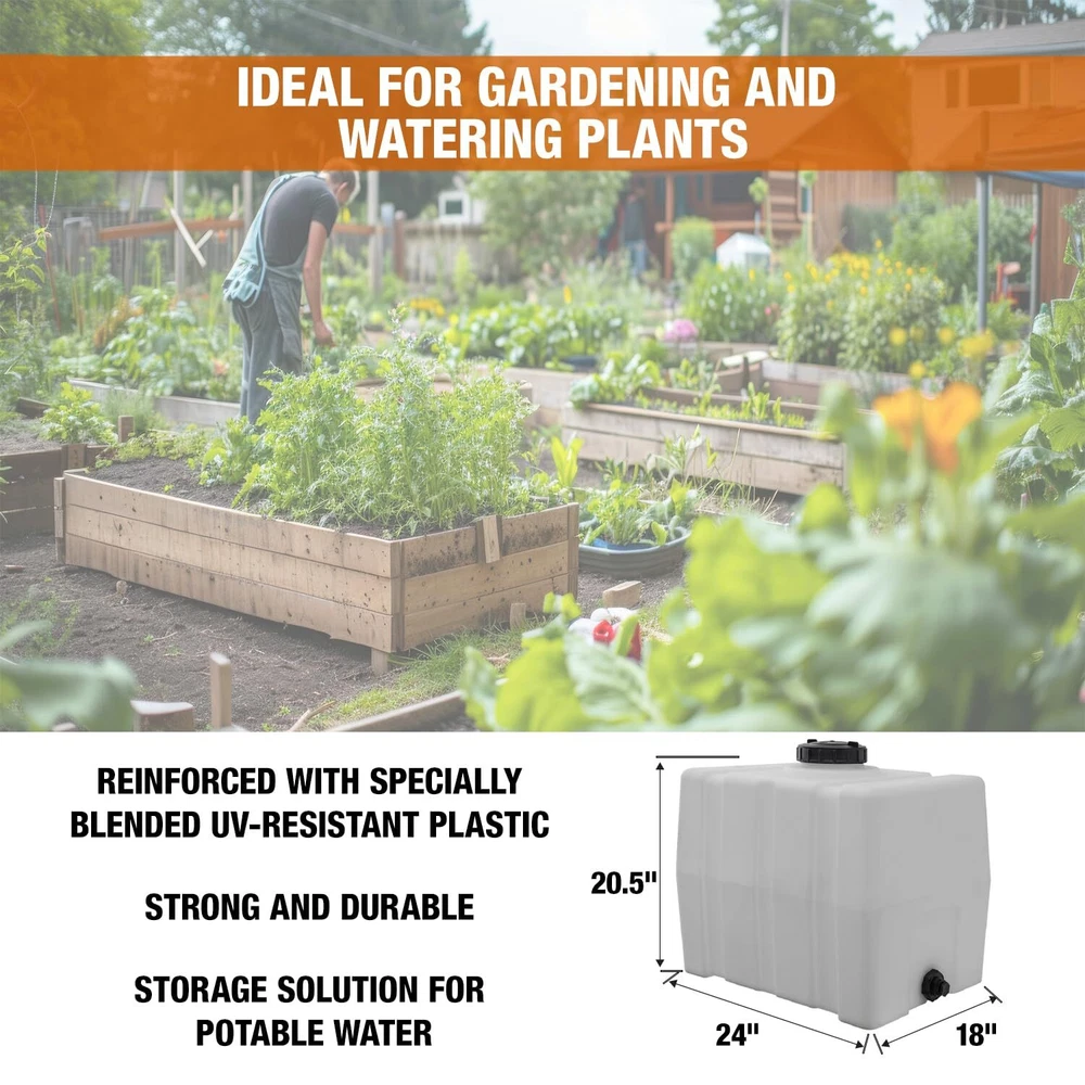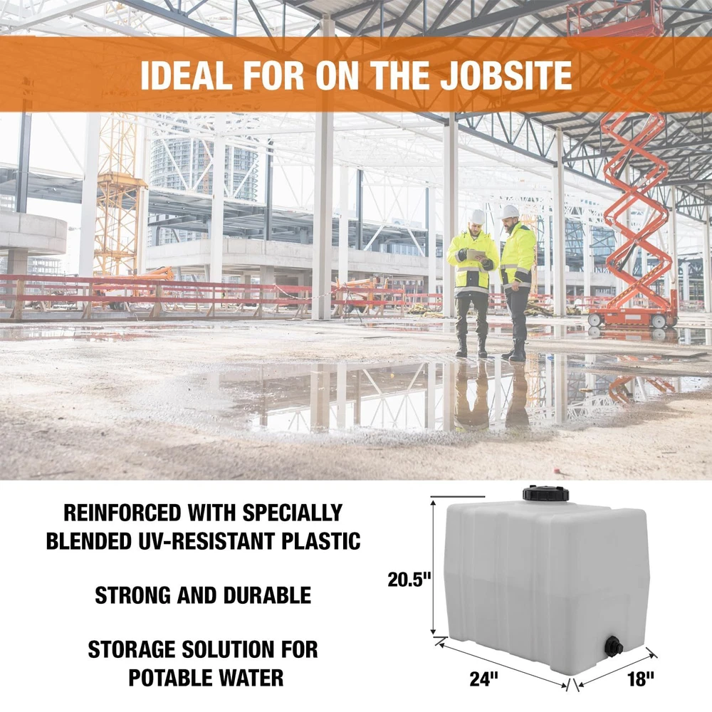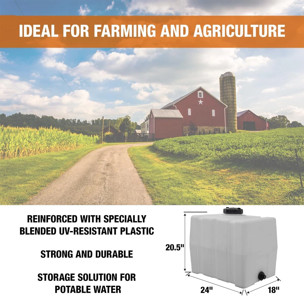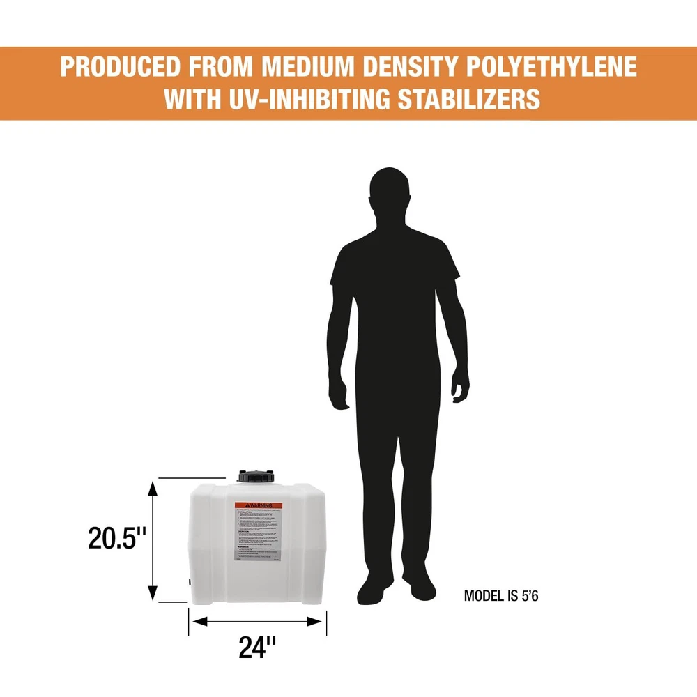 by Buyers Products polyethylene storage tanks are designed for convenient dispensing and storage of chemicals, excluding flammable hydrocarbons. Approved for potable water, agricultural chemicals, industrial chemicals, and other non-flammable liquids. Tank is not intended for fuel storage 30 gallon capacity with 5-1/2" lid (5" diameter hole), 3/4" NPT outlet for water and other non-flammable liquids Thick walled, heavy-duty design Molded-in graduation marks in gallons & liters Translucent polyethylene material for easy visibility of water Molded-in channels for saddle straps