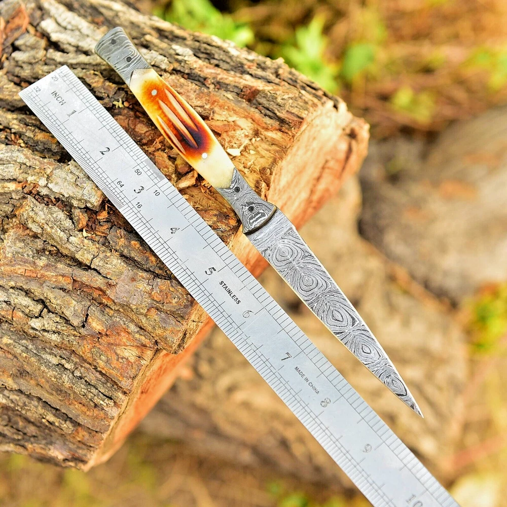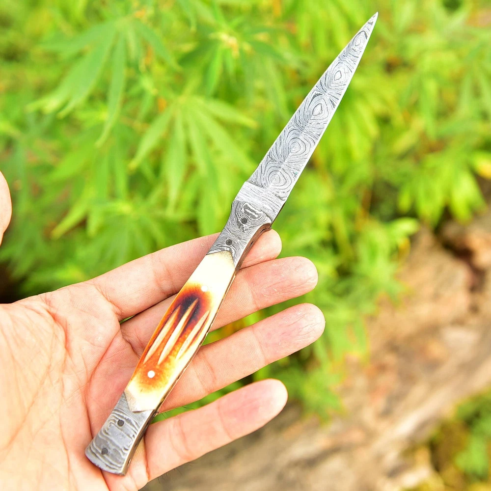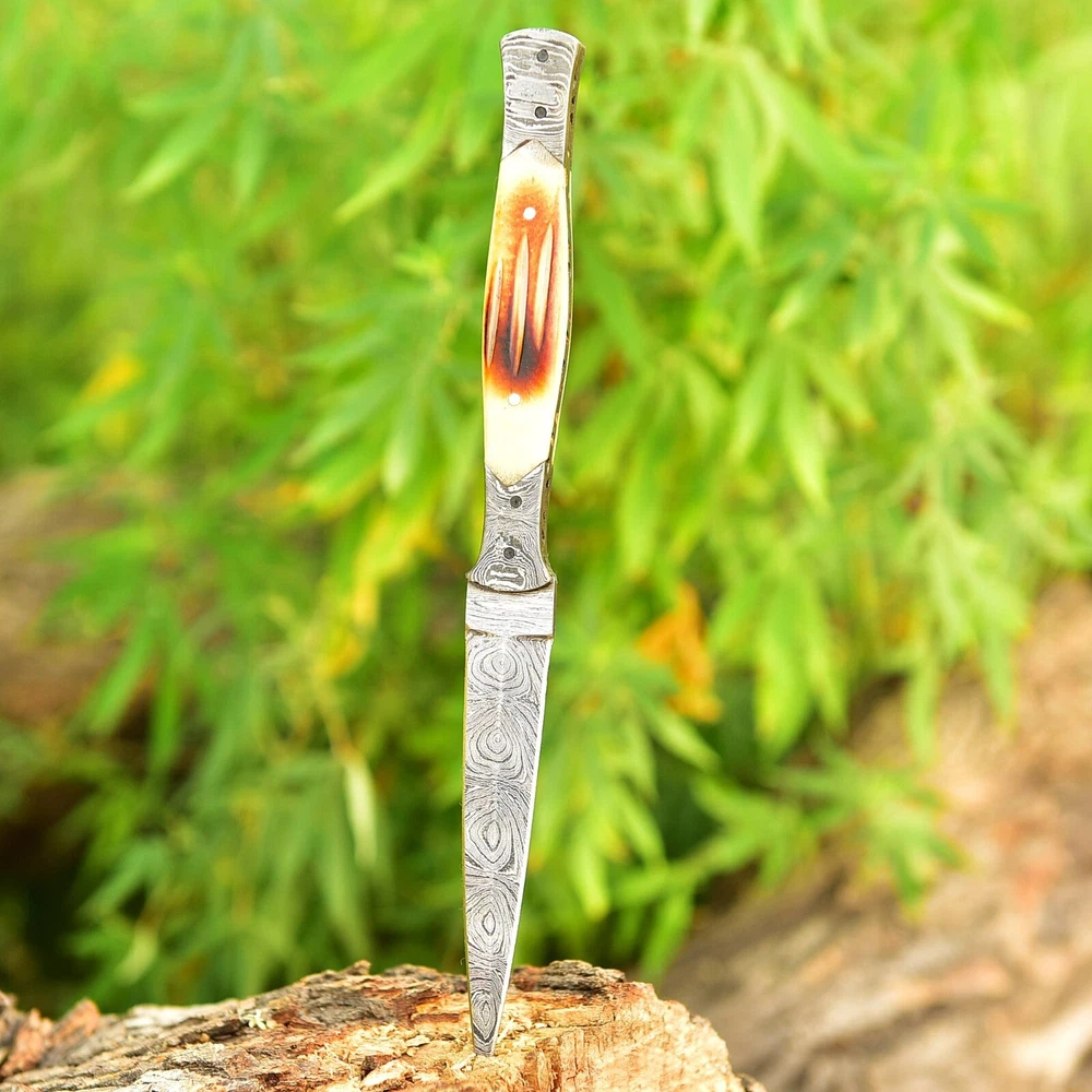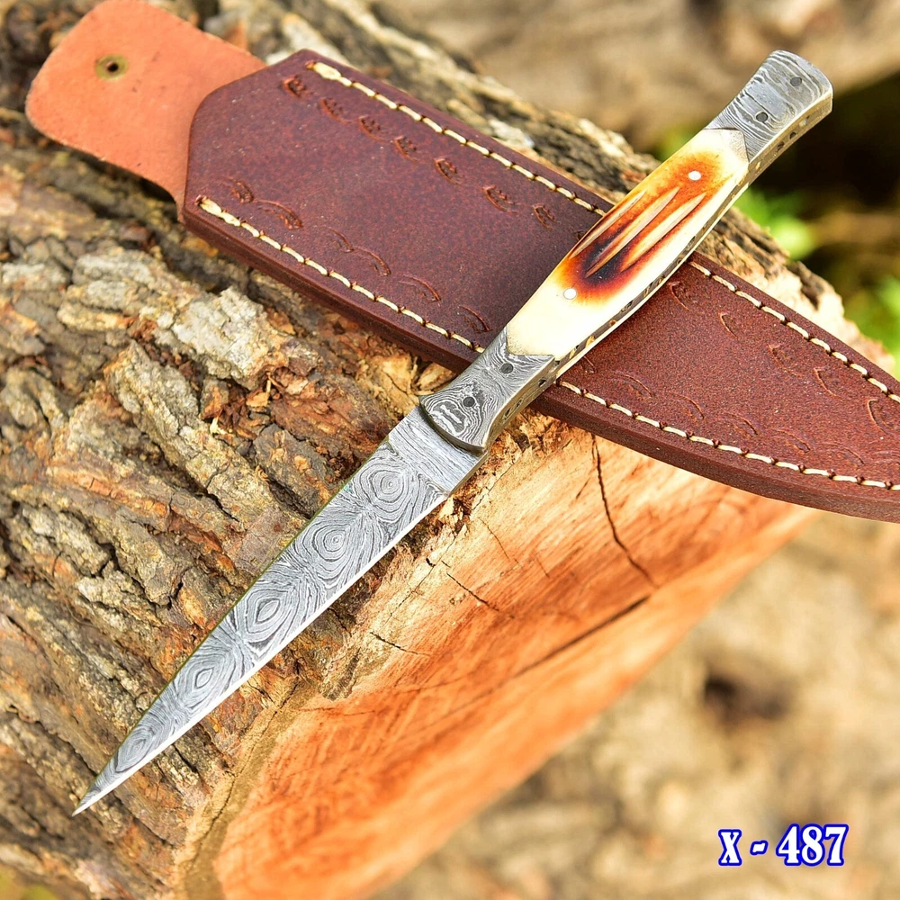 Introducing an 8.5-inch dagger with a double-edged blade made of high-quality Damascus steel. This original, ambidextrous throwing sports knife comes with a full tang and a handle made of CAMEL BONE. The blade material and cutting edge are sure to impress, making it perfect for collectors or anyone in need of a reliable knife. The color of the knife is a striking combination of blue, black, silver, and golden hues that add sophistication to the design. This knife is an original from the United States and belongs to the Knives, Swords & Blades, and collectibles categories. The brand, Damascus Knives, is well known for producing high-quality knives that are both durable and beautiful. OVERALL LENGTH : 8.5' INCH BLADE 4' INCH HANDLE 4.5' INCH WITH GENUINE LEATHER SHEATH FORGED STEEL 512 LAYERS