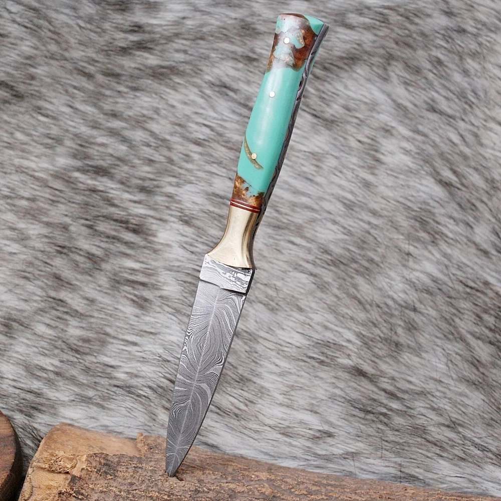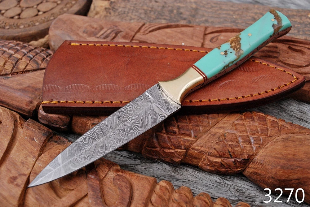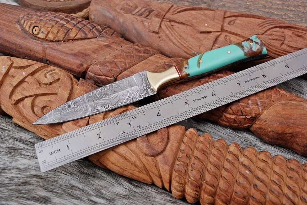 8.5-inch dagger with a double-edged blade made of high-quality Damascus steel. This original, ambidextrous throwing sports knife comes with a full tang and a handle made of resin. The blade material and cutting edge are sure to impress, making it perfect for collectors or anyone in need of a reliable knife. The color of the knife is a striking combination of blue, black, silver, and golden hues that add sophistication to the design. This knife is an original from the United States and belongs to the Knives, Swords & Blades, and collectibles categories. The brand, Damascus Knives, is well known for producing high-quality knives that are both durable and beautiful. OVERALL LENGTH : 8.5' INCH BLADE 4' INCH HANDLE 4.5' INCH WITH GENUINE LEATHER SHEATH FORGED STEEL 512 LAYERS