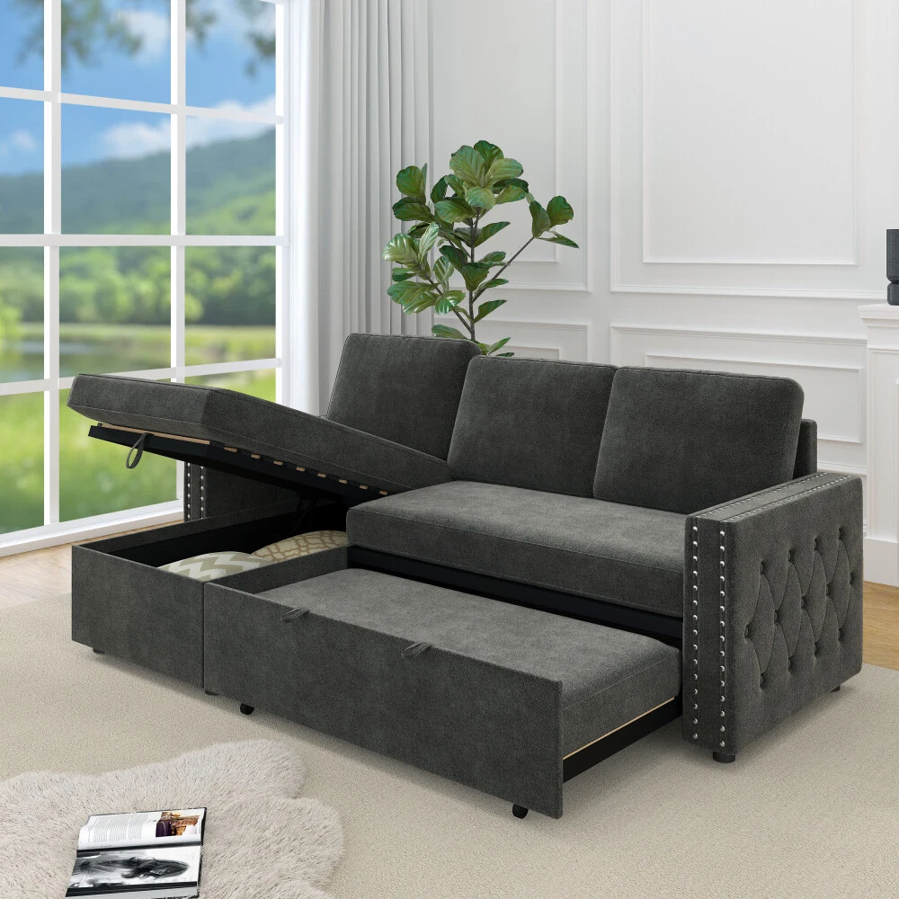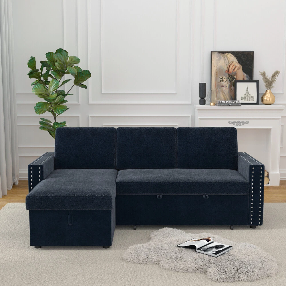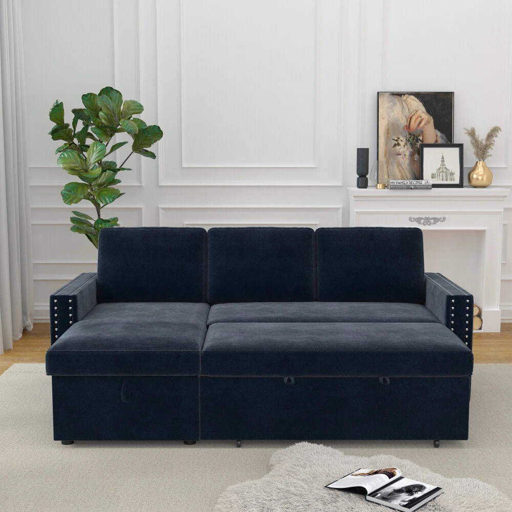 This sleeper sofa is a game-changer! The pull-out bed is super sturdy and transforms effortlessly, making it perfect for guests. I love the spacious storage chaise—great for keeping blankets and pillows neatly tucked away. The cushions are incredibly comfortable, with just the right support for lounging or sleeping. The stylish design with copper nail accents adds a nice touch to any room. It’s durable, functional, and looks fantastic—definitely worth every penny!
