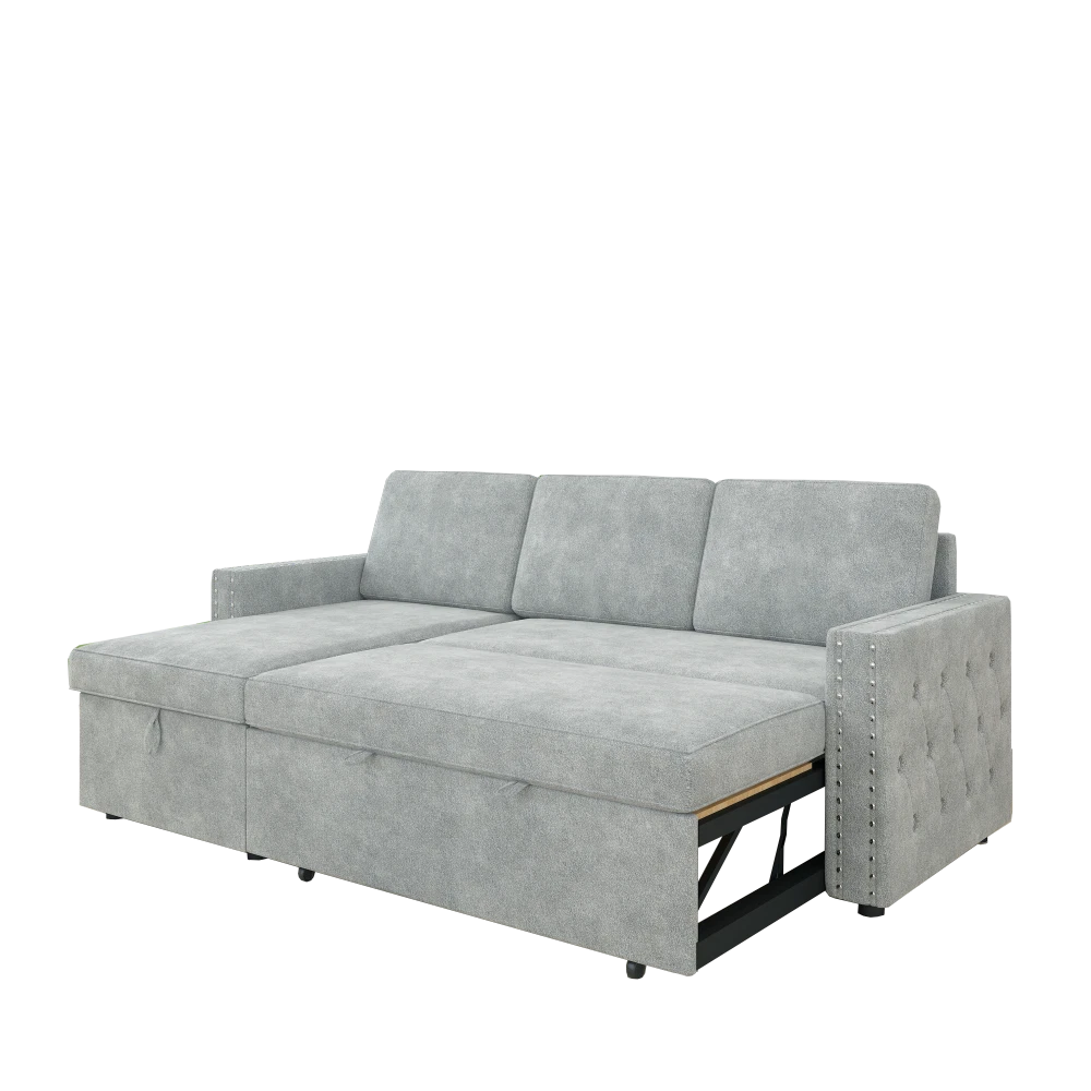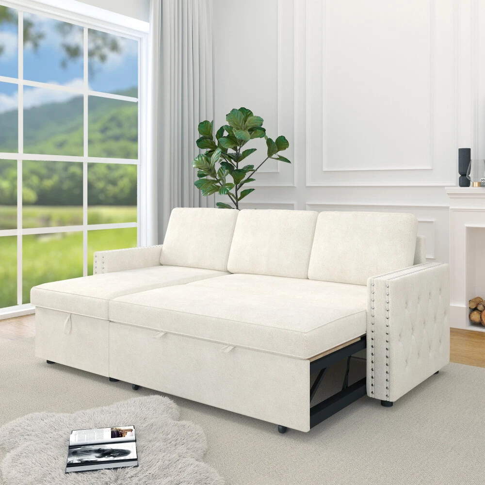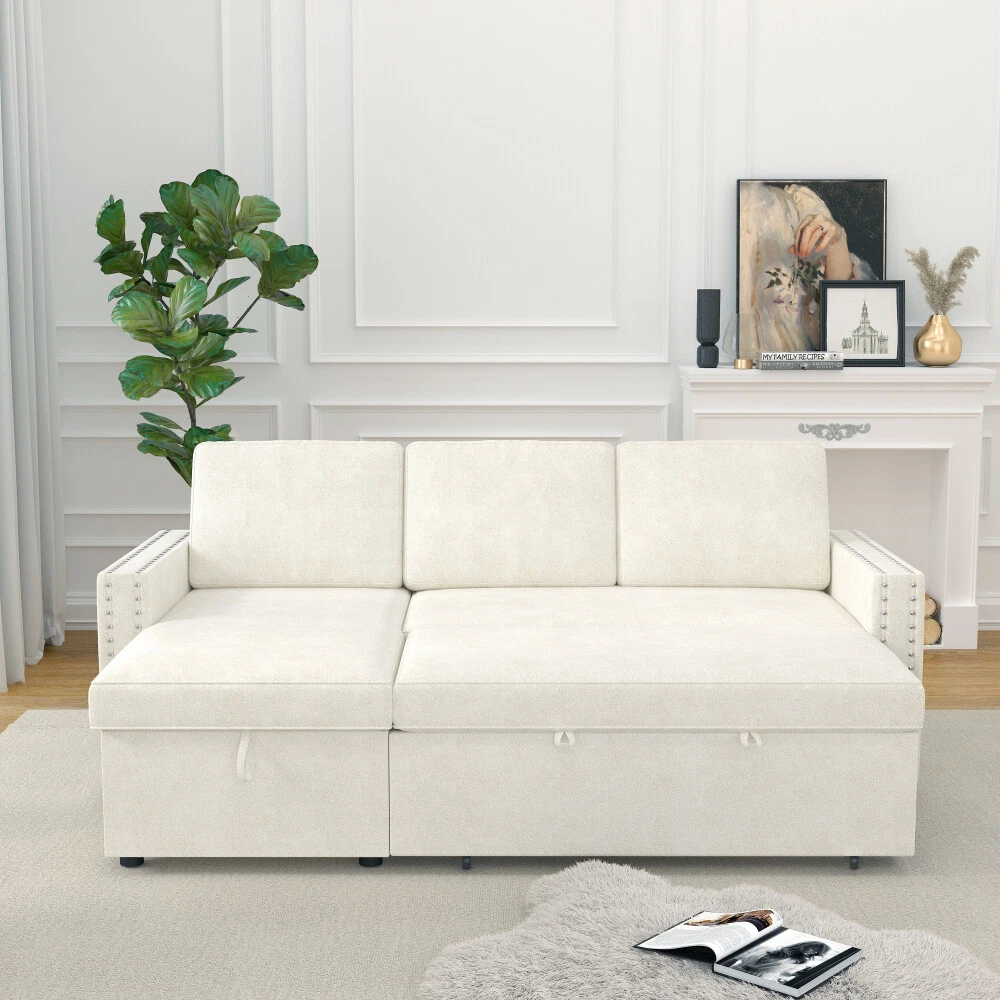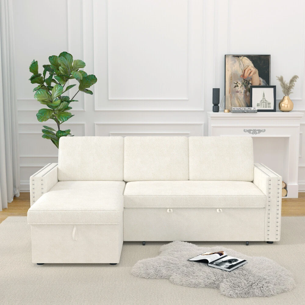 This sleeper sofa is a game-changer! The pull-out bed is super sturdy and transforms effortlessly, making it perfect for guests. I love the spacious storage chaise—great for keeping blankets and pillows neatly tucked away. The cushions are incredibly comfortable, with just the right support for lounging or sleeping. The stylish design with copper nail accents adds a nice touch to any room. It’s durable, functional, and looks fantastic—definitely worth every penny!