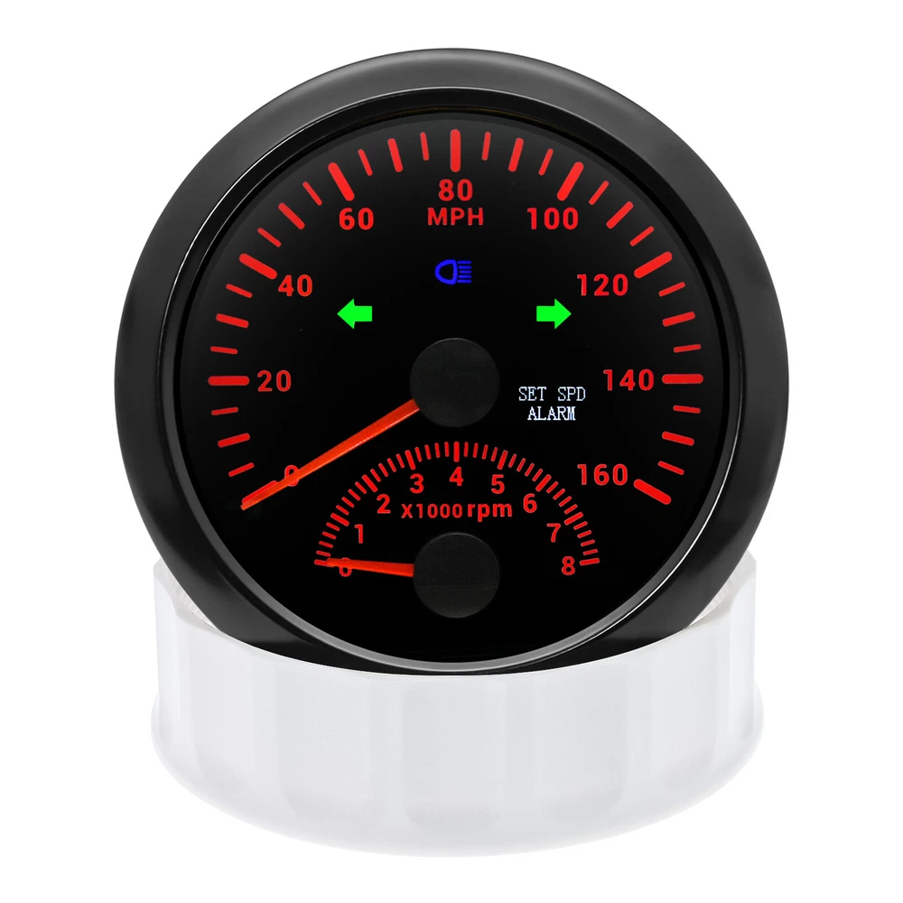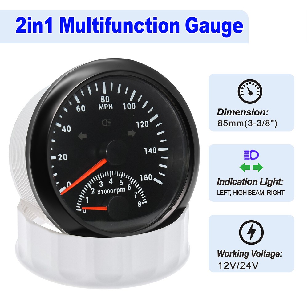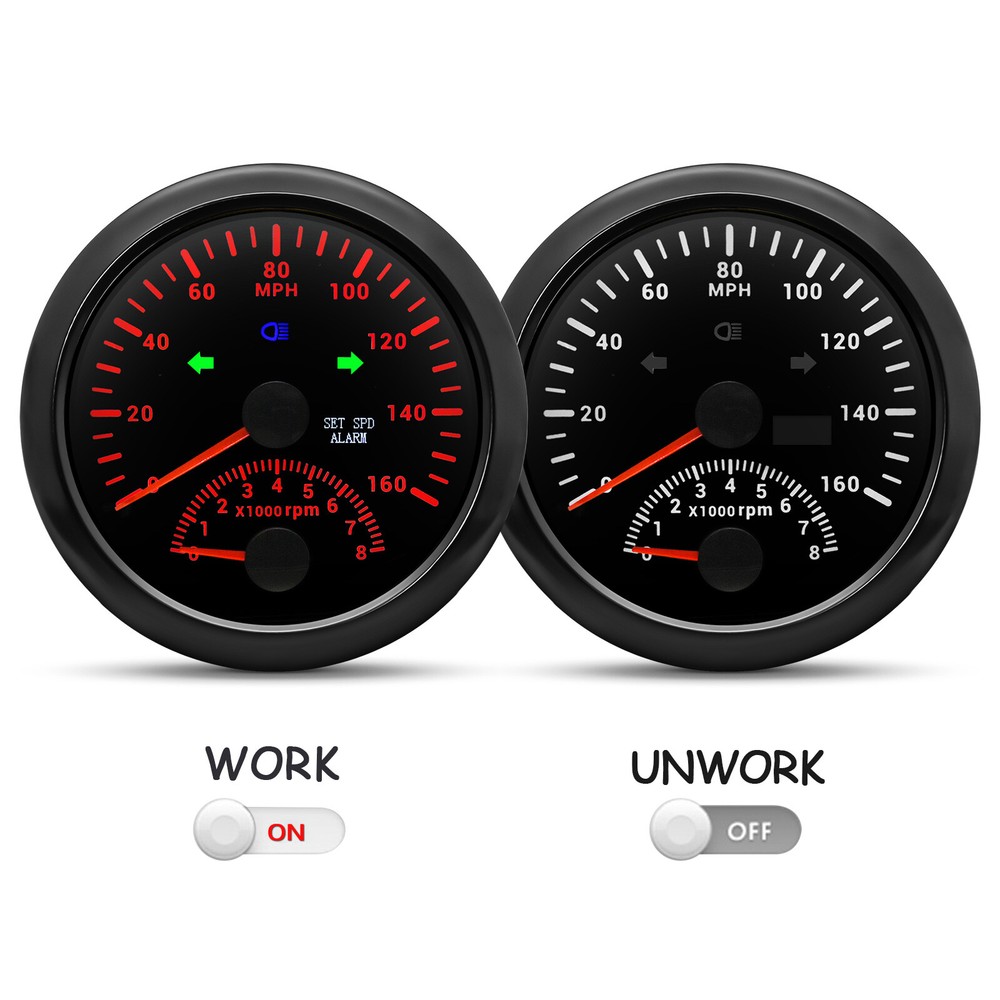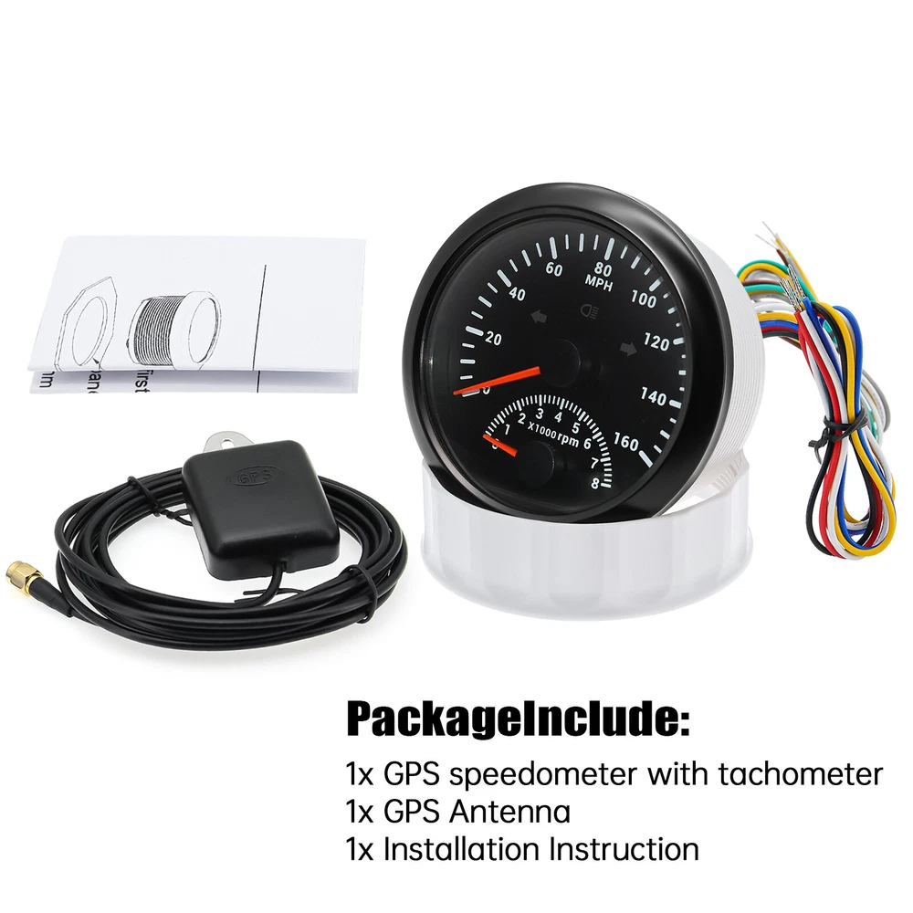2 Gauge Set 85MM GPS Speedometer 0-160MPH & 4IN 1 Fuel Water Temp Oil Press Volt 2 Gauge Set 85mm GPS Speedometer 0-160MPH with 85mm Fuel Level Water Temp Oil Pressure Volt Features: Suitable for all vehicles and off-road vehicles The signal comes directly from the satellite signal receiver(GPS Antenna), don't need other speed sensor. The gauge has the advantages of high precision, quick location confirmation and short start up time. IP67 waterproof and dustproof grade Reverse polarity protection and anti-fogging performance Stepper motors used for full range of stepping gauges, great feature with its less power consumption, longer life, higher precision, etc. Most importantly, the gauge is easy to setup, and can be used in all vehicles, boats and off-road vehicles. Speedometer Specifications: Application: Universal fit for Motorcycle/ Boat/Truck/Bus/Car Electronic Speedometer (stepper motor) No Mechanic Sensor, get speed signal from GPS Speed ≠0 and show accurate speed in tunnel with the help of accelerometer Total Mileage Adjustable GPS Blind Area Odometer Compensation OverSpeed Buzzer Alarm (Value Adjustable) Indication Light (Left, Right and High Beam Installation Diameter: 85mm (3 3/8") Speed Range: 0~160MPH RPM Range : 0~8000RPM Mileage Range: 0-99999.9miles Working Voltage: 12V/24V Working temperatures: - 40 to 85°C Protection rank: IP67 Waterproof Reverse polarity protection and anti-fogging performance 4 IN 1 Gauge Technical Data: Fixing dimension: 85mm Indicating Range: Oil press. meter: 0-150PSI Water temp. meter: 100-250℉ Fuel level meter: 0-190ohms/240-33ohms, empty-full; The signal can be adjusted Voltmeter: 8-16V Working Voltage: 12V Input Signal: 10-184ohms for 0-150PSIoil pressure meter; 0-190ohms for fuel level meter;(Default 0-190ohms, can adjust to 240-33ohms) 8-16V voltage meter; Input Signal 320-22ohms for water temperature meter Red backlight Protection grade is IP67, the whole body is completely waterproof; Excellent antifogging function; 316 Stainless steel bezel with curved glass; Convenient Installation by multi-plug socket connecting way; Accessories: matched with connectors, Installation Instruction Package Included: 1 x 85mm 4 in 1 Multifunctional Gauge 1 x 85mm GPS Speedometer Gauge 1 x GPS Antenna 2 x Cable 2 x Installation Instruction