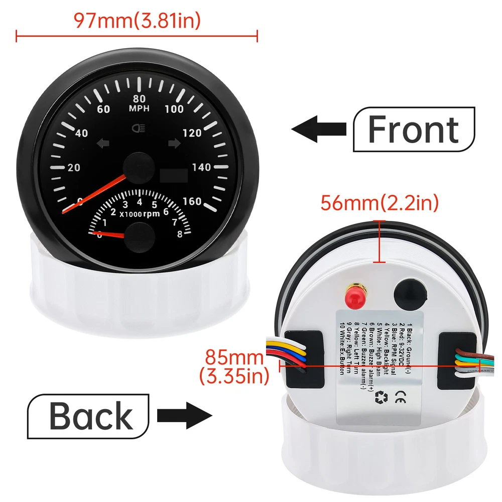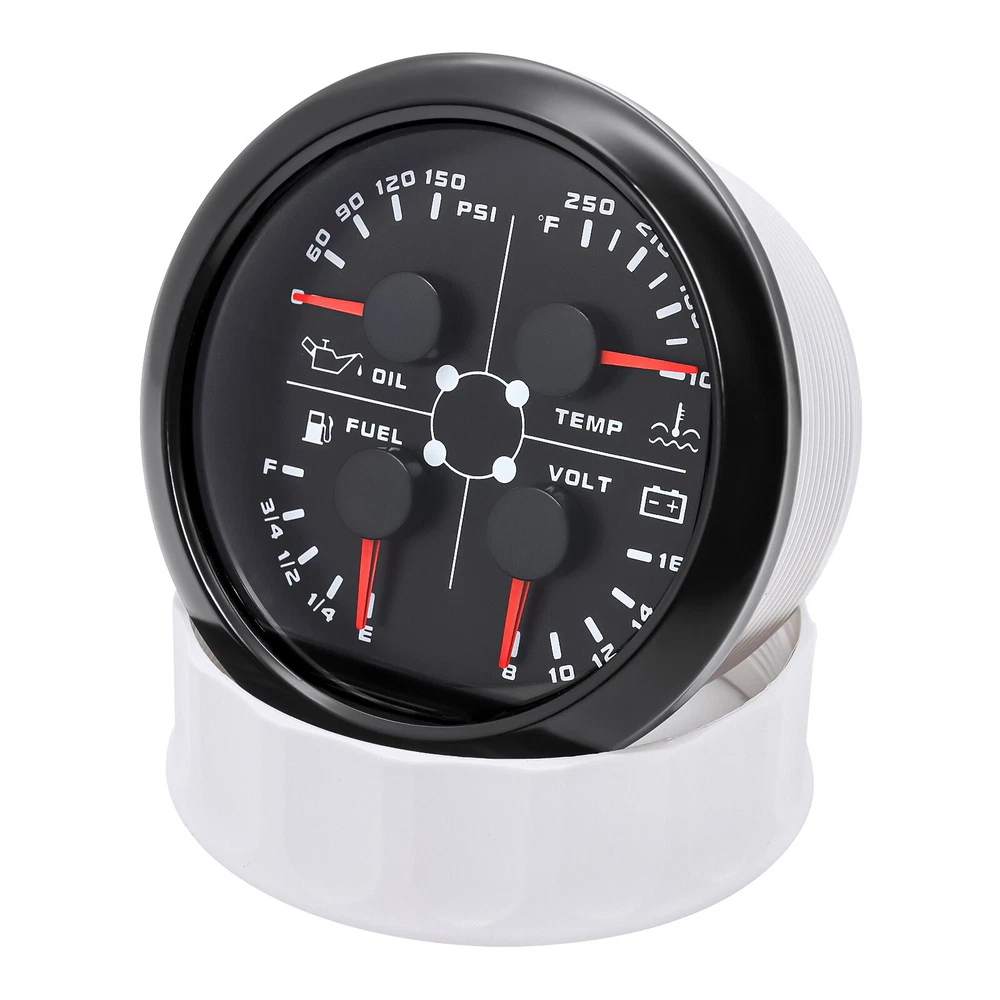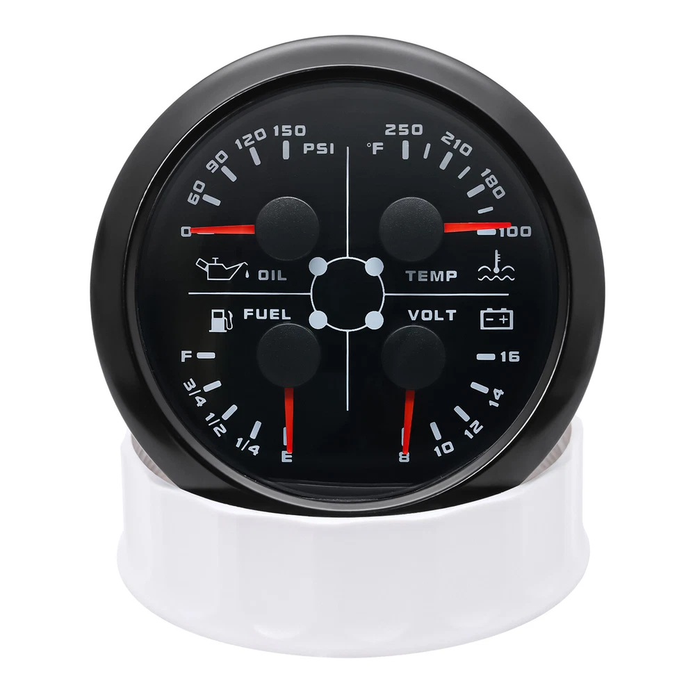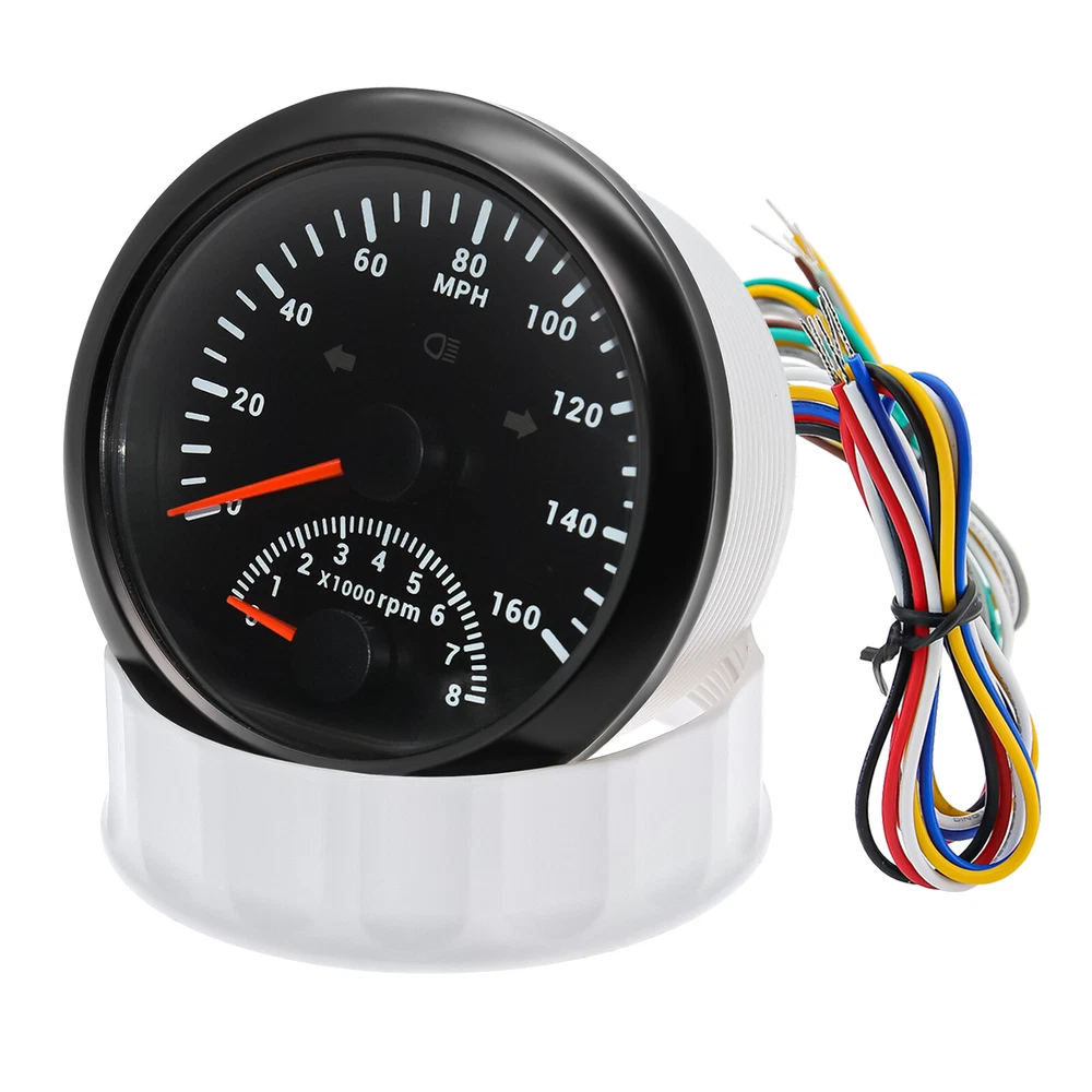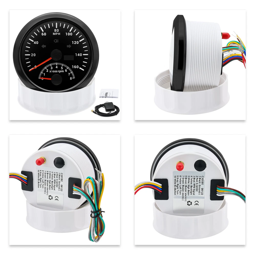 2 Gauge Set 85MM GPS Speedometer 0-160MPH & 4IN 1 Fuel Water Temp Oil Press Volt 2 Gauge Set 85mm GPS Speedometer 0-160MPH with 85mm Fuel Level Water Temp Oil Pressure Volt Features: Suitable for all vehicles and off-road vehicles The signal comes directly from the satellite signal receiver(GPS Antenna), don't need other speed sensor. The gauge has the advantages of high precision, quick location confirmation and short start up time. IP67 waterproof and dustproof grade Reverse polarity protection and anti-fogging performance Stepper motors used for full range of stepping gauges, great feature with its less power consumption, longer life, higher precision, etc. Most importantly, the gauge is easy to setup, and can be used in all vehicles, boats and off-road vehicles. Speedometer Specifications: Application: Universal fit for Motorcycle/ Boat/Truck/Bus/Car Electronic Speedometer (stepper motor) No Mechanic Sensor, get speed signal from GPS Speed ≠0 and show accurate speed in tunnel with the help of accelerometer Total Mileage Adjustable GPS Blind Area Odometer Compensation OverSpeed Buzzer Alarm (Value Adjustable) Indication Light (Left, Right and High Beam Installation Diameter: 85mm (3 3/8") Speed Range: 0~160MPH RPM Range : 0~8000RPM Mileage Range: 0-99999.9miles Working Voltage: 12V/24V Working temperatures: - 40 to 85°C Protection rank: IP67 Waterproof Reverse polarity protection and anti-fogging performance 4 IN 1 Gauge Technical Data: Fixing dimension: 85mm Indicating Range: Oil press. meter: 0-150PSI Water temp. meter: 100-250℉ Fuel level meter: 0-190ohms/240-33ohms, empty-full; The signal can be adjusted Voltmeter: 8-16V Working Voltage: 12V Input Signal: 10-184ohms for 0-150PSIoil pressure meter; 0-190ohms for fuel level meter;(Default 0-190ohms, can adjust to 240-33ohms) 8-16V voltage meter; Input Signal 320-22ohms for water temperature meter Red backlight Protection grade is IP67, the whole body is completely waterproof; Excellent antifogging function; 316 Stainless steel bezel with curved glass; Convenient Installation by multi-plug socket connecting way; Accessories: matched with connectors, Installation Instruction Package Included: 1 x 85mm 4 in 1 Multifunctional Gauge 1 x 85mm GPS Speedometer Gauge 1 x GPS Antenna 2 x Cable 2 x Installation Instruction