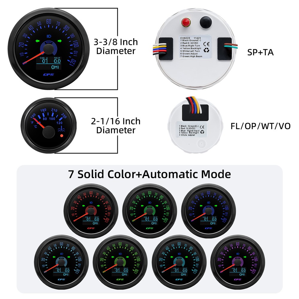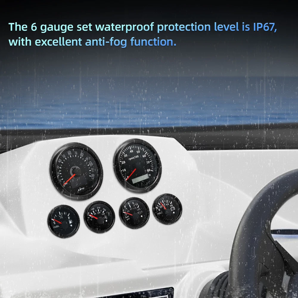 85MM GPS Speedometer 0-120MPH Tachometer &52mm Fuel/Oil/Temp/Volt with Senders 6 Gauge SET 85MM Black GPS Speedometer 120MPH&Tacho & 52mm Fuel/Oil/Temp/Volt with Sensor Features: Suitable for all cars,tractors,vans,vessels,boats,yachts,etc. The signal comes directly from the satellite signal receiver (GPS Speed Sensor) The gauge has the advantages of high precision, quick location confirmation and short start up time. IP67 waterproof and dustproof grade. Stepper motors used for full range of stepping gauges, great feature with its less power consumption, longer life, higher precision, etc. With curved glass (with anti-fogging function). With ultra-wide working voltage design( long-term operating voltage: 9-32V,Maximum up to: 36V (≤ 1 min)). Technical Data: Fixing dimension:85mm(3-3/8 inches) Indicating Range:0-120MPH Item:Black Working Voltage:9-32VDC(12VDC/24VDC) 7 Backlight color:red,green,blue,white,yellow,cyan,purple Tachometer Engine hours: 0.0-99999.9H Backlight :7 Color backlight Indicating Range: 0~8000 RPM Signal:Pulse For Tachometer, you can substitute for different unit, please contact us before / after purchase or note on the order. Tachometer: 0-3000rpm/0-4000RPM/6000RPM/7000RPM Volt Gauge Sizes:52 mm (2-1/16") Measuring Range:8-16 (V) Backlight: 7 Colors Fuel Level Gauge Sizes:52 mm (2-1/16") Measuring Range:Empty-Full Resistance: 240 (E)-33 (F) ohms Backlight:7 Colors Water Temperature Gauge Install diameter: Φ52mm Indication range: 0~120℃/100-250℉ Input signal: 287.4~22.4 ohm Storage temperature: -40~+85 Backlight: 7 Colors Oil Pressure Gauge Install diameter:Φ52mm or 2-1/16" Indication range:0~10bar/0-145 PSI Operating temperature:-30~+75 Storage temperature:-40~+85 Backlight: 7 Colors Package Includes: 1X 85MM Digital GPS Speedometer Gauge 1X GPS Antenna 1X Tachometer 1X Voltmeter 1X Fuel level gauge 1X Water temp gauge 1X Oil pressure gauge 1x Fuel level Sending Units (240-33ohms) 1X Oil pressure Sensor (1/8NPT) 1X water temp Sensor (1/8NPT) 1X Tachometer Sensor(M16*1.5) Installation Instruction NOTES: The Sending units will be included