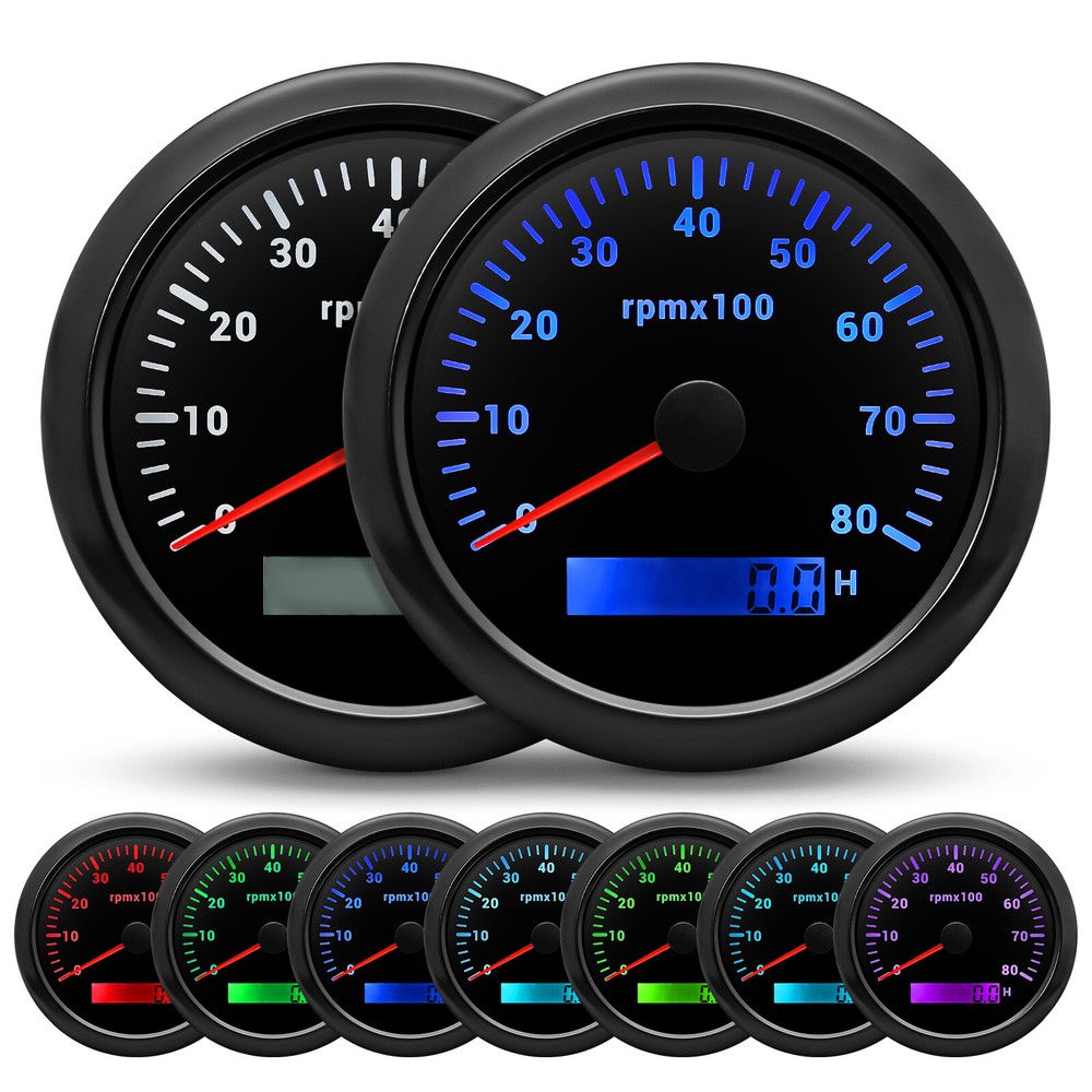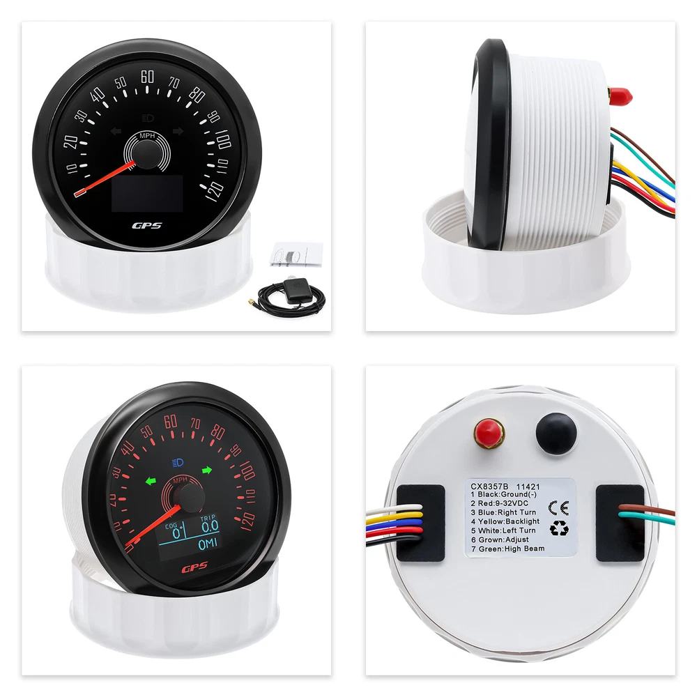 85MM GPS Speedometer 0-120MPH Tacho 0-8000RPM & 52mm Fuel/Oil Pressure/Temp/Volt 6 Gauge Set 8 5MM GPS Speedometer 0-120MPH Tacho 8000RPM& 52mm Fuel/Oil Pressure/Temp/Volt Feature: High-brightness LED backlight. 316 stainless steel for long-term use even in acid-base,humid environment. IP67 waterproof and dust-proof grade. With curved glass( with anti-fog function). Suitable for all kinds of vehicle modification. Using stepper motor drive pointer, accurate display of the engine speed, and with the LCD display clear display mileage. Gauges have many kinds backlight color (red,yellow,orange,green,blue,purple,white),customers can adjust any color that you like. Product Detail GPS Speedometer: GPS Speedometer: 120MPH Total mileage: (can't be adjusted ) TRIP:Short mileage(can be adjusted ) 1. Save when power off 2. Long press the button to reset COG: Course Over Ground Backlight: 7 Colors Backlight OLED LCD screen: working temperature -40℃~+80℃ Tac hometer High Precision Size:85mm Signal :Pulse Working voltage:9-32VDC Working current:<120mA Backlight:7 Color backlight Engine hours:0.0-99999.9H Working temperature:-30-70℃ Storage temperature:-40-85℃ Indicating Range:0-8000RPM Waterproof and dustproof grade IP67. Functions:current tacho/RPM and hour Operation mode: LCD display, stepper motor Tachometer fit for Car/Truck/ Boat /Diesel Generator Engine/Gasoline Engine Fuel Level Gauge Sizes:52 mm (2-1/16") Measuring Range:Empty-Full Resistance:240 (E)-33 (F) ohms Backlight:7 Colors Water Temperature Gauge Install diameter:Φ52mm Indication range:0~120℃/30-250℉ Input signal: 287.4~22.4ohms Storage temperature:-40~+85℃ Backlight:7 Colors Oil Pressure Gauge Install diameter:Φ52mm or 2-1/16" Indication range:0~10bar/0-150 PSI Input signal: 10-184ohms Operating temperature:-30~+75℃ Storage temperature:-40~+85℃ Backlight: 7 Colors Volt Gauge Sizes:52 mm (2-1/16") Measuring Range: 8-16 (V) Backlight: 7 Colors Trim gauge 7 Color Backlight : Red (default)→green → blue → white →yellow→cyan →Purple →(automatic). Fixing dimension: 52mm(2'') Indicating Range: UP-DN Signal: 0-190ohms Working Voltage: 9-32V(12V/24V) Operation mode: LCD display, stepper motor Package Includes: 1X 85MM Digital GPS Speedometer Gauge 1X GPS Antenna 1X 85MM Tachometer 1X 52MM Fuel level gauge 1X 52MM Voltmeter 1X 52MM Water temp gauge 1X 52MM Oil pressure gauge 1X 52MM Trim Gauge 7X Installation Instruction