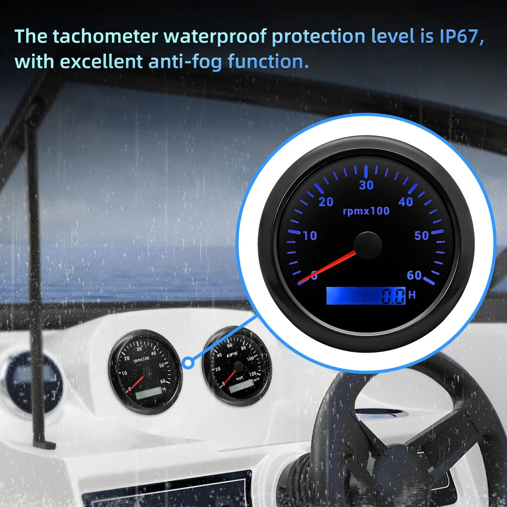 85MM GPS Speedometer 0-60MPH w/Tachometer & 52mm Fuel Water Oil Pressure Voltage 6 Gauge Set 85mm GPS Speedometer 0-60MPH Tachometer & 52mm Fuel Water Temp Oil Press Volt Gauge For Car Boat Feature: High-brightness LED backlight. 316 stainless steel for long-term use even in acid-base, humid environment. IP67 waterproof and dust-proof grade. With curved glass( with anti-fog function). Suitable for all kinds of vehicle modification. Using stepper motor drive pointer, accurate display of the engine speed, and with the LCD display clear display mileage. Gauges have many kinds backlight color (red,yellow,orange,green,blue,purple,white),customers can adjust any color that you like. GPS Speedometer Gauge Install Diameter: Φ85mm or 3-3/8" Signal: GPS Working Voltage: 9~32V DC Size: 12x8x12cm / 4.72x3.1x4.75 inch Indication Range: 0-60MPH Backlight:7 Colors Backlight Tachometer Install Diameter: Φ85mm or 3-3/8" Engine hours: 0.0-99999.9H Backlight :7 Color backlight Indicating Range: 0~6000 RPM Signal: Pulse For Tachometer, you can substitute for different unit, please contact us before / after purchase or note on the order. Tachometer: 0-3000rpm/0-4000RPM/6000RPM/7000RPM/8000RPM Fuel Level Gauge Sizes: 52 mm (2-1/16") Measuring Range: Empty - Full Resistance: 240 (E) - 33 (F) ohms Backlight: 7 Colors Water Temperature Gauge Install diameter: Φ52mm Indication range: 0~120℃/30-250℉ Input signal: 287.4~22.4 ohms Storage temperature: -40~+85℃ Backlight: 7 Colors Oil Pressure Gauge Install diameter:Φ52mm or 2-1/16" Indication range:0~10bar / 0-150 PSI Input signal: 10-184 ohms Operating temperature:-30~+75℃ Storage temperature:-40~+85℃ Backlight: 7 Colors Volt Gauge Sizes: 52 mm (2-1/16") Measuring Range: 8 - 16 (V) Backlight: 7 Colors Package Includes: 1X 85MM Digital GPS Speedometer Gauge 1X GPS Antenna 1X 85MM Tachometer 1X 52MM Fuel level gauge 1X 52MM Voltmeter 1X 52MM Water temp gauge 1X 52MM Oil Pressure gauge 6X Installation Instruction