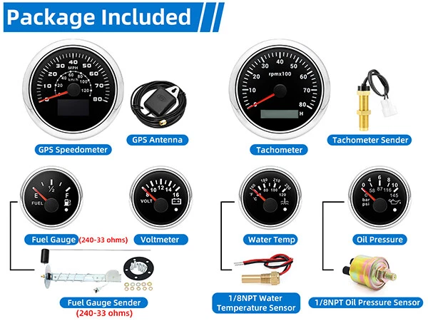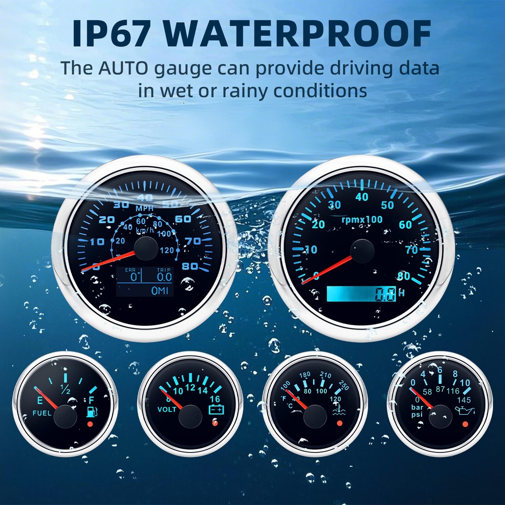 85MM GPS Speedometer 80MPH Tacho&52mm Fuel/Temp/Oil/Volt Gauge Set for Boat ATV 6 Gauge Set 85MM Car GPS Speedometer 80MPH/120KM/H&Tacho & 52MM Fuel/Oil/Temp/Volt with Sensor Feature: High-brightness LED backlight. 316 stainless steel for long-term use even in acid-base, humid environment. IP67 waterproof and dust-proof grade. With curved glass( with anti-fog function). Suitable for all kinds of vehicle modification. Using stepper motor drive pointer, accurate display of the engine speed, and with the LCD display clear display mileage. Gauges have many kinds backlight color (red,yellow,orange,green,blue,purple,white),customers can adjust any color that you like GPS Speedometer Gauge Install Diameter:Φ85mm or 3-3/8" Signal:GPS Working Voltage:9~32V DC Indication Range:0-80MPH 0-120Km/H Backlight:7 Colors Backlight Tachometer Install Diameter:Φ85mm or 3-3/8" Engine hours:0.0-99999.9H Backlight:7 Color backlight Indicating Range:0~8000 RPM Signal:Pulse Volt Gauge Sizes:52 mm (2-1/16") Measuring Range:8-16 (V) Backlight:7 Colors Fuel Level Gauge Sizes:52 mm (2-1/16") Measuring Range:Empty - Full Resistance: 240 (E)-33 (F) ohms Backlight:7 Colors Water Temperature Gauge Install diameter: Φ52mm Indication range: 0~120℃/100-250℉ Input signal: 287.4~22.4 ohm Storage temperature: -40~+85 Backlight: 7 Colors Oil Pressure Gauge Install diameter:Φ52mm or 2-1/16" Indication range:0~10bar/0-145 PSI Operating temperature:-30~+75 Storage temperature:-40~+85 Backlight: 7 Colors Package Includes: 1X 85MM Digital GPS Speedometer Gauge 1X GPS Antenna 1X 85MM Tachometer 1X 52MM Fuel Level gauge 1X 52MM Voltmeter 1X 52MM Water temp gauge 1X 52MM Oil Pressure gauge 6X Installation Instruction The sending units will be included