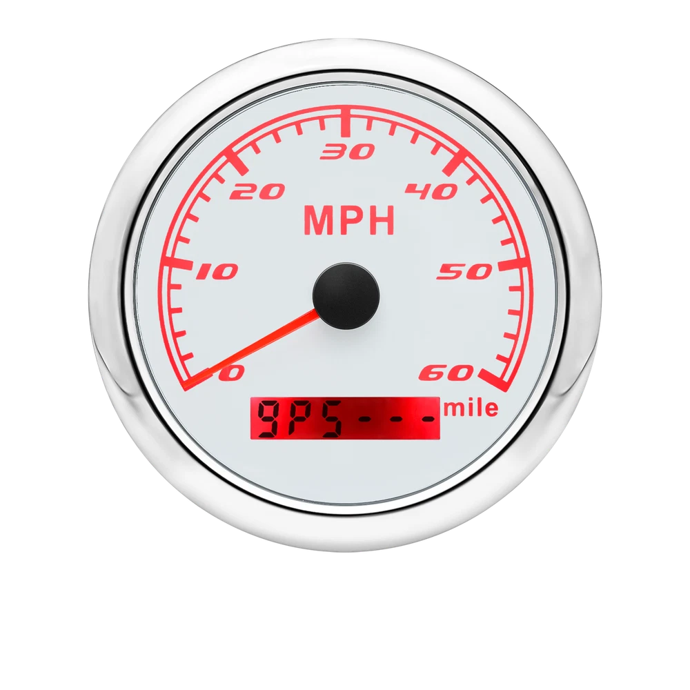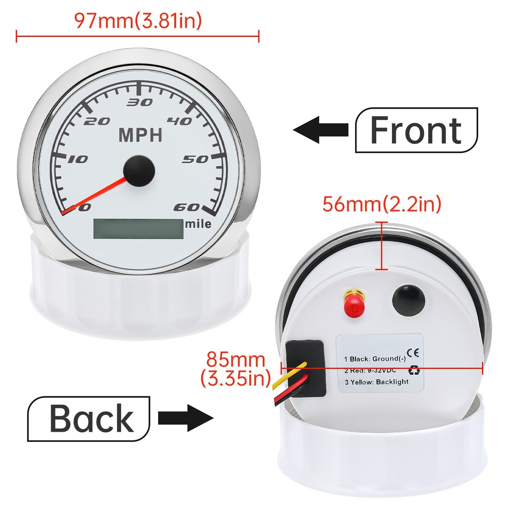 85MM GPS Speedometer 0-60MPH Odometer Gauge For Boat Car Truck ATV Motorcycle 85mm GPS Speedometer Gauge Odometer 0-60MPH 7 Colors LED for Car Boat Motorcycle Specifications: Dial: White Material: Stainless Steel 316L Bezel + Anti-fog Glass Install Diameter: Φ85mm or 3-3/8" Signal: GPS Working Voltage: 9~32V DC Working Current: ≤100mA Operating Temperature: -30℃ ~ 75℃ Storage Temperature: -40℃ ~ 85℃ Size: 12x8x12cm / 4.72x3.1x4.75 inch IP67 waterproof and dustproof grade Indication Range: 0-60 MPH Backlight:7 Colors Backligt Product Descriptions High-brightness LED backlight. 316 stainless steel for long-term use even in acid-base, humid environment. IP67 waterproof and dust-proof grade. With curved glass( with anti-fog function). Suitable for all kinds of vehicle modification. Using stepper motor drive pointer, accurate display of the engine speed, and with the LCD display clear display mileage. Gauges have many kinds backlight color (red,yellow,orange,green,blue,purple,white),customers can adjust any color that you like. Package Includes: 1X 85MM Digital GPS Speedometer Gauge 1X Instruction 1X GPS Antenna