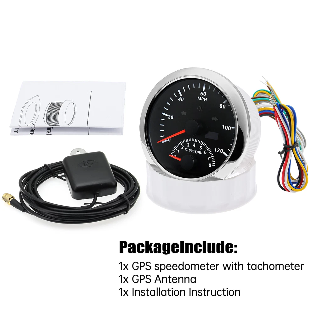 2 Gauge Set 85mm Boat GPS Speedometer 0-120MPH w/tacho & 85mm Fuel Oil Temp Volt 2 Gauge set 85mm Black GPS Speedometer 0-120MPH W/Tacho&4 IN 1 Gauge With Senders for Boat Car Features: The world's newest 4 in 1 multifunction gauge. Convenient Installation by multi-plug socket connecting way. The gauge has the advantages of high precision, quick location confirmation and short start up time. Most importantly, the gauge is easy to setup, and can be used in all vehicles, boats and off-road vehicles 4IN 1 Mulfifunctional gauge Technical Data: Fixing dimension:85mm Indicating Range:Oil press.meter:0-150PSI; Water temp. meter: 100-250℉ Fuel level meter:0-190ohms/240-33ohms,empty-full;(The signal can be adjusted) Voltmeter:8-16V Working Voltage:12V Backlight: Red Input Signal: 10-184ohms for 0-150psi oil pressure meter; 0-190ohms for fuel level meter;(Default 0-190ohms, can adjust to 240-33ohms) 8-16V voltage meter; Input Signal 287.4-22.4ohms for water temperature meter Red backlight Protection grade is IP67, the whole body is completely waterproof; Excellent antifogging function; 316 Stainless steel bezel with curved glass; Convenient Installation by multi-plug socket connecting way; Accessories: matched with connectors, Installation Instruction GPS Speedometer Specifications: Application:Universal fit for Motorcycle/ Boat/Truck/Bus/Car Electronic Speedometer (stepper motor) No Mechanic Sensor, get speed signal from GPS Speed≠0 and show accurate speed in tunnel with the help of accelerometer GPS Blind Area Odometer Compensation OverSpeed Buzzer Alarm (Value Adjustable) Indication Light (Left,Right and High Beam Installation Diameter: 85mm (3 3/8") Speed Range: 0-120MPH RPM Range : 0~8000RPM Mileage Range: 0-99999.9miles Working Voltage: 12V/24V Working temperatures: - 40 to 85°C Protection rank: IP67 Waterproof Reverse polarity protection and anti-fogging performance Package Included: 1 x 85mm 4 in 1 Multifunctional Gauge 1 x 85mm GPS Speedometer 1 x GPS Antenna 1 x Fuel Level Sensor 240-33ohms 1 x 1/8NPT Temp sensor 1 x 1/8NPT Pressure sensor 2 x Cable 2 x Installation Instruction