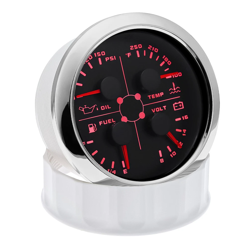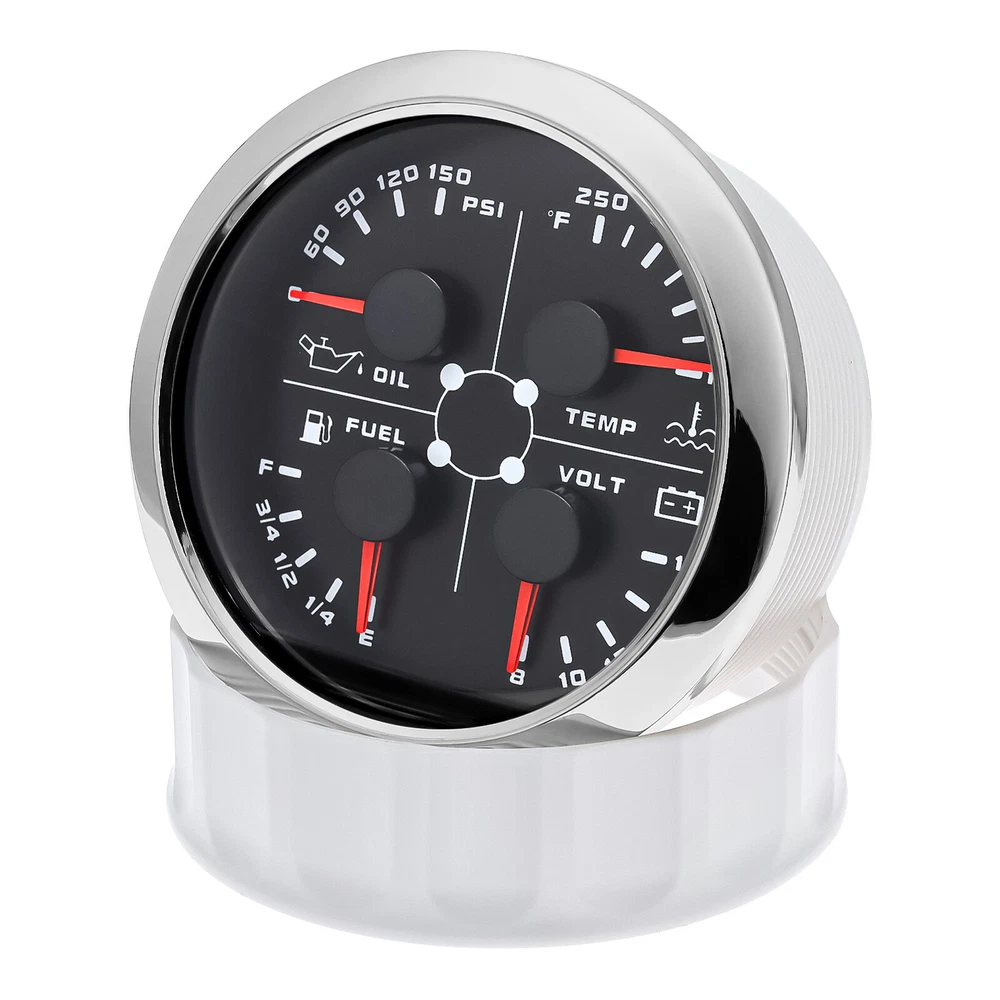 2 Gauge Set 85mm GPS Speedometer 120MPH w/Tacho 0-8000RPM & 85mm 4 in 1 Gauge 2 Gauge Set 85mm GPS Speedometer 0-120MPH w/ 85mm Fuel Level Water Temp Oil Pressure Volt Features: Suitable for all vehicles and off-road vehicles The signal comes directly from the satellite signal receiver(GPS Antenna), don't need other speed sensor. The gauge has the advantages of high precision, quick location confirmation and short start up time. IP67 waterproof and dustproof grade Reverse polarity protection and anti-fogging performance Stepper motors used for full range of stepping gauges, great feature with its less power consumption, longer life, higher precision, etc. Most importantly, the gauge is easy to setup, and can be used in all vehicles, boats and off-road vehicles. Speedometer Specifications: Application: Universal fit for Motorcycle/ Boat/Truck/Bus/Car Electronic Speedometer (stepper motor) No Mechanic Sensor, get speed signal from GPS Speed ≠0 and show accurate speed in tunnel with the help of accelerometer Total Mileage Adjustable GPS Blind Area Odometer Compensation OverSpeed Buzzer Alarm (Value Adjustable) Indication Light (Left, Right and High Beam Installation Diameter: 85mm (3 3/8") Speed Range: 0~120MPH RPM Range : 0~8000RPM Mileage Range: 0-99999.9miles Working Voltage: 12V/24V Working temperatures: - 40 to 85°C Protection rank: IP67 Waterproof Reverse polarity protection and anti-fogging performance 4 IN 1 Gauge Technical Data: Fixing dimension: 85mm Indicating Range: Oil press. meter: 0-150PSI Water temp. meter: 100-250℉ Fuel level meter: 0-190ohms/240-33ohms, empty-full; The signal can be adjusted Voltmeter: 8-16V Working Voltage: 12V Input Signal: 10-184ohms for 0-10Bar oil pressure meter; 0-190ohms for fuel level meter;(Default 0-190ohms, can adjust to 240-33ohms) 8-16V voltage meter; Input Signal 320-22ohms for water temperature meter Red backlight Protection grade is IP67, the whole body is completely waterproof; Excellent antifogging function; 316 Stainless steel bezel with curved glass; Convenient Installation by multi-plug socket connecting way; Accessories: matched with connectors, Installation Instruction Package Included: 1 x 85mm 4 in 1 Multifunctional Gauge 1 x 85mm GPS Speedometer Gauge 1 x GPS Antenna 2 x Cable 2 x Installation Instruction