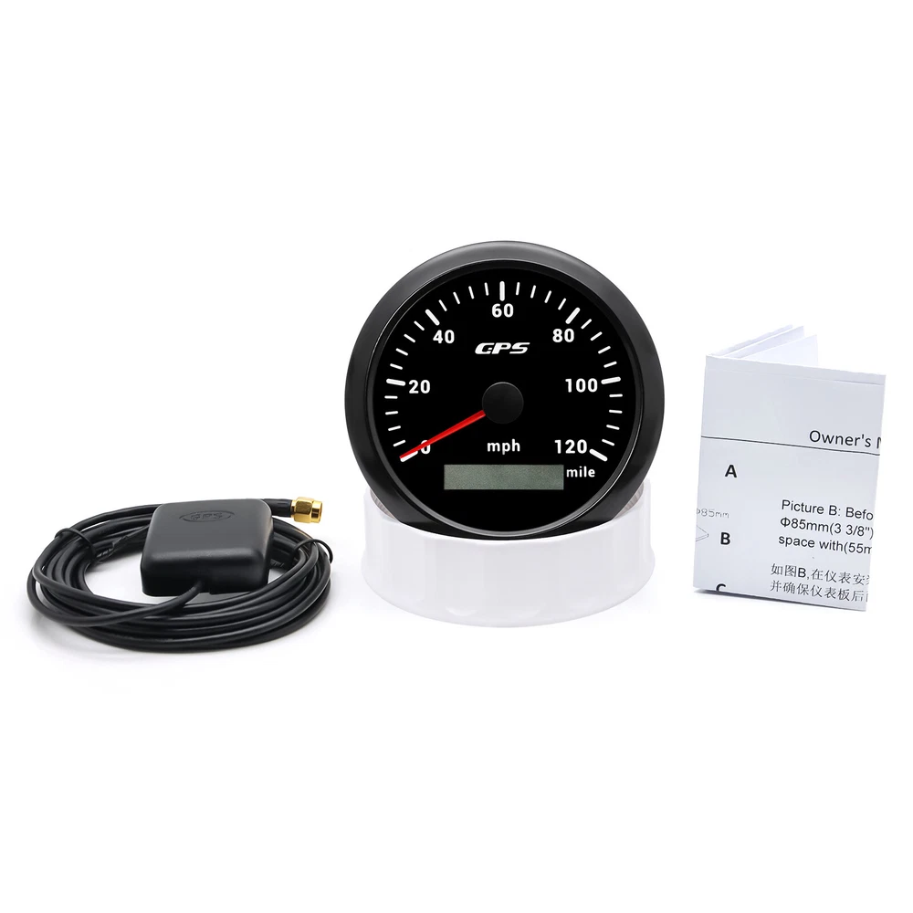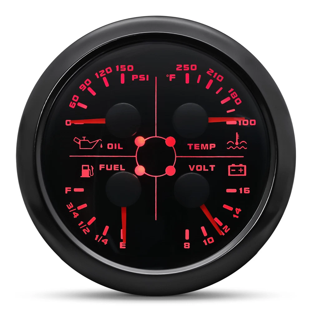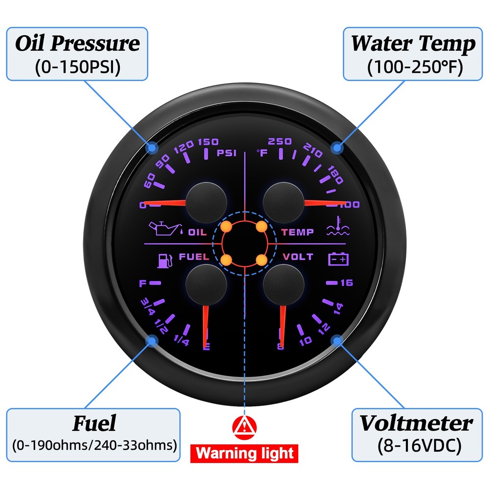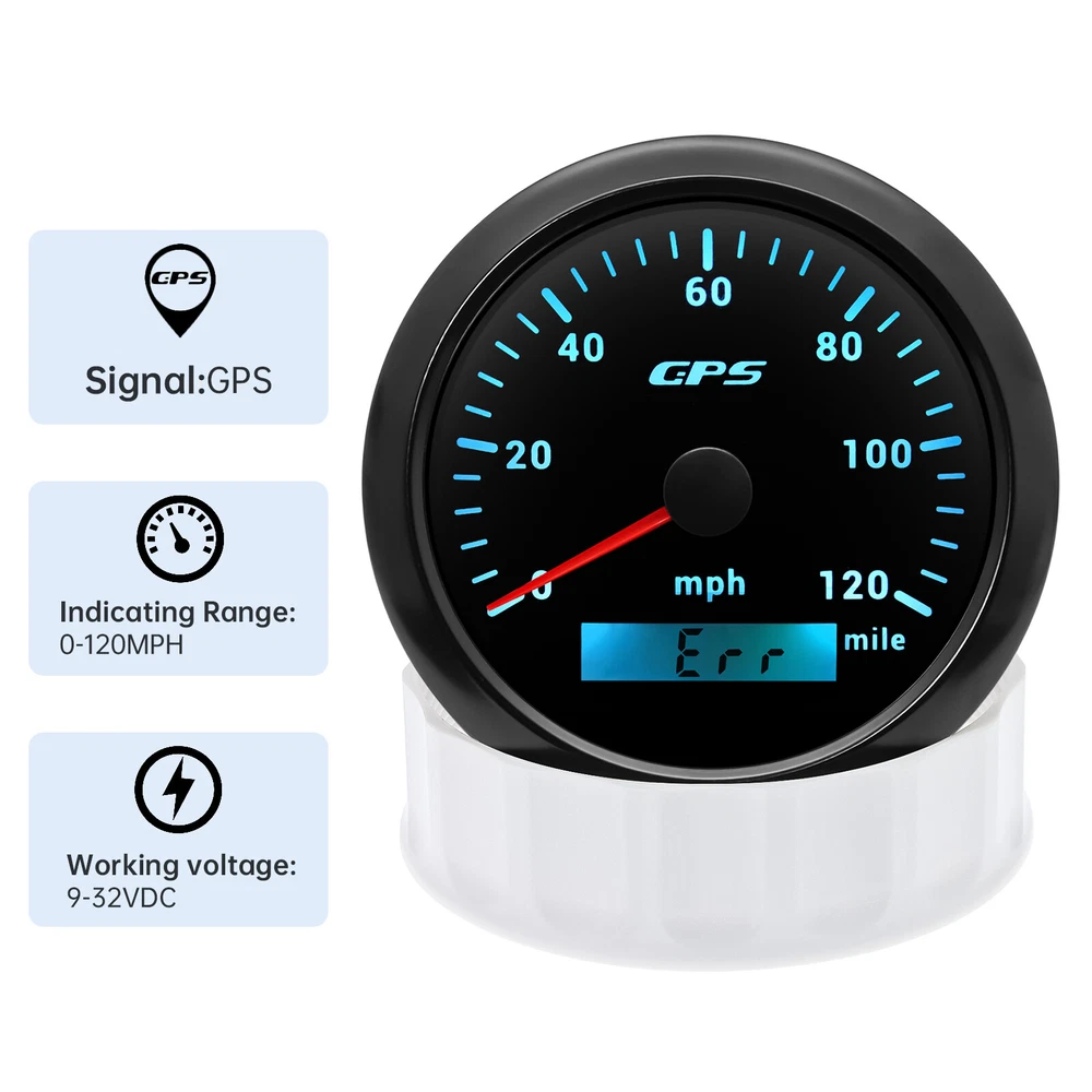 3 Gauge Set 85mm GPS Speedometer 120MPH Tachometer 4in 1 Fuel Gauge For Boat Car 3 Gauge Set 85mm GPS Speedometer 0-120MPH Tachometer Fuel level Gauge for Marine Boat Car Truck 4in1 85mm Mulfifunctional gauge Technical Data: Fixing dimension: 85mm Indicating Range: Oil press. meter: 0-150psi; Water temp. meter: 100-250° F Fuel level meter: 0-190ohms/240-33ohms, empty-full; (The signal can be adjusted) Voltmeter: 8-16V Working Voltage: 12V Backlight: Red Input Signal: 10-184ohms for 0-150PSI oil pressure meter; 0-190ohms for fuel level meter; (Default 0-190ohms, can adjust to 240-33ohms) 8-16V voltage meter; Input Signal 287.4-22.4ohms for water temperature meter Red backlight Protection grade is IP67, the whole body is completely waterproof; Excellent antifogging function; 316 Stainless steel bezel with curved glass; Convenient Installation by multi-plug socket connecting way; Accessories: matched with connectors, Installation Instruction Tachometer Specification: Size:85mm Engine hours:0.0-99999.9H Working voltage:9-32VDC Waterproof and dustproof grade IP67. Working current:<120mA Working temperature:-30-70℃ Storage temperature:-40-85℃ Backlight:7 Color backlight Indicating Range:0~6000 RPM Signal:Pulse GPS Speedometer Specifications Material:Stainless Steel 316L Bezel + Anti-fog Glass Install Diameter:Φ85mm or 3-3/8" Signal:GPS Working Voltage:9~32V DC Working Current:≤100mA Operating Temperature:-30℃ ~ 75℃ Storage Temperature:-40℃ ~ 85℃ Size:12x8x12cm / 4.72x3.1x4.75 inch IP67 waterproof and dustproof grade Indication Range:0-120mph Backlight:7 Colors Backligt Package Included: 1X 85mm 4 in 1 Multifunctional Gauge 1X 85mm GPS speedometer 1X 85mm tachometer 1X GPS Cable 3X Cable 3X Installation Instruction