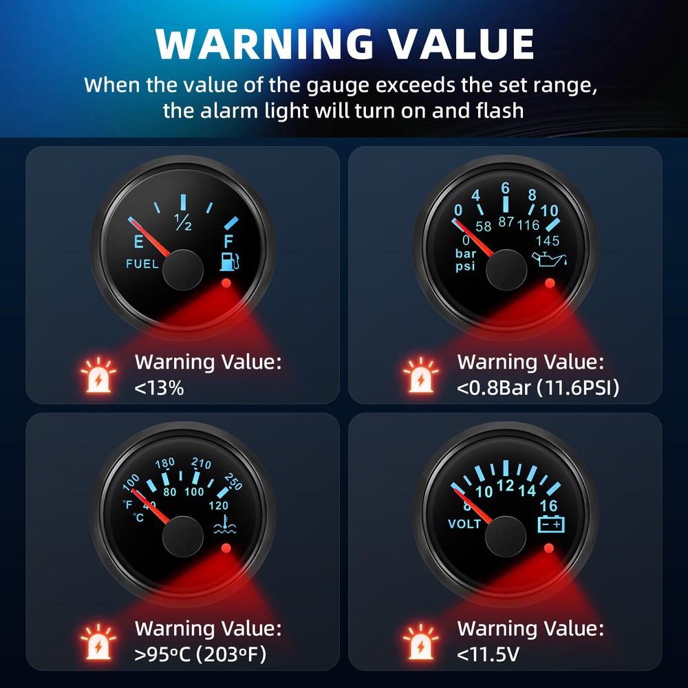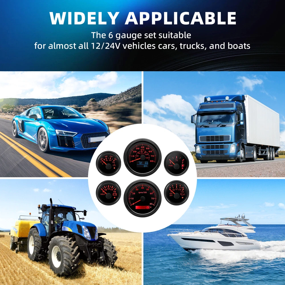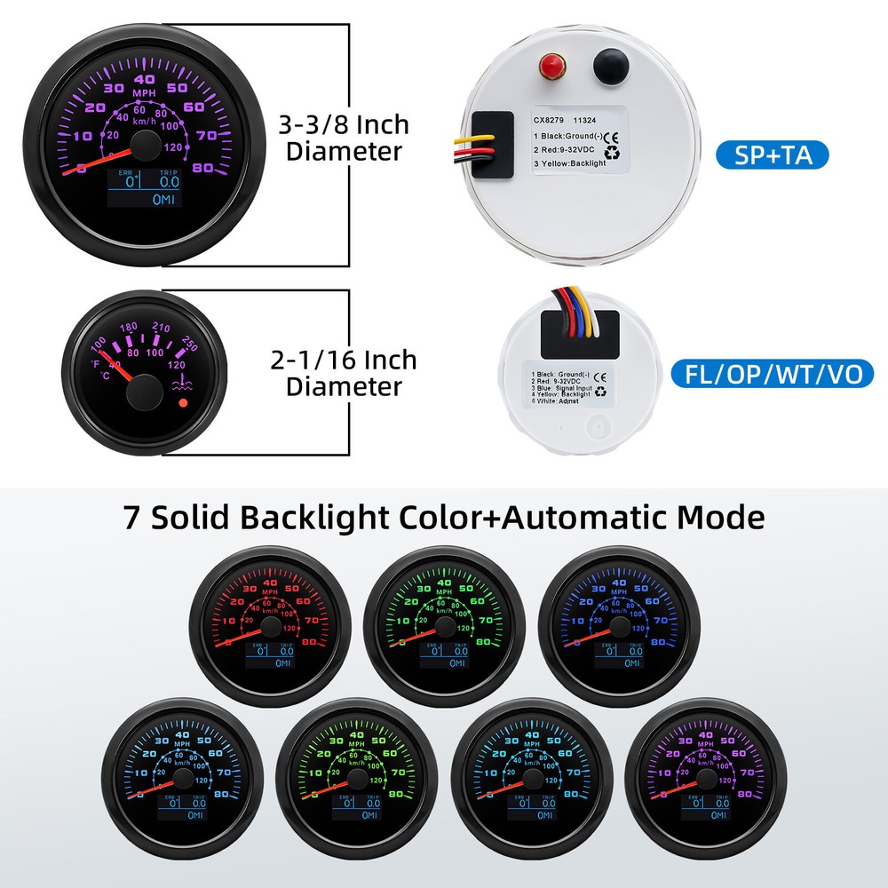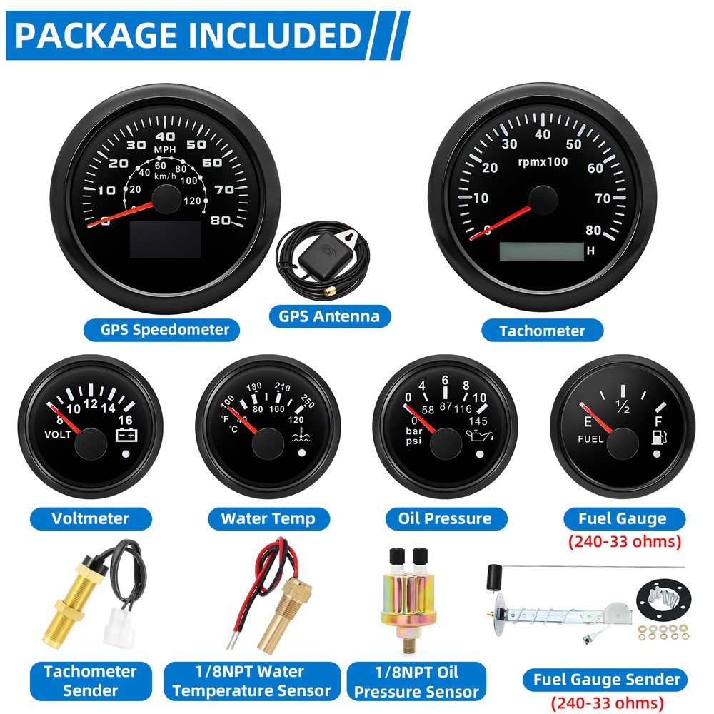 6 Gauge Set 85mm GPS Speedometer 0-80 MPH Tacho/Fuel/Oil/Temp/Volt with Senders 6 Gauge Set 85MM Car GPS Speedometer 80MPH/120KM/H&Tacho & 52MM Fuel/Oil/Temp/Volt with Sensor Feature: High-brightness LED backlight. 316 stainless steel for long-term use even in acid-base, humid environment. IP67 waterproof and dust-proof grade. With curved glass( with anti-fog function). Suitable for all kinds of vehicle modification. Using stepper motor drive pointer, accurate display of the engine speed, and with the LCD display clear display mileage. Gauges have many kinds backlight color (red,yellow,orange,green,blue,purple,white),customers can adjust any color that you like GPS Speedometer Gauge Install Diameter:Φ85mm or 3-3/8" Signal:GPS Working Voltage:9~32V DC Indication Range:0-80MPH 0-120Km/H Backlight:7 Colors Backlight Tachometer Install Diameter:Φ85mm or 3-3/8" Engine hours:0.0-99999.9H Backlight:7 Color backlight Indicating Range:0~8000 RPM Signal:Pulse Volt Gauge Sizes:52 mm (2-1/16") Measuring Range:8-16 (V) Backlight:7 Colors Fuel Level Gauge Sizes:52 mm (2-1/16") Measuring Range:Empty - Full Resistance: 240 (E)-33 (F) ohms Backlight:7 Colors Water Temperature Gauge Install diameter: Φ52mm Indication range: 0~120℃/100-250℉ Input signal: 287.4~22.4 ohm Storage temperature: -40~+85 Backlight: 7 Colors Oil Pressure Gauge Install diameter:Φ52mm or 2-1/16" Indication range:0~10bar/0-145 PSI Operating temperature:-30~+75 Storage temperature:-40~+85 Backlight: 7 Colors Package Includes: 1X 85MM Digital GPS Speedometer Gauge 1X GPS Antenna 1X 85MM Tachometer 1X 52MM Fuel Level gauge 1X 52MM Voltmeter 1X 52MM Water temp gauge 1X 52MM Oil Pressure gauge 6X Installation Instruction The sending units will be included
