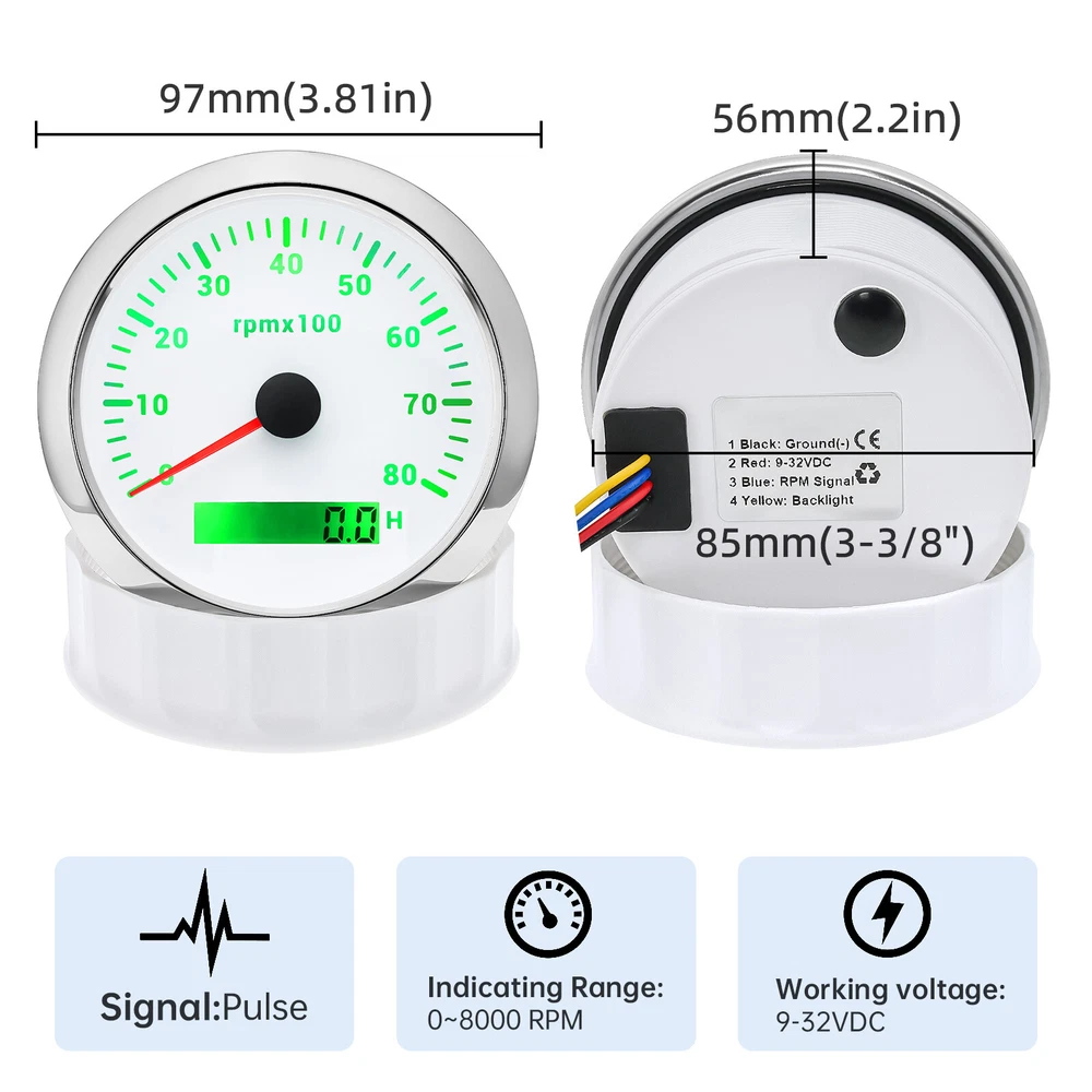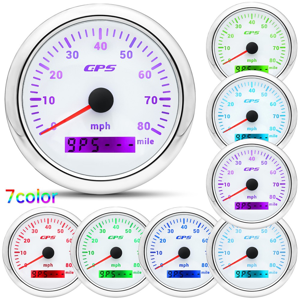 6 Gauges Set 85mm GPS Speedometer 0-80MPH Tachometer Waterproof for Boat Car US 6 Gauge Set 85mm GPS Speedometer 0-80MPH Tachometer Waterproof for Boat Car US Feature: High-brightness LED backlight. 316 stainless steel for long-term use even in acid-base, humid environment. IP67 waterproof and dust-proof grade. With curved glass( with anti-fog function). Suitable for all kinds of vehicle modification. Using stepper motor drive pointer, accurate display of the engine speed, and with the LCD display clear display mileage. Gauges have many kinds backlight color (red,yellow,orange,green,blue,purple,white),customers can adjust any color that you like GPS Speedometer Gauge Install Diameter: Φ85mm or 3-3/8" Signal: GPS Working Voltage: 9~32V DC Size: 12x8x12cm / 4.72x3.1x4.75 inch Indication Range: 0-80MPH Backlight:7 Colors Backlight Tachometer Install Diameter: Φ85mm or 3-3/8" Engine hours: 0.0-99999.9H Backlight :7 Color backlight Indicating Range: 0~8000 RPM Signal: Pulse For Tachometer, you can substitute for different unit, please contact us before / after purchase or note on the order. Tachometer: 0-3000rpm/0-4000RPM/6000RPM/7000RPM Fuel Level Gauge Sizes: 52 mm (2-1/16") Measuring Range: Empty - Full Resistance: 240 (E) - 33 (F) ohms Backlight: 7 Colors Water Temperature Gauge Install diameter: Φ52mm Indication range: 0~120℃/30-250℉ Input signal: 287.4~22.4 ohms Storage temperature: -40~+85℃ Backlight: 7 Colors Oil Pressure Gauge Install diameter:Φ52mm or 2-1/16" Indication range:0~10bar / 0-150 PSI Operating temperature:-30~+75 Storage temperature:-40~+85 Backlight: 7 Colors Volt Gauge Sizes: 52 mm (2-1/16") Measuring Range: 8 - 16 (V) Backlight: 7 Colors Package Includes: 1X 85MM Digital GPS Speedometer Gauge 1X GPS Antenna 1X Tachometer 1X Fuel Level gauge 1X Voltmeter 1X Water temp gauge 1X Oil Pressure gauge 6X Installation Instruction