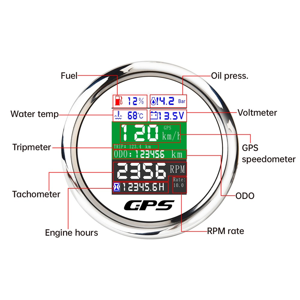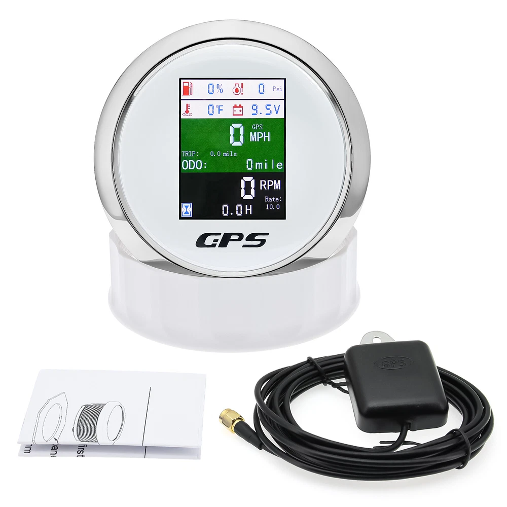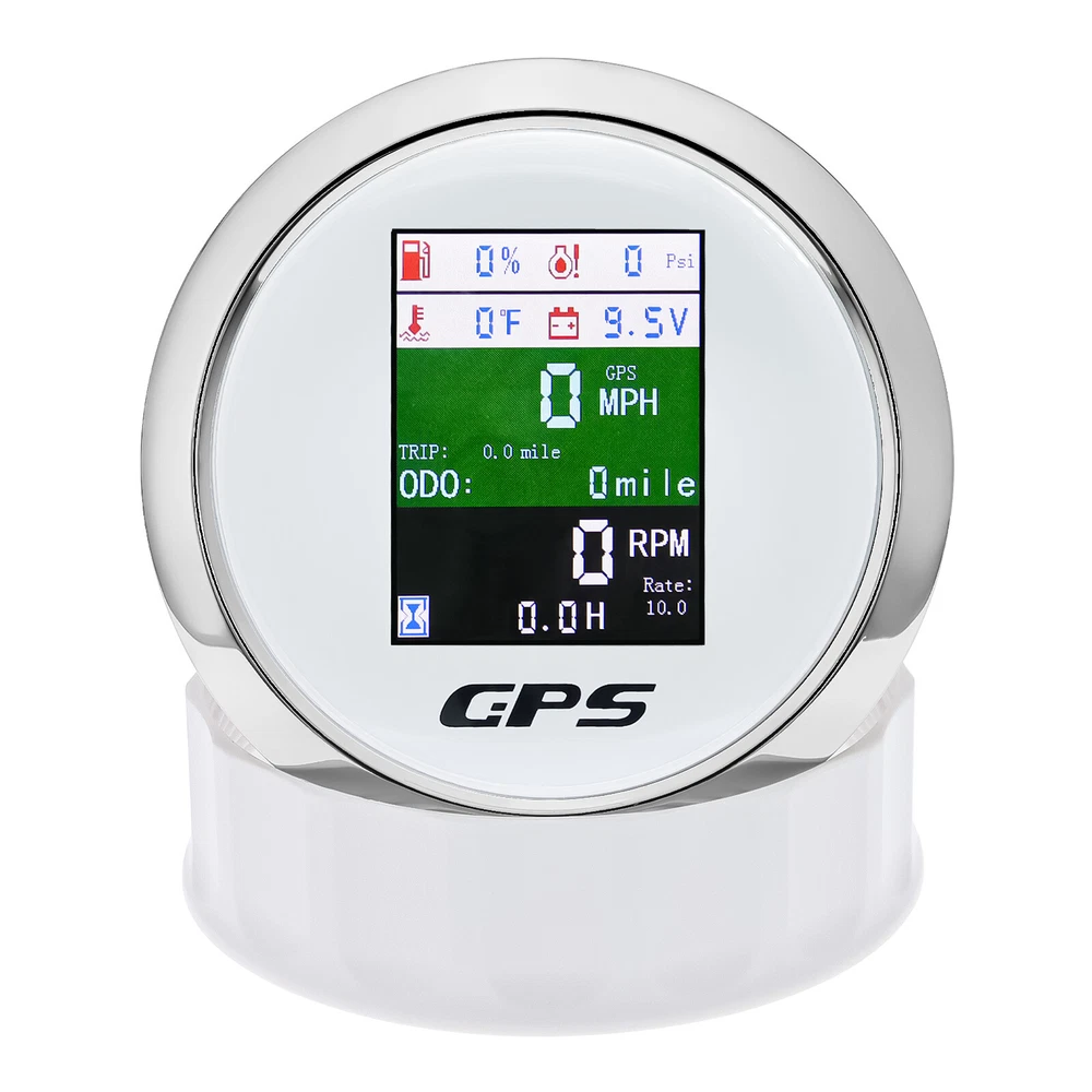85mm 6 In 1 Boat GPS Speedometer Tachometer Pressure Temp Fuel Gauge With Sender 85MM GPS Speedometer Tachometer Voltage 9-32V Water Temp Fuel Level Oil Pressure 0-10Bar 6 in 1 Multi-functional Digital Gauge with alarm Warmly tips: If any problem after buying, such as some when you install or the parcel received or un-received, please do not open a case and do not hesitate to contact us. We would do our best to give you the best solution. Thank you so much Features: - GPS SOG: Speed Over Ground: 0-600km/h - ODO: odometer: 0-999999km (can be adjusted by the back button.) - TRIP: 0-999.9km (Return Zero When off electricity) - COG: Course Over Ground - Tachometer: 0-9999RPM - Speed Ratio: 1.0-360.0; Step Value: 0.1 - Oil Pressure: 0-10 bar/0-145psi (Pressure sensor: 10-184ohm) (After power on, press the back button to adjust unit, if the oil pressure unit is "psi", the temperature unit will be "℉".) - Water Temperature: 40-120℃/100-250℉ (Temperature sensor: 301-22ohm) (The water temperature is displayed by default. If you need oil temperature, please contact us to customize.) - Voltmeter: 9-32V - Fuel Level: 0-100% (Press the back button to adjust the level signal: 0-190Ω/240-33Ω available.) - Total Engine Hours: 0.0-99999.9H(Press the back button to adjust.) - Sensor Fault Alarm(Chinese and English can be switched) - Degree of Protection: IP67 - Backlight: TFT Screen * Sensor are not provided with this gauge. * Plz. order the sensor separately if you need it. Setting: - Keep on pressing the back button for 3 seconds, and then enter into setting mode, leaving button more than 3 seconds, it will be out of setting mode. - The value will increase when you press the button. When you leave the button and then press it again, the value will decrease. The minimum step value is 0.1 and the adjustable range is 1.0-360.0.(tachometer setting) - When you get the required speed ratio value after adjustment, please leave the button. The tachometers will autoclave your setup after 3 seconds. If the setup doesn't meet your demand, please re-setup. - Must press the button first and power up, can select English or Chinese. Dimensions: - 85mm diameter (3-3/8") - 55mm Depth (2-3/4") Package Included(as picture): - 1X 85mm 6 in 1 Gauge - 1X 1/8NPT Water temp sender - 1X 1/8NPT Oil pressure sender - 1X Multi-plug socket - 1X GPS antenna - 1X Instruction Note: - Please make sure you can Installation,if you need help you can contact your local car repair workshop,Thank you! - Please allow a voltage error of 0.2V, thank you Wholesale and Drop shipping - For wholesale, we will offer the discount or free express shipping which only takes 3-7 days to arrive. - For drop shipping, We could send the goods to your customers directly and won't leave information about us if youd like to.