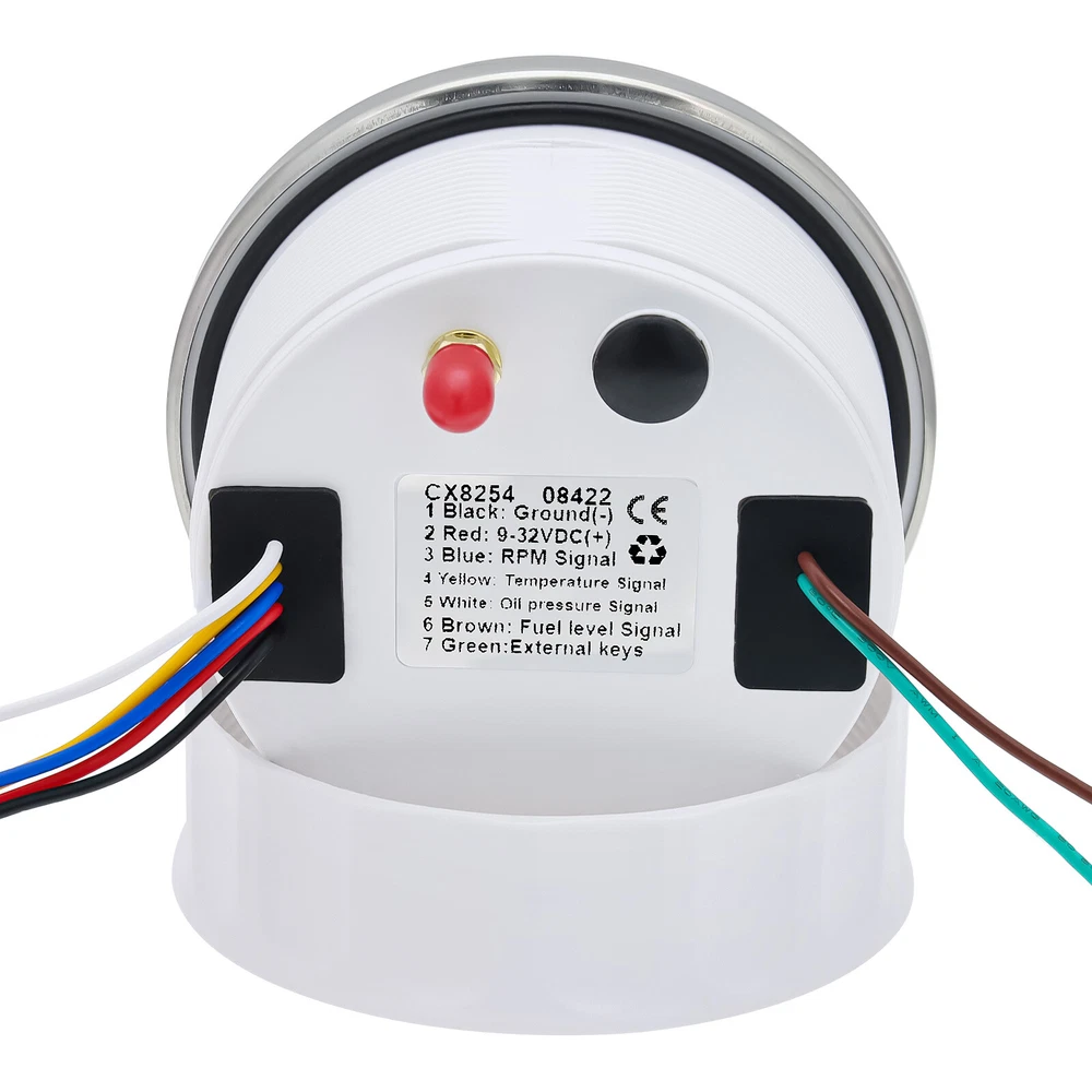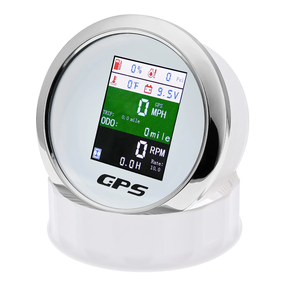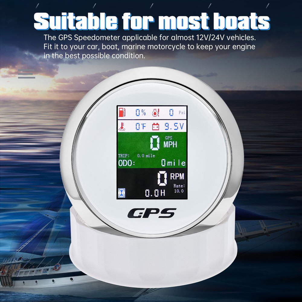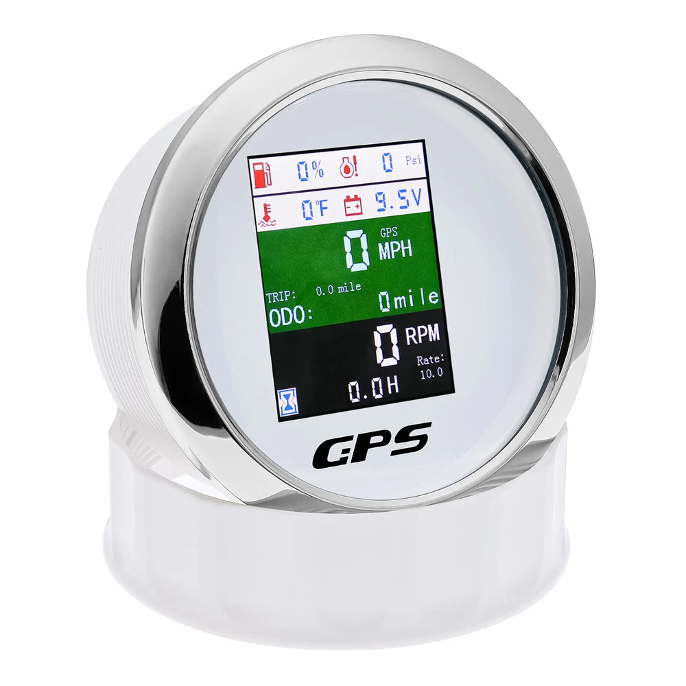 85mm 6 In 1 Boat GPS Speedometer Tachometer Pressure Temp Fuel Gauge With Sender 85MM GPS Speedometer Tachometer Voltage 9-32V Water Temp Fuel Level Oil Pressure 0-10Bar 6 in 1 Multi-functional Digital Gauge with alarm Warmly tips: If any problem after buying, such as some when you install or the parcel received or un-received, please do not open a case and do not hesitate to contact us. We would do our best to give you the best solution. Thank you so much Features: - GPS SOG: Speed Over Ground: 0-600km/h - ODO: odometer: 0-999999km (can be adjusted by the back button.) - TRIP: 0-999.9km (Return Zero When off electricity) - COG: Course Over Ground - Tachometer: 0-9999RPM - Speed Ratio: 1.0-360.0; Step Value: 0.1 - Oil Pressure: 0-10 bar/0-145psi (Pressure sensor: 10-184ohm) (After power on, press the back button to adjust unit, if the oil pressure unit is "psi", the temperature unit will be "℉".) - Water Temperature: 40-120℃/100-250℉ (Temperature sensor: 301-22ohm) (The water temperature is displayed by default. If you need oil temperature, please contact us to customize.) - Voltmeter: 9-32V - Fuel Level: 0-100% (Press the back button to adjust the level signal: 0-190Ω/240-33Ω available.) - Total Engine Hours: 0.0-99999.9H(Press the back button to adjust.) - Sensor Fault Alarm(Chinese and English can be switched) - Degree of Protection: IP67 - Backlight: TFT Screen * Sensor are not provided with this gauge. * Plz. order the sensor separately if you need it. Setting: - Keep on pressing the back button for 3 seconds, and then enter into setting mode, leaving button more than 3 seconds, it will be out of setting mode. - The value will increase when you press the button. When you leave the button and then press it again, the value will decrease. The minimum step value is 0.1 and the adjustable range is 1.0-360.0.(tachometer setting) - When you get the required speed ratio value after adjustment, please leave the button. The tachometers will autoclave your setup after 3 seconds. If the setup doesn't meet your demand, please re-setup. - Must press the button first and power up, can select English or Chinese. Dimensions: - 85mm diameter (3-3/8") - 55mm Depth (2-3/4") Package Included(as picture): - 1X 85mm 6 in 1 Gauge - 1X 1/8NPT Water temp sender - 1X 1/8NPT Oil pressure sender - 1X Multi-plug socket - 1X GPS antenna - 1X Instruction Note: - Please make sure you can Installation,if you need help you can contact your local car repair workshop,Thank you! - Please allow a voltage error of 0.2V, thank you Wholesale and Drop shipping - For wholesale, we will offer the discount or free express shipping which only takes 3-7 days to arrive. - For drop shipping, We could send the goods to your customers directly and won't leave information about us if youd like to.