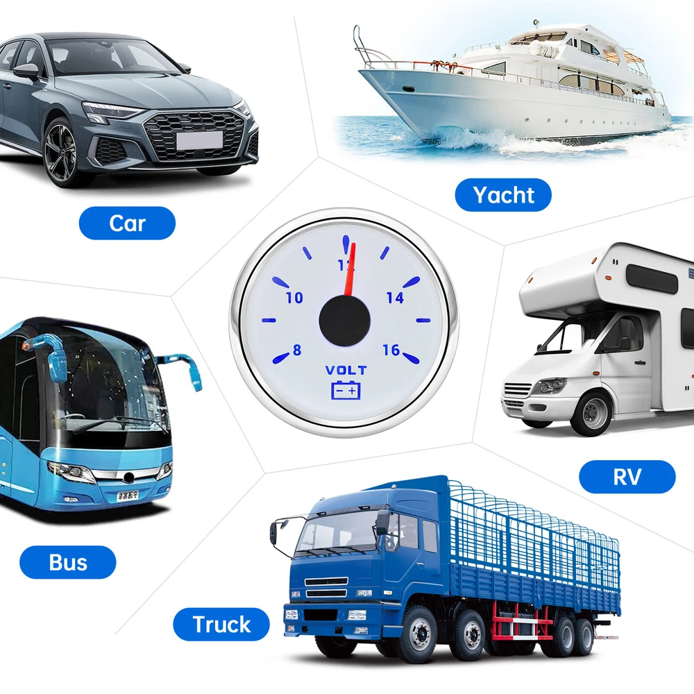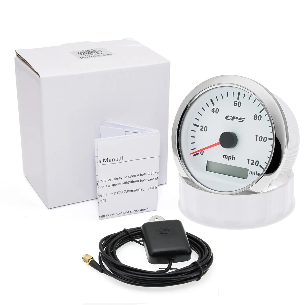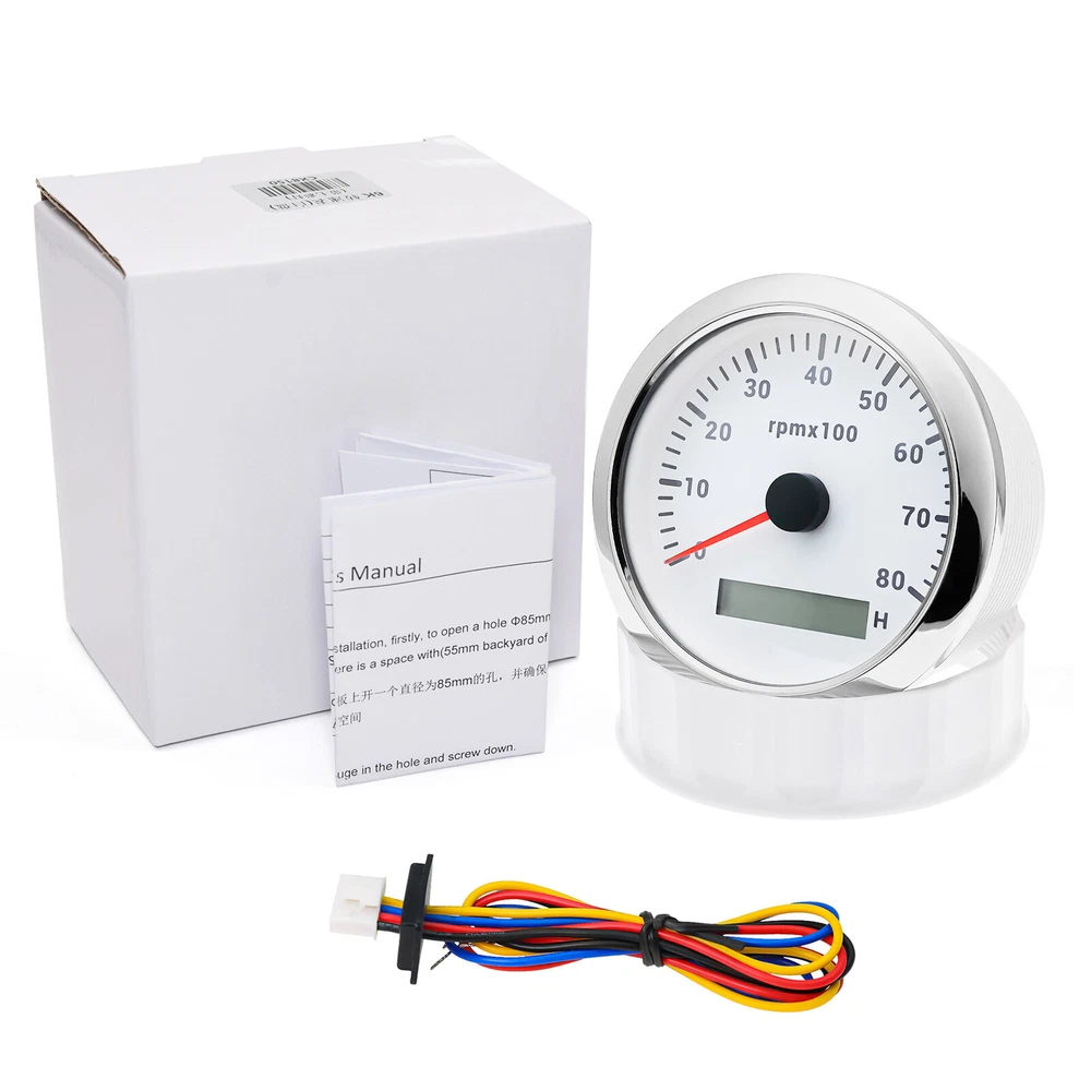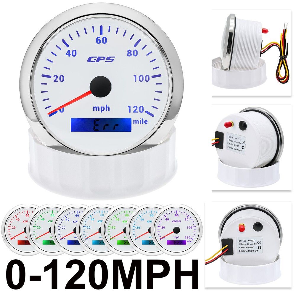 7 Gauges Set 85mm GPS Speedometer 0-120MPH Waterproof for Marine Boat Car Truck 7 Gauge Set 85mm GPS Speedometer 0-120MPH Tachometer Waterproof for Boat Car Feature: High-brightness LED backlight. 316 stainless steel for long-term use even in acid-base, humid environment. IP67 waterproof and dust-proof grade. With curved glass( with anti-fog function). Suitable for all kinds of vehicle modification. Using stepper motor drive pointer, accurate display of the engine speed, and with the LCD display clear display mileage. Gauges have many kinds backlight color (red,yellow,orange,green,blue,purple,white),customers can adjust any color that you like GPS Speedometer Gauge Install Diameter: Φ85mm or 3-3/8" Signal: GPS Working Voltage: 9~32V DC Size: 12x8x12cm / 4.72x3.1x4.75 inch Indication Range: 0-120MPH Backlight:7 Colors Backlight Tachometer Install Diameter: Φ85mm or 3-3/8" Engine hours: 0.0-99999.9H Backlight :7 Color backlight Indicating Range: 0~8000 RPM Signal: Pulse For Tachometer, you can substitute for different unit, please contact us before / after purchase or note on the order. Tachometer: 0-3000rpm/0-4000RPM/6000RPM/7000RPM Fuel Level Gauge Sizes: 52 mm (2-1/16") Measuring Range: Empty - Full Resistance: 240 (E) - 33 (F) ohms Backlight: 7 Colors Water Temperature Gauge Install diameter: Φ52mm Indication range: 0~120℃/30-250℉ Input signal: 287.4~22.4 ohms Storage temperature: -40~+85℃ Backlight: 7 Colors Oil Pressure Gauge Install diameter:Φ52mm or 2-1/16" Indication range:0~10bar / 0-150 PSI Input signal: 10-184 ohms Operating temperature:-30~+75 Storage temperature:-40~+85 Backlight: 7 Colors Volt Gauge Sizes: 52 mm (2-1/16") Measuring Range: 8 - 16 (V) Backlight: 7 Colors Trim gauge 7 Color Backlight : Red (default)→green → blue → white →yellow→cyan →Purple →(automatic). Fixing dimension: 52mm(2'') Indicating Range: UP-DN Signal: 0-190ohms Working Voltage: 9-32V(12V/24V) Operation mode: LCD display, stepper motor Package Includes: 1X 85MM Digital GPS Speedometer Gauge 1X GPS Antenna 1X 85MM Tachometer 1X 52MM Fuel Level gauge 1X 52MM Trim gauge 1X 52MM Voltmeter 1X 52MM Water temp gauge 1X 52MM Oil Pressure gauge 7X Installation Instruction Please confirm the size you need before buying