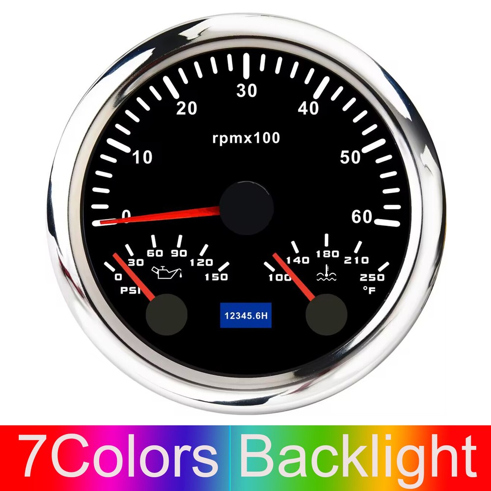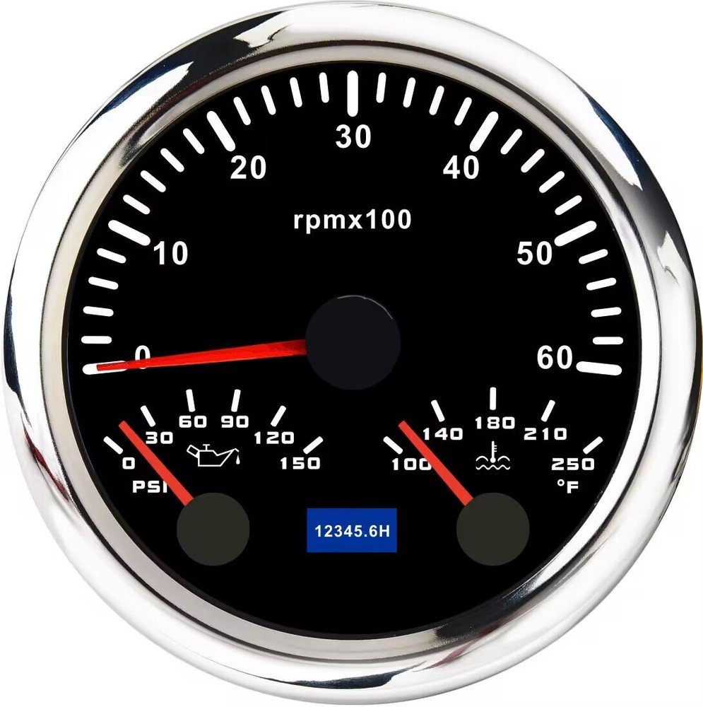 85mm GPS Speedometer 0-120MPH Fuel Volt & 85mm Tachometer/Oil/Temp with Senders 2 Gauge Set With Senders 85mm GPS Speedometer 0-120MPH Fuel Gauge Volt Tachometer 0-6000RPM Water Temp ℉ Oil Press PSI NOTES: The water temperature gauge, Oil pressure gauge does not support desktop testing. It is necessary to connect the SENDING UNITS in order to use it properly. Any helps, please do not hesitate to contact me. Thank you Features: RPM Tachometer Support : Car /Truck/ Boat /Diesel Generator Engine /Gasoline Engine Waterproof:IP67 Excellent anti-fogging function; 316 Stainless steel bezel with curved glass; Convenient Installation by multi-plug socket connecting way; With curved glass( with anti-fog function). 7 colors baclight for your choose (red (default)→green →blue →white →yellow →cyan →Purple→(automatic)),customers can adjust any color that you like Tachometer fit for Car /Truck/ Boat /Diesel Generator Engine /Gasoline Engine CX8307 GPS Speedometer Specification: Size: 85mm GPS Speedometer: 0-120MPH Fuel level: 0-190ohms, 240-33ohms, 10-180ohms, 0-90ohms(Can be adjusted) Voltage: 8-16V Working voltage: 9-32VDC Working current: <100mA Working temperature: -30-80℃ Storage temperature: -40-85℃ Backlight :7 Color backlight Color: Black CX8309 Tachometer Specification: Size: 85mm Tachometer: 0-6000RPM Oil pressure: 0-150PSI Water temperature: 100-250℉ Engine hours: 0.0-99999.9H Working voltage: 9-32VDC Working current: <100mA Working temperature: -30-80℃ Storage temperature: -40-85℃ Backlight :7 Color backlight Color: Black Input parameter Oil pressure sensor: 10~184ohms Temperature sensor: 301~22ohms CX8309 Connection 1 Black: Ground(-) 2 Red: 9-32vDC(+) 3 Blue:PRM signal 4 Yellow: Backlight 5 White: Oil pressure signal 6 Brown:Temperature signal 7 Green:Adjust CX8307 Connection 1 Black : Ground(-) 2 Red : 9~32vDc(+) 3 Blue : Fuel signal 4 Yellow : BackLight 5 White : High Beam 6 Brown: Buzzer alarm(+) 7 Green: Nc 8 Yellow: Left Turn 9 Gray: Right Turn 10 white: External Button Package Included: 1 x 85mm 3 in 1 GPS Speedometer 1 x 85mm 3 in 1 Tachometer Gauge 1 x Tacho Sensor 1 x 1/8NPT Temp sensor 1 x 1/8NPT Pressure sensor 2 x Cable 2 x Installation Instruction