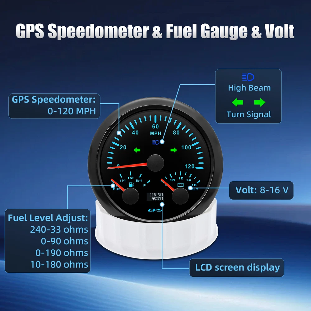 85mm GPS Speedometer 0-120MPH Fuel Gauge/Volt/Tacho/Oil/WaterTemp with Senders 2 Gauge Set With Senders 85mm GPS Speedometer 0-120MPH Fuel Gauge Volt Tachometer 0-8000RPM Water Temp ℉ Oil Press PSI NOTES: The water temperature gauge, Oil pressure gauge does not support desktop testing. It is necessary to connect the SENDING UNITS in order to use it properly. Any helps, please do not hesitate to contact me. Thank you Features: RPM Tachometer Support : Car /Truck/ Boat /Diesel Generator Engine /Gasoline Engine Waterproof:IP67 Excellent anti-fogging function; 316 Stainless steel bezel with curved glass; Convenient Installation by multi-plug socket connecting way; With curved glass( with anti-fog function). 7 colors baclight for your choose (red (default)→green →blue →white →yellow →cyan →Purple→(automatic)),customers can adjust any color that you like Tachometer fit for Car /Truck/ Boat /Diesel Generator Engine /Gasoline Engine GPS Speedometer Specification: Size: 85mm GPS Speedometer: 0-120MPH Fuel level: 0-190ohms, 240-33ohms, 10-180ohms, 0-90ohms(Can be adjusted) Voltage: 8-16V Working voltage: 9-32VDC Working current: <100mA Working temperature: -30-80℃ Storage temperature: -40-85℃ Backlight :7 Color backlight Color: Black Tachometer Specification: Size: 85mm Tachometer: 0-8000RPM Oil pressure: 0-150PSI Water temperature: 100-250℉ Engine hours: 0.0-99999.9H Working voltage: 9-32VDC Working current: <100mA Working temperature: -30-80℃ Storage temperature: -40-85℃ Backlight :7 Color backlight Color: Black Input parameter Oil pressure sensor: 10~184ohms Temperature sensor: 301~22ohms Tachometer Connection 1 Black: Ground(-) 2 Red: 9-32vDC(+) 3 Blue:PRM signal 4 Yellow: Backlight 5 White: Oil pressure signal 6 Brown:Temperature signal 7 Green:Adjust GPS Speedometer Connection 1 Black : Ground(-) 2 Red : 9~32vDc(+) 3 Blue : Fuel signal 4 Yellow : BackLight 5 White : High Beam 6 Brown: Buzzer alarm(+) 7 Green: Nc 8 Yellow: Left Turn 9 Gray: Right Turn 10 white: External Button Package Included: 1 x 85mm 3 in 1 GPS Speedometer 1 x 85mm 3 in 1 Tachometer Gauge 1 x Fuel level sending units 1 x 1/8NPT Temp sensor 1 x 1/8NPT Pressure sensor 2 x Cable 2 x Installation Instruction