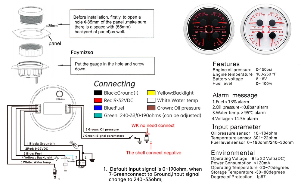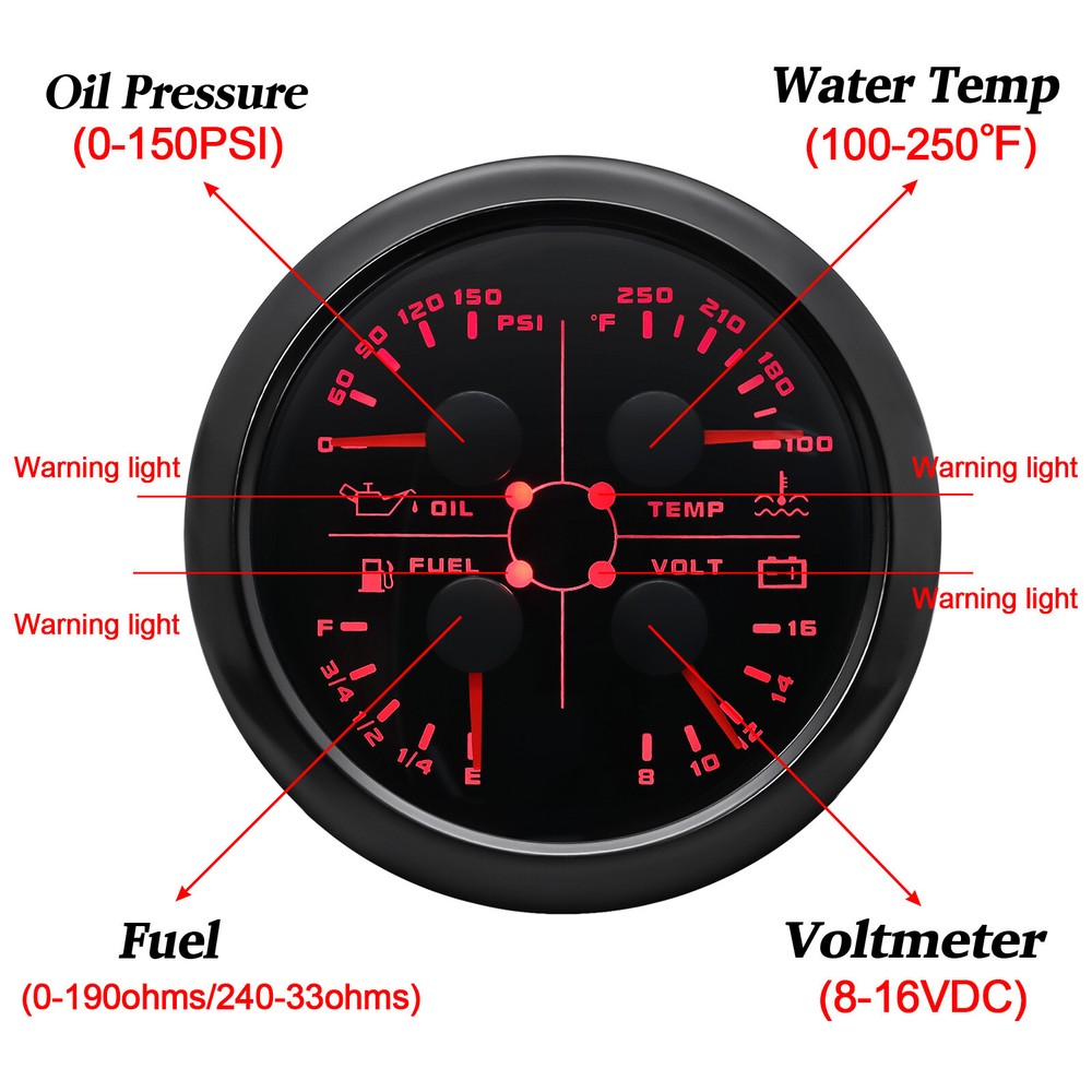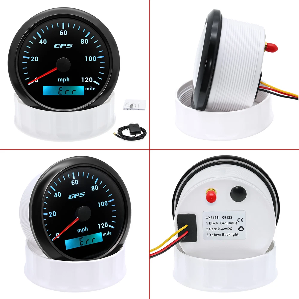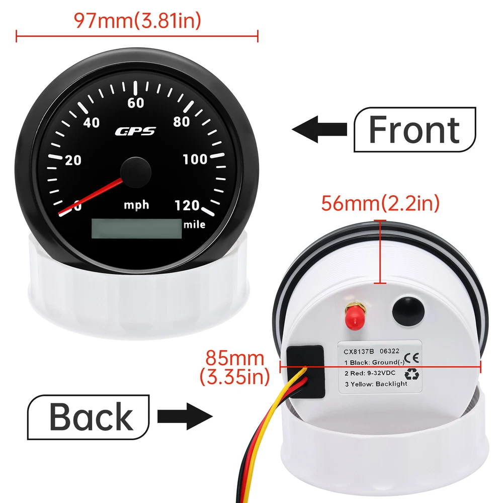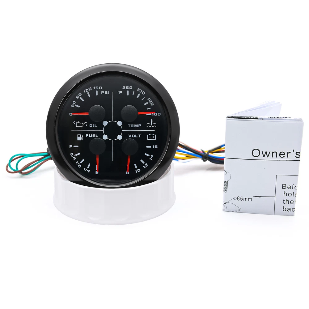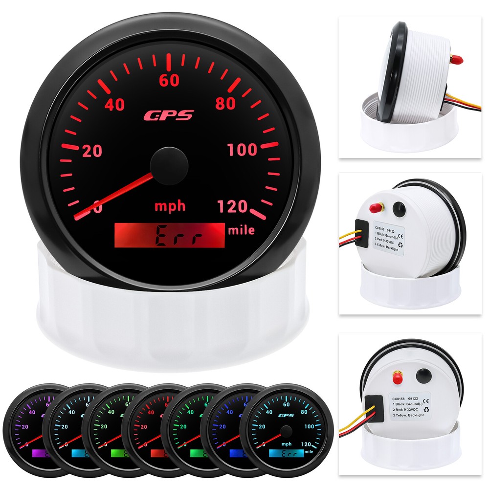 3 Gauge Set 85mm GPS Speedometer 0-120MPH w/Tacho 85mm 4in Multifunctional Gauge 3 Gauge Set 85mm GPS Speedometer 0-120MPH Tachometer Fuel level Gauge for Marine Boat Car Truck 4IN 1 Mulfifunctional gauge Technical Data: Fixing dimension: 85mm Indicating Range: Oil press. meter: 0-150psi; Water temp. meter: 100-250° F Fuel level meter: 0-190ohms/240-33ohms, empty-full; (The signal can be adjusted) Voltmeter: 8-16V Working Voltage: 12V Backlight: Red Input Signal: 10-184ohms for 0-150PSI oil pressure meter; 0-190ohms for fuel level meter; (Default 0-190ohms, can adjust to 240-33ohms) 8-16V voltage meter; Input Signal 287.4-22.4ohms for water temperature meter Red backlight Protection grade is IP67, the whole body is completely waterproof; Excellent antifogging function; 316 Stainless steel bezel with curved glass; Convenient Installation by multi-plug socket connecting way; Accessories: matched with connectors, Installation Instruction Tachometer Specification: Size:85mm Engine hours:0.0-99999.9H Working voltage:9-32VDC Waterproof and dustproof grade IP67. Working current:<120mA Working temperature:-30-70℃ Storage temperature:-40-85℃ Backlight:7 Color backlight Indicating Range:0~8000 RPM Signal:Pulse GPS Speedometer Specifications Material:Stainless Steel 316L Bezel + Anti-fog Glass Install Diameter:Φ85mm or 3-3/8" Signal:GPS Working Voltage:9~32V DC Working Current:≤100mA Operating Temperature:-30℃ ~ 75℃ Storage Temperature:-40℃ ~ 85℃ Size:12x8x12cm / 4.72x3.1x4.75 inch IP67 waterproof and dustproof grade Indication Range:0-120mph Backlight:7 Colors Backligt Package Included: 1X 85mm 4 in 1 Multifunctional Gauge 1X 85mm GPS speedometer 1X 85mm tachometer 1X GPS Cable 3X Cable 3X Installation Instruction