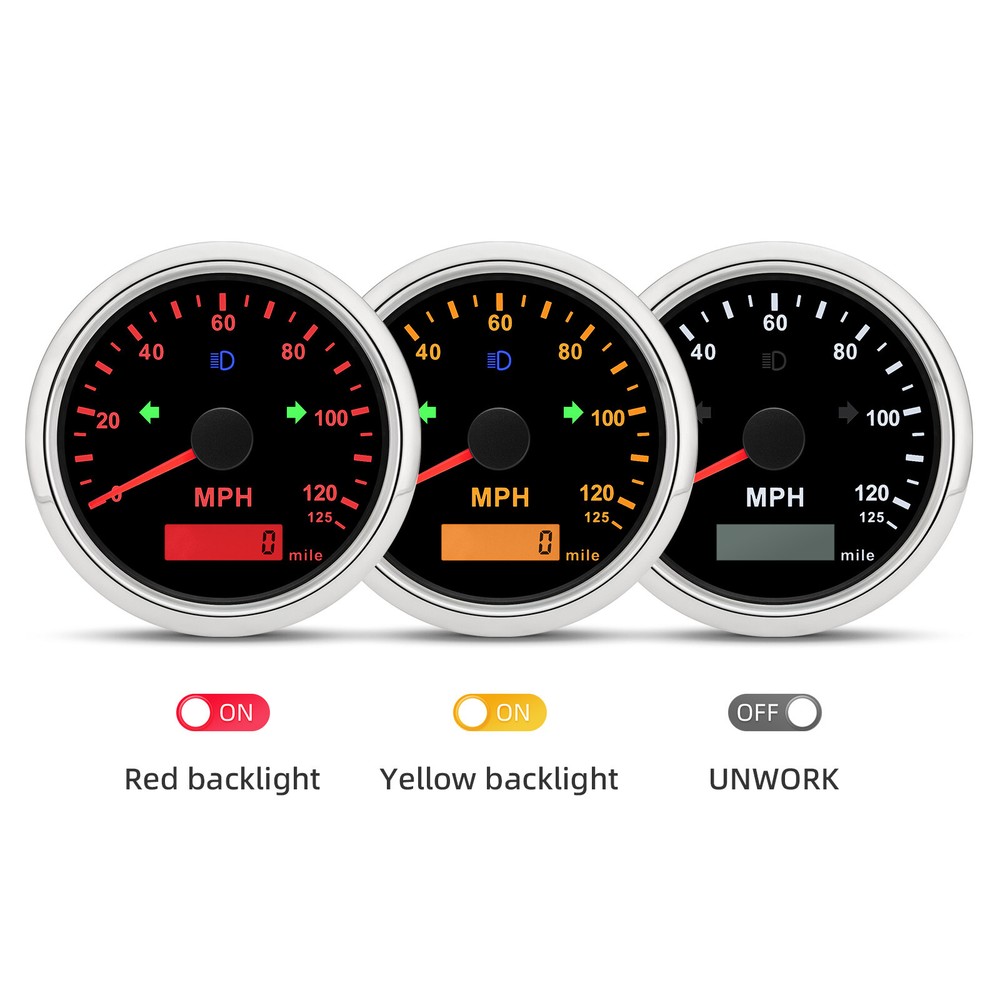 85mm GPS Speedometer 0-125MPH Gauge Turn Signal High Beam For Car Boat Truck 85mm GPS Speedometer 0-125MPH Odometer Gauge With Indicator Light For Boat Car Specifications: Fixing dimension: 85mm(3-3/8") Indicating Range: 0-125MPH Working Voltage: 12V/24V Total Mileage Range: 0-999999 miles GPS Blind Area Odometer Compensation OverSpeed Buzzer Alarm (Value Adjustable) Indication light: LEFT, HIGH BEAM, RIGHT Backlight: Red and Yellow available Working temperatures: - 40 to 85°C Operation mode: LCD display, stepper motor Features: Suitable for all vehicles and off-road vehicles The signal comes directly from the satellite signal receiver(GPS Antenna), don't need other speed sensor. The gauge has the advantages of high precision, quick location confirmation and short start up time. IP67 waterproof and dustproof grade Reverse polarity protection and anti-fogging performance No Stationery Drift Stepper motors used for full range of stepping gauges, great feature with its less power consumption, longer life, higher precision, etc. Installation: 1. Cut an 85mm (3 3/8") hole in the panel (II) and allow a clearance of 55mm (2 3/16”) behind the panel to fit the gauge. 2. Remove fastening ring (I), insert gauge through the panel from the front. Tighten gauge (III) using fastening ring (I) from the rear. 3. Connect cables according to the diagram. Choose either red or yellow wire for backlighting. 4. Securely fasten the GPS antenna, preferably outdoors (or inside front windscreen) so that it has a clear view of the sky to pick up satellite signal. Connect the antenna cable to socket in the back of the gauge. Do not cut cable. 5. After turning on the power, allow the gauge to search for satellite signal for 1 minute. Function Select: “ODO”,“BUZZ” Press and hold on the button at the back, then turn on the power supply. The LCD will show ODO, BUZZ, etc. You can select the function after releasing the button. 1.“ODO”(change total odometer) After selecting “ODO”, the LCD will show “5000” (for example 5000 km) , press the button to change the flashing digit from 0 to 999999 to set up the target odometer value. 2.“BUZZ”(change overspeed buzzer alarm threshold value) After selecting “BUZZ”, e.g. the LCD will show “B 80” (buzzer will be on when speed over 80km/h), press the button to change the flashing digit from 10 to 240 to set up target overspeed buzzer alarm threshold value. (Remarks: No.3 function is not ready in the prototype sent to BESTAS, but will be ready in mass production.) Note: After setting, you should disconnect both Power+ and GND, then reconnect the two cables , it will save the setting. If you just cut Power +, then it won’t work properly. Package Included: 1x GPS speedometer 1x GPS Antenna 1x Multi-plug socket 1x Installation Instruction Wholesale and drop shipping are both welcomed For wholesale, we will offer the discount or free express shipping which only takes 3-7 days to arrive. For drop shipping, We could send the goods to your customers directly and won't leave information about us if youd like to.