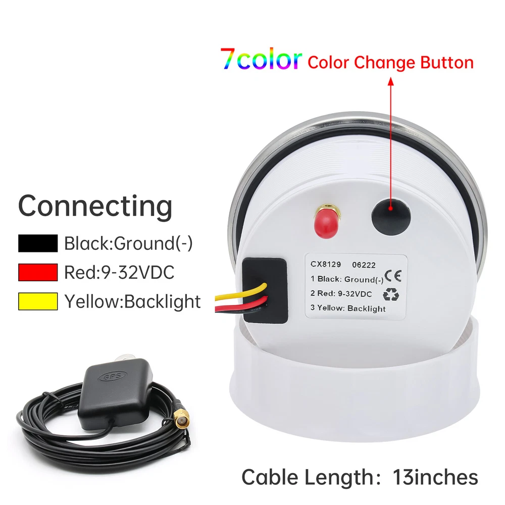 85mm Boat GPS Speedometer 0-200Km/H Odometer Gauge 7 Colors LED For Car Marine 85mm GPS Speedometer Gauge 0-200km/h Odometer 7 Colors LE Display for Car Boat Motorcycle Product Specifications: Dial: White&Silver Material: Stainless Steel 316L Bezel + Anti-fog Glass Install Diameter: Φ85mm or 3-3/8" Signal: GPS Working Voltage: 9~32V DC Working Current: ≤100mA Operating Temperature: -30℃ ~ 75℃ Storage Temperature: -40℃ ~ 85℃ Size: 12x8x12cm / 4.72x3.1x4.75 inch IP67 waterproof and dustproof grade Indication Range: 0-200km/h Backlight:7 Colors Backligt Product Descriptions: High-brightness LED backlight. 316 stainless steel for long-term use even in acid-base, humid environment. IP67 waterproof and dust-proof grade. With curved glass( with anti-fog function). Suitable for all kinds of vehicle modification. Using stepper motor drive pointer, accurate display of the engine speed, and with the LCD display clear display mileage. -Gauges have many kinds backlight color (red,yellow,orange,green,blue,purple,white),customers can adjust any color that you like Connection: Black: Ground(-) Red: 9-32VDC(+) Yellow: Backlight(+) Package Includes: 1X 85MM Digital GPS Speedometer Gauge 1x Wire Harness 1X Instruction 1X GPS Antenna
