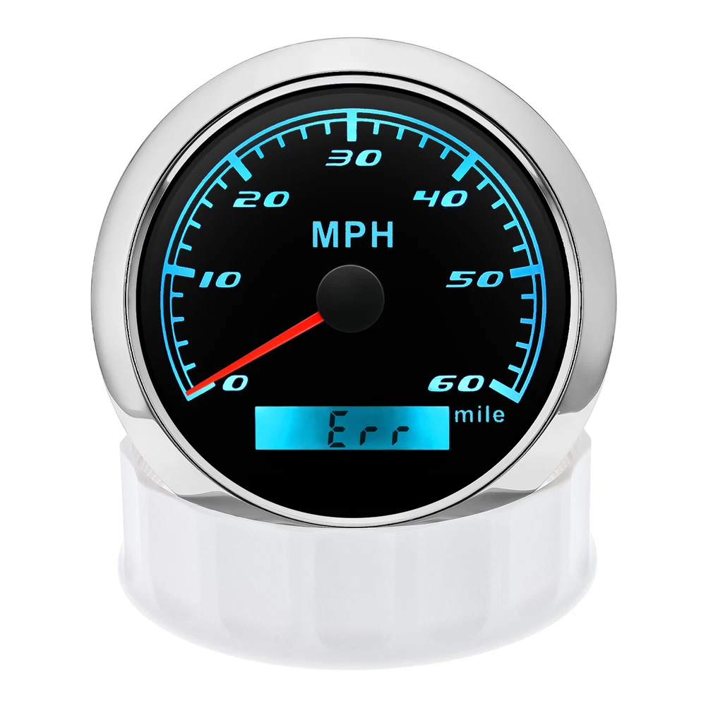 85mm GPS Speedometer 0-60MPH Odometer Gauge 7 Colors LED For Car Truck Boat 85mm GPS Speedometer Gauge Odometer 0-60MPH 7 Colors LED for Car Boat Motorcycle Specifications: Dial: Black Material: Stainless Steel 316L Bezel + Anti-fog Glass Install Diameter: Φ85mm or 3-3/8" Signal: GPS Working Voltage: 9~32V DC Working Current: ≤100mA Operating Temperature: -30℃ ~ 75℃ Storage Temperature: -40℃ ~ 85℃ Size: 12x8x12cm / 4.72x3.1x4.75 inch IP67 waterproof and dustproof grade Indication Range: 0-60 MPH Backlight:7 Colors Backligt Product Descriptions High-brightness LED backlight. 316 stainless steel for long-term use even in acid-base, humid environment. IP67 waterproof and dust-proof grade. With curved glass( with anti-fog function). Suitable for all kinds of vehicle modification. Using stepper motor drive pointer, accurate display of the engine speed, and with the LCD display clear display mileage. Gauges have many kinds backlight color (red,yellow,orange,green,blue,purple,white),customers can adjust any color that you like. Package Includes: 1X 85MM Digital GPS Speedometer Gauge 1X Instruction 1X GPS Antenna