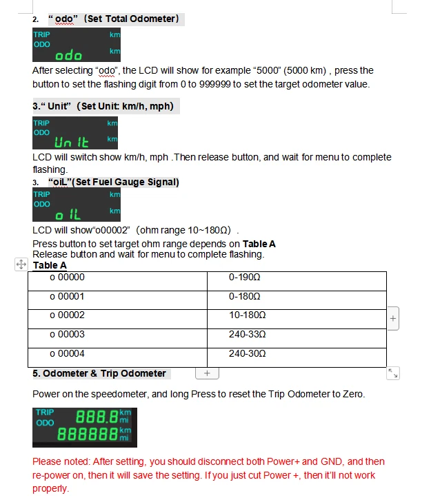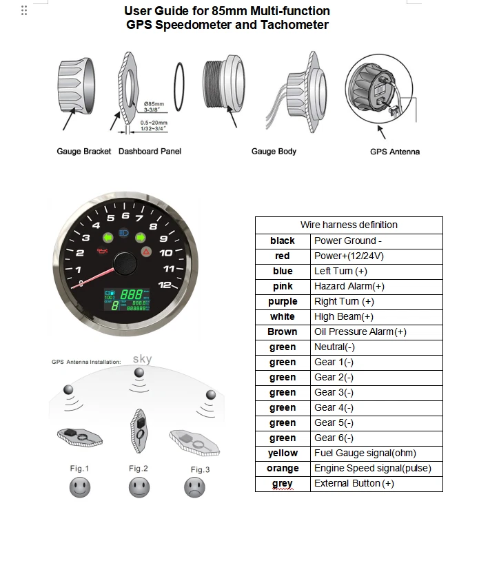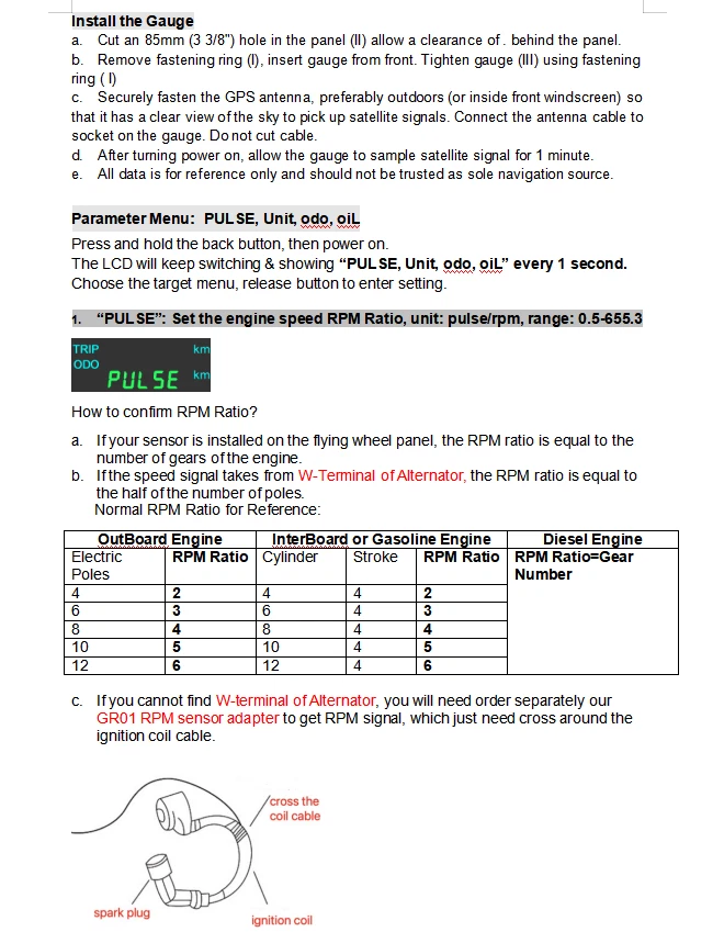 85mm Multi-functional Gauge 12000RPM Tachometer GPS Speedometer Fuel Level Volt 85mm 3in 1 Multi-functional Gauge 12000RPM Tachometer GPS Speedometer Fuel Level Volt For Car Install the Gauge a.Place the motorcycle on a level and secure area. Disconnect the battery. b.Refer to the appropriate factory service manual and remove the OEM speedometer. c.Mount the new speedometer in the desired location. d.Locate and route the orange, green and either one of the black wires exiting from the center of the rear of the gauge to the existing OEM speedometer sensor wiring. You may extend or shorten the gauge wires as needed for your application. e.Securely fasten the GPS antenna, preferably outdoors (or inside front windscreen) so that it has a clear view of the sky to pick up satellite signals. Connect the antenna cable to socket on the gauge. Do not cut cable. f.After turning power on, allow the gauge to sample satellite signal for 1 minute. g.All data is for reference only and should not be trusted as sole navigation source. Parameter Menu:PULSE, Unit, odo, oil Press and hold the back button, then power on. The LCD will keep switching & showing "PULSE, Unit, odo, oiL" every 1 second. Choose the target menu, release button to enter setting. 1."PULSE": Set the engine speed RPM Ratio, unit: pulse/rpm, range: 0.5-655.3 How to confirm RPM Ratio? a.If your sensor is installed on the flying wheel panel, the RPM ratio is equal to the number of gears of the engine. b.If the speed signal takes from W-Terminal of Alternator, the RPM ratio is equal to the half of the number of poles. Normal RPM Ratio for Reference: c.If you cannot find W-terminal of Alternator, you will need order separately our GR01 RPM sensor adapter to get RPM signal, which just need cross around the ignition coil cable. 2." odo"(Set Total Odometer) After selecting "odo", the LCD will show for example "5000" (5000 km) , press the button to set the flashing digit from 0 to 999999 to set the target odometer value. 3." Unit"(Set Unit: km/h, mph) LCD will switch show km/h, mph .Then release button, and wait for menu to complete flashing. 4."oiL"(Set Fuel Gauge Signal) LCD will show"o00002"(ohm range 10~180Ω). Press button to set target ohm range depends on Table A Release button and wait for menu to complete flashing. Table A 5. Odometer & Trip Odometer Power on the speedometer, and long Press to reset the Trip Odometer to Zero. Please noted: After setting, you should disconnect both Power+ and GND, and then re-power on, then it will save the setting. If you just cut Power +, then it'll not work properly.