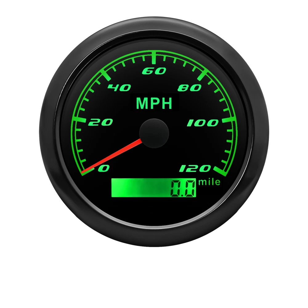 85mm GPS Speedometer 0-120MPH Gauge for Car Truck Motorcycles Boat Waterproof 85mm GPS Speedometer Gauge Odometer 0-120 MPH 7 Colors LED for Car Boat Motorcycle Specifications: Dial: Black Material: Stainless Steel 316L Bezel + Anti-fog Glass Install Diameter: Φ85mm or 3-3/8" Signal: GPS Working Voltage: 9~32V DC Working Current: ≤100mA Operating Temperature: -30℃ ~ 75℃ Storage Temperature: -40℃ ~ 85℃ Size: 12x8x12cm / 4.72x3.1x4.75 inch IP67 waterproof and dustproof grade Indication Range: 0-120 MPH Backlight:7 Colors Backligt Product Descriptions High-brightness LED backlight. 316 stainless steel for long-term use even in acid-base, humid environment. IP67 waterproof and dust-proof grade. With curved glass( with anti-fog function). Suitable for all kinds of vehicle modification. Using stepper motor drive pointer, accurate display of the engine speed, and with the LCD display clear display mileage. Gauges have many kinds backlight color (red,yellow,orange,green,blue,purple,white),customers can adjust any color that you like. Package Includes: 1X 85MM Digital GPS Speedometer Gauge 1X Instruction 1X GPS Antenna