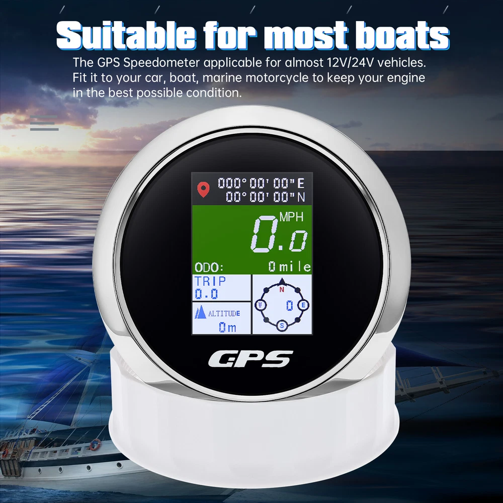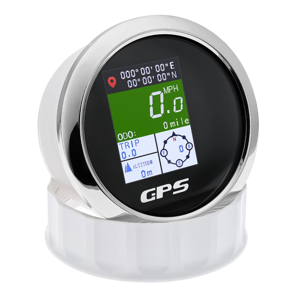 85mm Waterproof GPS speedometer Odometer Gauge For Car Truck Motorcycle Boat 85MM Digital GPS Speedometer Odometer Gauge for Marine Boat Car Waterproof NEW Feature: High-brightness LED backlight. 316 stainless steel for long-term use even in acid-base, humid environment. IP67 waterproof and dust-proof grade. With curved glass( with anti-fog function). Suitable for all kinds of vehicle modification. Using stepper motor drive pointer, accurate display of the engine speed, and with the LCD display clear display mileage. Specification Basic description of the instrument: Speedometer display range: 0-999,9mph Total mileage display range: 0-999999mph Indication range of daily kilometres: 0-999,9mph Digital compass: 0-359° Longitude and Latitude ODO: Accumulated mileage power outage data can be saved TRIP: Single mileagezero power down COG: Digital Compass Cog: heading, direction of travel (middle COG is accurate to a specific degree) Three unit can be swicthed: knot; mph; km/h (By touching the button on the back of the instrument, knot, MPH, km/h units can be switched and automatically saved.) Degree of Protection: IP67 Backlight: TFT Screen Input Parameter: GPS signal GPS antenna length 3 meter Dimensions: 85mm diameter (3-3/8'') Package Include: 1*GPS Speedometer 1*GPS Antenna 1*Multi-plug socket 1*Instruction Notes: 1. Please allow 1-3 CM differs due to manual measurement. 2. As different computers display colors differently, the color of the actual item may vary slightly from the above images. Thanks for your understanding.