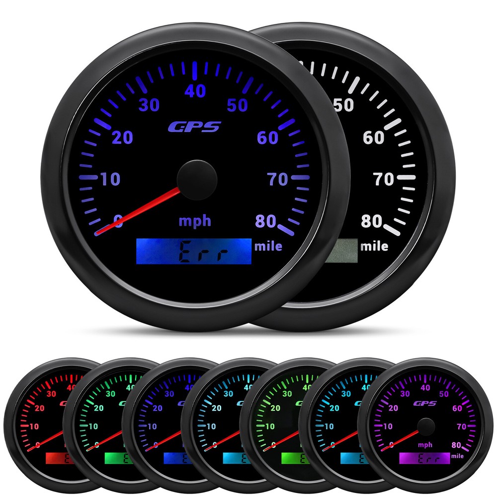 85mm GPS Speedometer 0-80MPH Tachometer Waterproof for Marine Boat Car Truck US 6 Gauge Set 85mm GPS Speedometer 0-80MPH Tachometer & 52mm Fuel Gauge Water Temp Oil Press Volt 7Colors LED For Car Boat Feature: High-brightness LED backlight. 316 stainless steel for long-term use even in acid-base, humid environment. IP67 waterproof and dust-proof grade. With curved glass( with anti-fog function). Suitable for all kinds of vehicle modification. Using stepper motor drive pointer, accurate display of the engine speed, and with the LCD display clear display mileage. Gauges have many kinds backlight color (red,yellow,orange,green,blue,purple,white),customers can adjust any color that you like Product Detail GPS Speedometer Gauge Install Diameter: Φ85mm or 3-3/8" Signal: GPS Working Voltage: 9~32V DC Size: 12x8x12cm / 4.72x3.1x4.75 inch Indication Range: 0-80MPH Backlight:7 Colors Backligt Tachometer Engine hours: 0.0-99999.9H Backlight :7 Color backlight Indicating Range: 0~8000 RPM Signal : Pulse For Tachometer, you can substitute for different unit, please contact us before / after purchase or note on the order. Tachometer: 0-3000rpm/0-4000RPM/6000RPM/7000RPM Volt Gauge Sizes: 52 mm (2-1/16") Measuring Range: 8 - 16 (V) Backlight: 7 Colors Fuel Level Gauge Sizes: 52 mm (2-1/16") Measuring Range: Empty - Full Resistance: 240 (E) - 33 (F) ohms NOTES: 240-33ohms fuel level sensor only fit for 240-33ohms fuel gauge Backlight: 7 Colors Water Temperature Gauge Install diameter: Φ52mm Indication range: 0~120/30-250 Input signal: 287.4~22.4 ohm Storage temperature: -40~+85 Backlight: 7 Colors Oil Pressure Gauge Install diameter:Φ52mm or 2-1/16" Indication range:0~10bar / 0-150 PSI Operating temperature:-30~+75 Storage temperature:-40~+85 Backlight: 7 Colors Package Includes: 1X 85MM Digital GPS Speedometer Gauge 1X GPS Antenna 1X 85MM Tachometer 1X 52MM Fuel level gauge 1X 52MM Voltmeter 1X 52MM Water temp gauge 1X 52MM Oil pressure gauge Installation Instruction