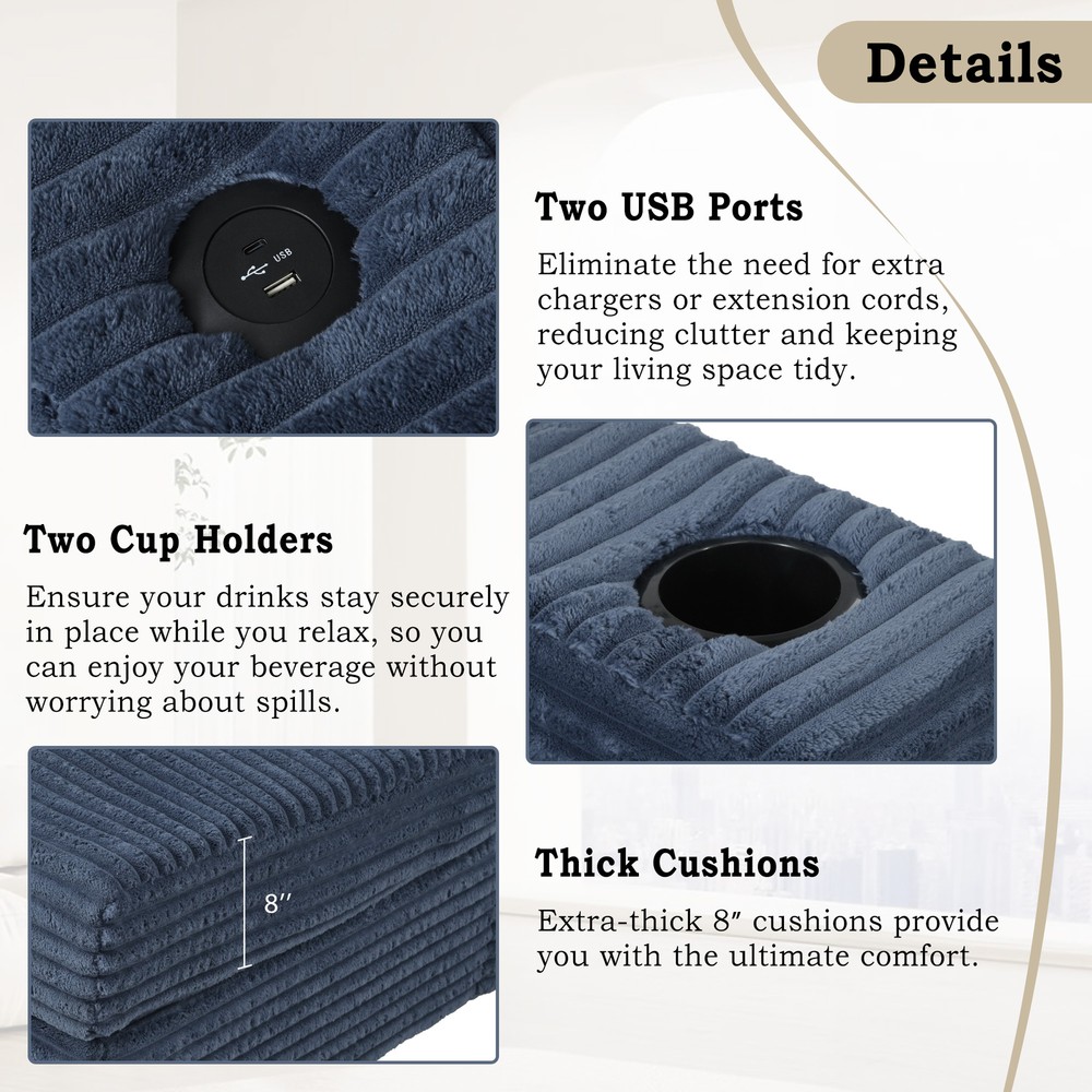 Multi-functional Chaise Lounge Sofa – This versatile chaise lounge can be used as a cozy loveseat in the living room or as a relaxing lounge sofa in the bedroom. Its design comfortably accommodates two people, making it perfect for temporary seating when guests visit. The thoughtful design also includes two small pillows, which can be arranged to suit your preferences. Thoughtful Design – This chaise lounge sofa is equipped with two convenient cup holders, ensuring your drinks stay securely in place while you relax. Whether it's a cup of coffee, a glass of juice, or even a refreshing iced tea, you can enjoy your beverage without worrying about spills. The thoughtfully designed cup holders provide easy access to your drinks, so you can unwind and stay r... 86.5" Oversized Loveseat Chaise Lounge Sectional Sofa Bed Corduroy Sleeper Sofa with Two USB Ports , Two Cup Holders and Two Throw Pillows for Living Room and Bedroom, Blue Multi-functional Chaise Lounge Sofa – This versatile chaise lounge can be used as a cozy loveseat in the living room or as a relaxing lounge sofa in the bedroom. Its design comfortably accommodates two people, making it perfect for temporary seating when guests visit. The thoughtful design also includes two small pillows, which can be arranged to suit your preferences. Thoughtful Design – This chaise lounge sofa is equipped with two convenient cup holders, ensuring your drinks stay securely in place while you relax. Whether it's a cup of coffee, a glass of juice, or even a refreshing iced tea, you can enjoy your beverage without worrying about spills. The thoughtfully designed cup holders provide easy access to your drinks, so you can unwind and stay refreshed, all while keeping your living space neat and organized. Made for Convenience - The chaise lounge sofa with two built-in USB charging ports offers ultimate convenience by allowing you to charge your devices while you relax. It eliminates the need for extra chargers or extension cords, reducing clutter and keeping your living space tidy. With easy access to charging without leaving the comfort of your sofa, you can stay connected, enjoy entertainment, or reply to messages without worrying about running out of battery. Thick Cushions - This chaise sofa is designed for ultimate comfort, featuring extra-thick 8” cushions that are filled with a combination of high-density foam and spring pockets. The high-density foam offers excellent support, while the spring pockets ensure consistent, pressure-relieving comfort throughout the seating area. Together, they create a luxurious and supportive experience, providing full-body comfort whether you're lounging, reading, or watching TV. Soft Corduroy Upholstery - The chaise sofa is upholstered in premium, high-quality corduroy fabric that combines durability with a luxurious touch. Its rich, tactile finish enhances both comfort and style, making it the perfect blend of practicality and elegance for your living room. Item Specifics Brand Unbranded Type sofa Color Blue Upholstery Fabric Corduroy Item Length 71.5 in Item Width 23.00 in Item Height 20.00 in About us Dear buyer, Thank you for visiting my store! Our warehouses are located in many regions around the United States. According to the customer's delivery address. Use USPS/UPS/DHL logistics transportation service. Prioritize the best quality logistics solutions to transport packages. Ensure package delivery time, At the same time. Have any after-sales problems, Feel free to contact us. At your service Payment PayPal is our preferred method of payments it's the quickest, easiest and most secure way to pay for your goods or services online. PayPal offers buyer and seller protection should there be a problem. If you do not have a PayPal account, to get started and buy your first item with us is very easy. Simply click on the 'Buy It Now' button and follow the eBay checkout steps. Select PayPal as the payment method you then will be given the chance to enter your card details in to PayPal's secure checkout in order to pay for your order. Shipping 1. Your purchase is shipped directly to you as soon as we have received your cleared payment. 2. Normally all of parcels would be shipped within 3days(From Monday to Saturday). 3. We will send information on eBay or email if the parcel was delayed due to our holiday. 4. We provide three kinds of shipping for choice. Shipping way depend on delivery address. Returns If an unit is received defective, of course we take it back or replace it. If the unit is received as expected, we must charge for our expenses if you want to send it back. We have to charge for the work of handling, retesting and restocking. DESCRIPTION PAYMENT SHIPPING RETURN POLICY CONTACT US Shop Category Store Home Other Hot Item Fox DropFrame Pro Mips 2.0 Bike Helmet USD 279.95 Flextreme 5/8 in. Dia x 50 ft. Black Performance Rubber Garden Hose USD 46.70 6 cu. ft. Steel Tub Wheelbarrow with Wooden Handles and Pneumatic Tire USD 113.90 5.5 cu. ft. Heaped Poly Smart Plastic Garden Cart USD 70.98 Co-op Cycles DRT 1.1 Mountain Bike USD 419.29 Delivery New List Item COOLMORE Corduroy Swivel Barrel Chair, Comfortable Accent Sofa Chair for Living USD 548.52 COOLMORE Corduroy Swivel Barrel Chair, Comfortable Accent Sofa Chair for Living USD 548.52 COOLMORE Corduroy Swivel Barrel Chair, Comfortable Accent Sofa Chair for Living USD 548.52 COOLMORE Corduroy Swivel Barrel Chair, Comfortable Accent Sofa Chair for Living USD 548.52 COOLMORE Corduroy Swivel Barrel Chair, Comfortable Accent Sofa Chair for Living USD 548.52 Help & Info Payment Policy Shipping Policy Return Policy FAQ About Us 86.5" Oversized Loveseat Chaise Lounge Sectional Sofa Bed Corduroy Sleeper Sofa with Two USB Ports , Two Cup Holders and Two Throw Pillows for Living Room and Bedroom, Blue Multi-functional Chaise Lounge Sofa – This versatile chaise lounge can be used as a cozy loveseat in the living room or as a relaxing lounge sofa in the bedroom.