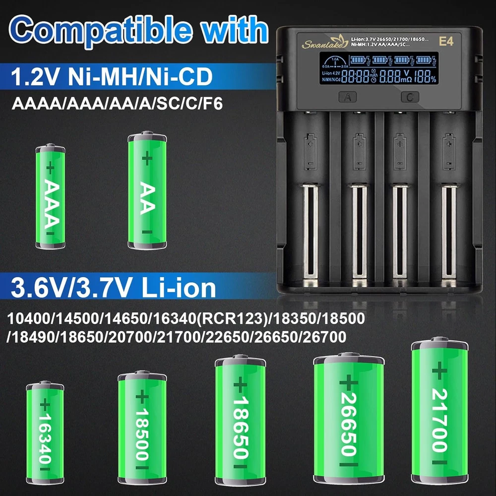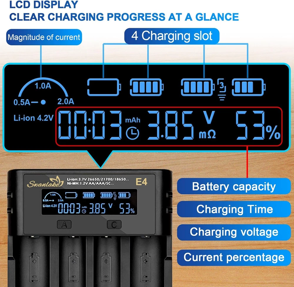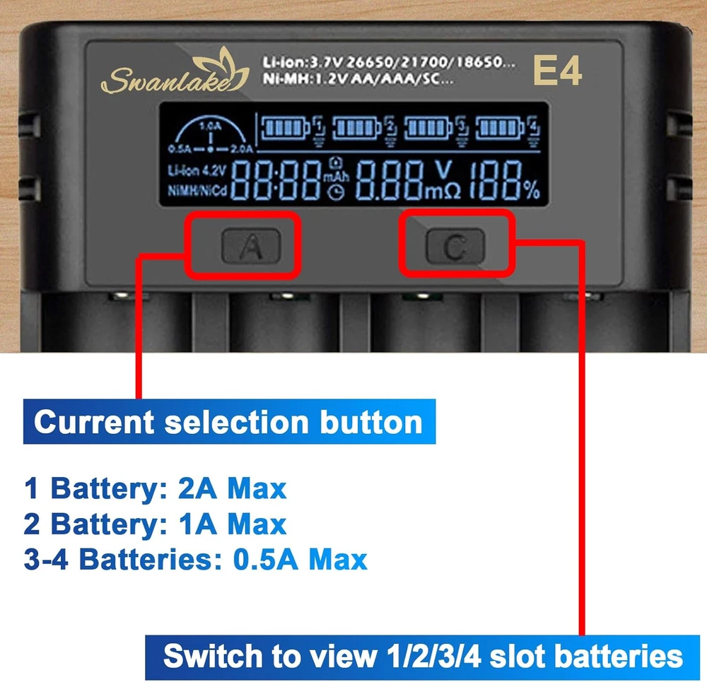4 bay 18650 battery charger:Compatible with 3.7v Lithium li-ion rechargeable batteries 18650 26650 21700 18350 16340(RCR123) 10440 17670 18490 17500.And 1.2V/Ni-mh/Ni-cd batteries AAAA AAA AA A.The charger will automatically recognize the battery type Lithium Battery Charger: The 18650 battery charger has an LCD display, The button C switches the monitoring status, which can display the charging voltage, charging time, charging capacity, and charging progress% of each charging slot. Button A switches the charging current 0.5A/1A/2A, the 2500mAh battery can be fully charged in 1.5 hours Safety Protection: Safe and fire prevention PC+ABS material Battery Charger, Built-in intelligent circuits protection to protect the battery safety charged. A protection against short circuit, overheat, over-voltage and over-discharge. Distinctively, the discharging function can decrease the hurt of battery, making it more efficient Portable And Compact: 4 Slot Battery Charger Design Can Charge 4 Different Batteries At The Same Time, Equipped With 3 Input Ports: USB-C / Lightning / Micro, It Becomes Your Best Travel 18650 Universal Charger. Note: Only Charger,No Battery PREMIUM SERVICE: If you have any questions, please tell us at first time. We will provide professional service to solve your problems. There is a totally risk-free purchase. Product Description 18650 Battery Charger,LCD Display Smart Universal Charger for 3.7v Lithium Li ion Rechargeable Battery 26650 21700 18650 RCR123A,NiMH NiCd AAA AA A/C Smart button The button C switches the monitoring status, which can display the charging voltage, charging time, charging capacity, and charging progress% of each charging slot. The Button A switches the charging current 0.5A/1A/2A, the 2500mAh battery can be fully charged in 1.5 hours 4 bay 18650 battery charger Compatible with 3.7v Lithium li-ion rechargeable batteries 18650 26650 21700 18350 16340(RCR123) 10440 17670 18490 17500.And 1.2V/Ni-mh/Ni-cd batteries AAAA AAA AA A.The charger will automatically recognize the battery type.