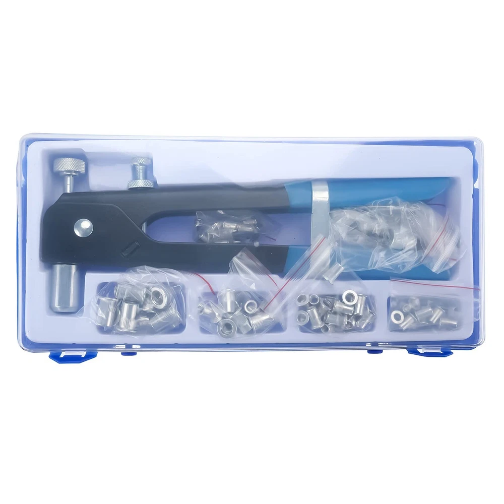 86pcs Hand Rivet Tool Nut Setter Kit, Thread Blind Riveting Tools, Wrench Nut Sert, Riveter Threaded Insert Tool with Metric Rivet Nuts Assortment M3 M4 M5 M6 M8 Product Details Manufacturer: Ruichen Brand: BTSHUB Item Weight: 2.5 pounds Product Dimensions: 7.87 x 5.91 x 3.15 inches Country of Origin: China Item model number: BT0324 Manufacturer Part Number: BT0324 Date First Available: August 11, 2021 4-Size Size of nut rivet mandrels: M3/M4/M5/M6/M8. 80pcs aluminum Ribbed Rivnuts, M3(20pcs), M4(20pcs), M5(20pcs), M6(10pcs), M8(10pcs). Includes wrench to hold handles and adjust mandrels.The tool can only be used for aluminum alloy nuts, not suitable for Steel nuts Sturdy Material: Casting in high-strength steel, this hand pulls blind nut riveter is strong, rustproof, and reliable. A robust, ergonomic high-quality PVC-covered non-slip handle, has a good heat treatment for superior strength. Rivet nuts are made from aluminum alloy which provides strength, corrosion protection, and long service life With open-end, small flange, round hole, threaded inner wall, and partial anti-skid surface, these flat head rivet nut has a good performance of fastener function Wide Usage: used for installing aluminum threaded riveting nuts at the home, shop, and farm, suitable for repair work on cars, boats, furniture, and machines Package includes: 1 x Nut Rivet Tool(Including Wrench); 20 x M3 Threaded Rivet Nut Inserts; 20 x M4 Threaded Rivet Nut Inserts; 20 x M5 Threaded Rivet Nut Inserts; 10 x Threaded Rivet Nut Inserts; 10 x Threaded Rivet Nut Inserts; 5 x Nut Rivet Mandrels: M3/M4/M5/M6/M8; 1 x Instruction Manual; 1 x Tool Box