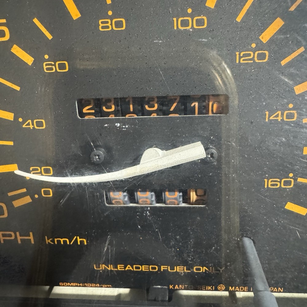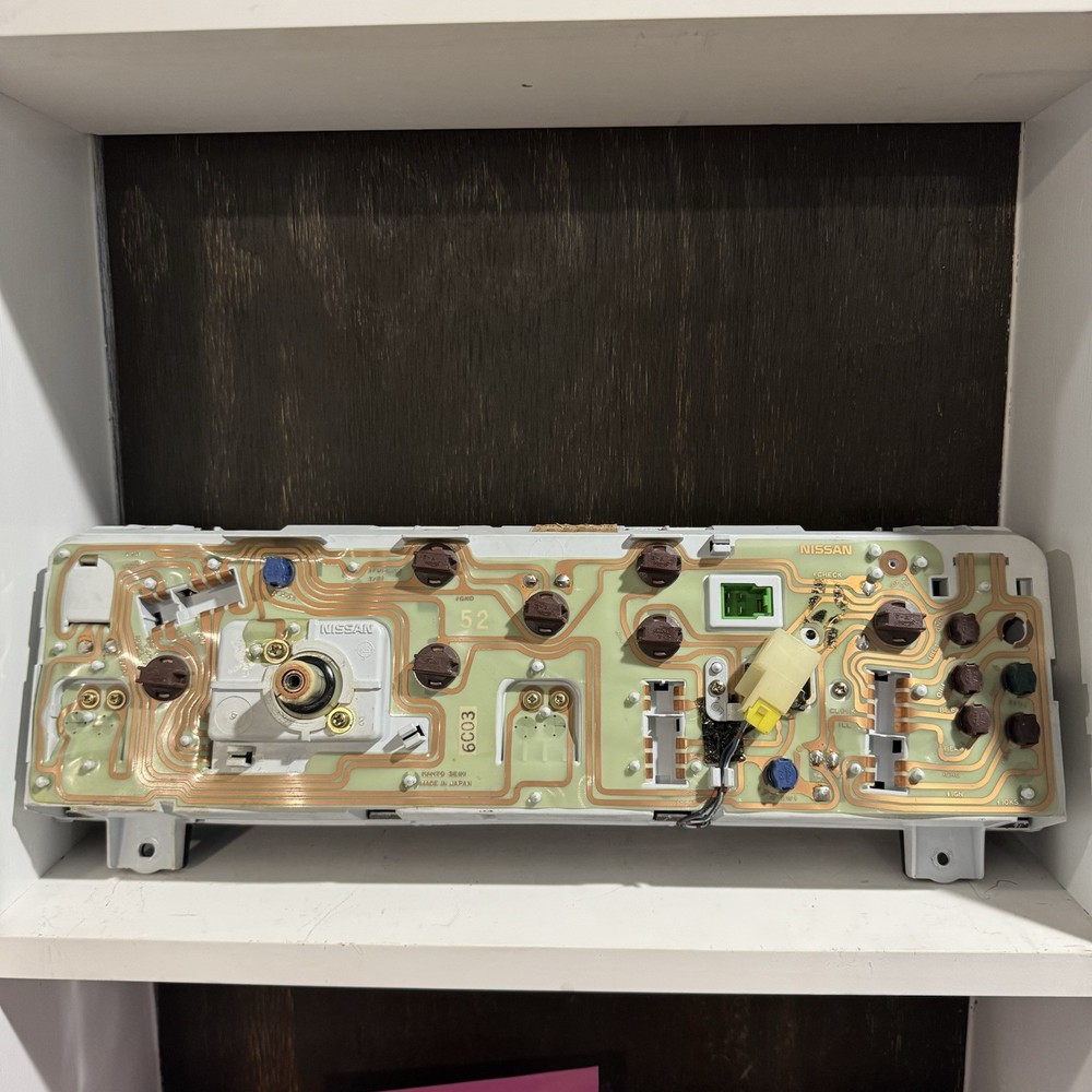 This product is an OEM Genuine Nissan speedometer cluster for a 89-92 Nissan Pathfinder Hardbody D21 Pickup Truck. It is a vintage part with a black color and yellow needle. The cluster includes the speedometer as well as other gauges and features such as illumination and a clock. Made of plastic, this instrument cluster is a direct replacement with a maximum speedometer value of 105 mph. Manufactured in Japan, this vintage/ classic style speedometer is a performance part that fits the specific vehicle model. With Clock With Trip Meter