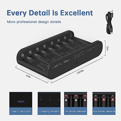 Faster Charging & Intelligent Operation:The R8 Air battery charger is designed for speed and intelligence. It charges faster than ever, and operates with smart, fully automatic features 8 Independent Charging Slots:The R8 Air battery charger offers 8 independent battery slots. This means you can simultaneously charge 8 batteries of varying sizes and types. It's a compact powerhouse that ensures efficient charging for your batteries Multi-Functional AA AAA Smart Charger:This charger automatically detects battery types and configures the appropriate charging method. It's compatible with various battery types, including eneloop, panaloop, NiMH, NiCad, Li-Ion, and LiFePO4 batteries Full-Color LED Indicator:The LED indicator provides clear information on battery status, ensuring you're always in the know about your charging progress APP Connection:Connect the battery charger to the app using Bluetooth. This app offers instant updates on power levels and charging status. You can preset battery type and charging current, and easily update firmware through the app, ensuring you're always equipped with the latest features and improvements