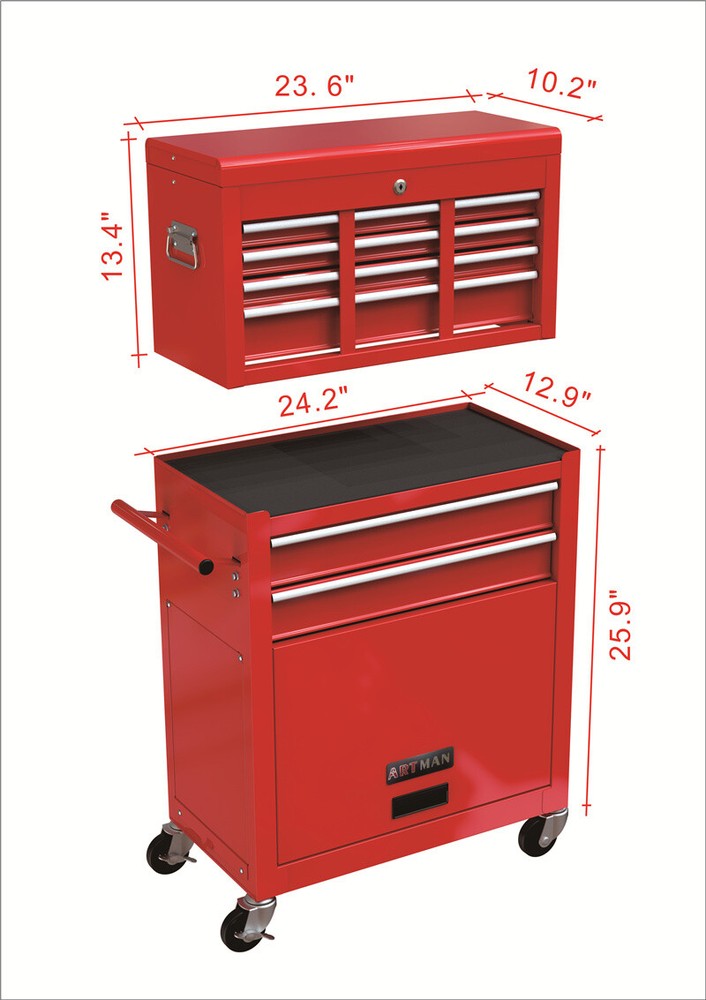 Item Length: 24.20 in Size: Large Color: Red Item Height: 42.80 in Item Width: 13.00 in Type: Tool Cart Country/Region of Manufacture: China Brand: ARTMAN Item Weight: 61.70in Features: Stackable, Wheels, With Handle, Anti-rust Powder Coating, Heavy Duty, Mobile&Detachable Number of Drawers: 8 Material: Stainless Steel Number of Items: 1
