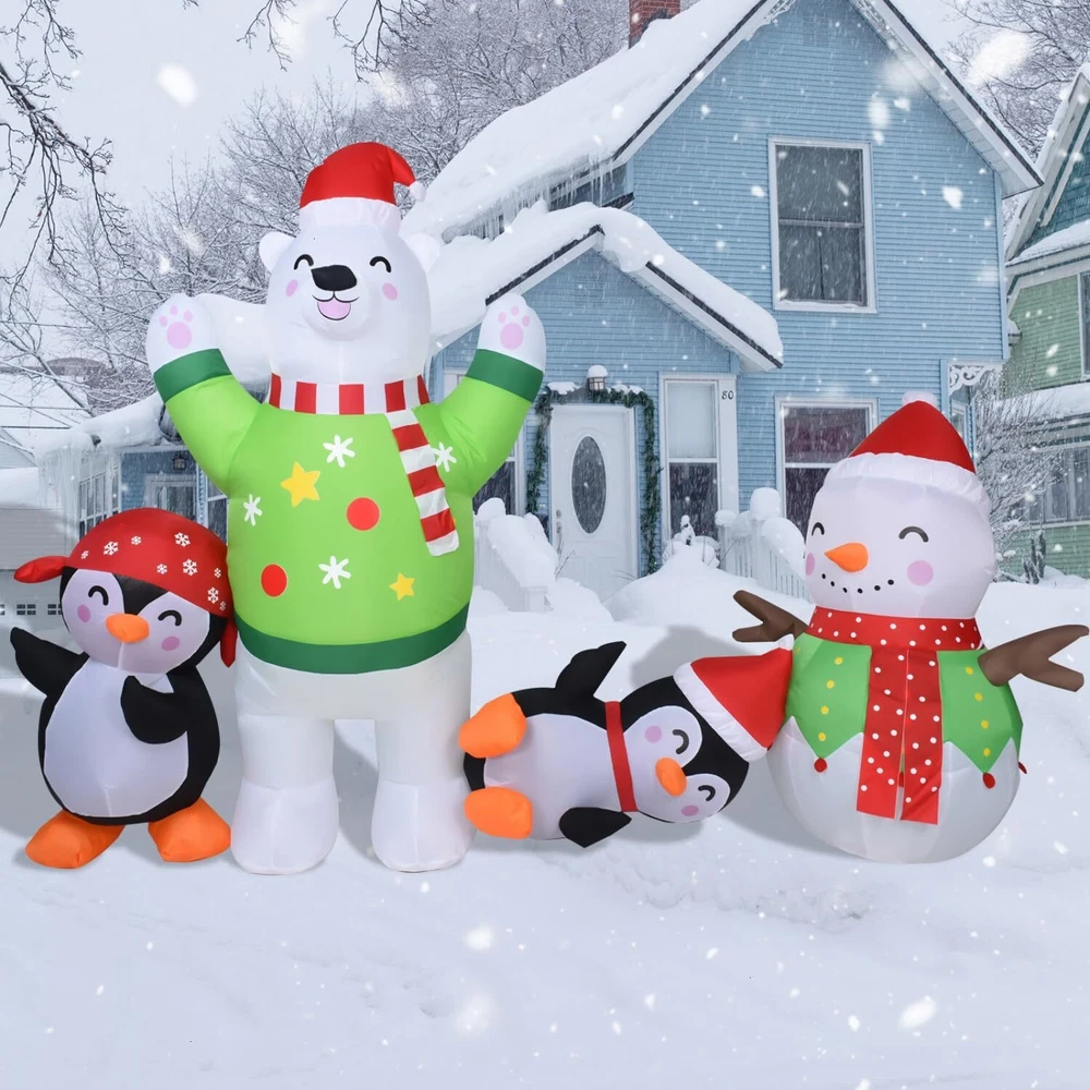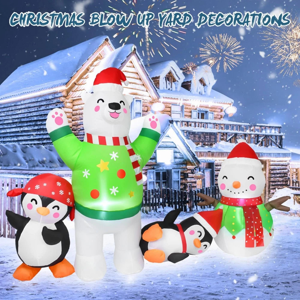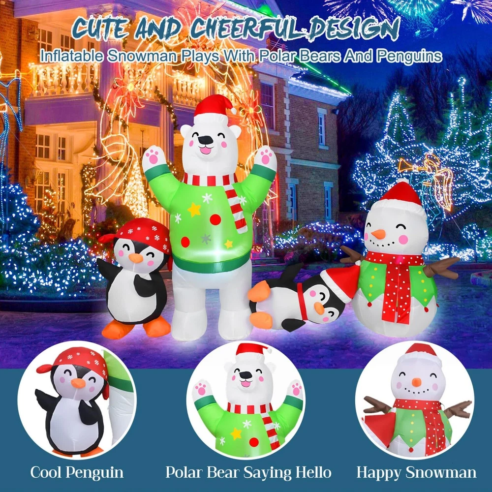 8FT Christmas Inflatable Outdoor Decoration Inflatable Snowman Plays with Penguin Polar Bear Christmas Decorations Outside Blow Up Christmas Decorations Outdoor Christmas Inflatables for Yard Cute And Festive Christmas Decorations: The Christmas outdoor inflatables are made up of snowmen, polar bears and penguins in different shapes. Cute & charming. Christmas decorations create a strong festive atmosphere and are deeply loved by kids High Quality: Christmas blow up yard decorations made of high-quality polyester, weatherproof and fade resistant. Equipped with 2 windproof ropes and 4 ground stakes, and built-in sandbags to ensure a more stable stand when used outdoors Super Bright LED Lights: The Christmas yard inflatables decorations are Built-in super bright LED lights, 8 FT long. Illuminate your lawn garden house at night and make your yard more eye-catching. Kids and adults alike will love it Quick Inflatable: Our outdoor inflatable christmas decorations are equipped with a powerful built-in fan, just plug it into the socket and in seconds you will have a glowing inflatable Christmas decoration. Easy to install and disassemble Perfect Christmas Gift: Perfect for Christmas outdoor decorations. You can place it in your garden, front, backyard or party, etc. to give your friends and family a stronger Christmas atmosphere. Can also be used as Christmas gifts
