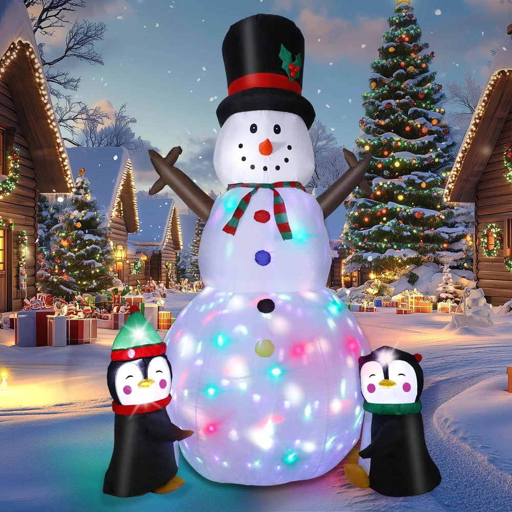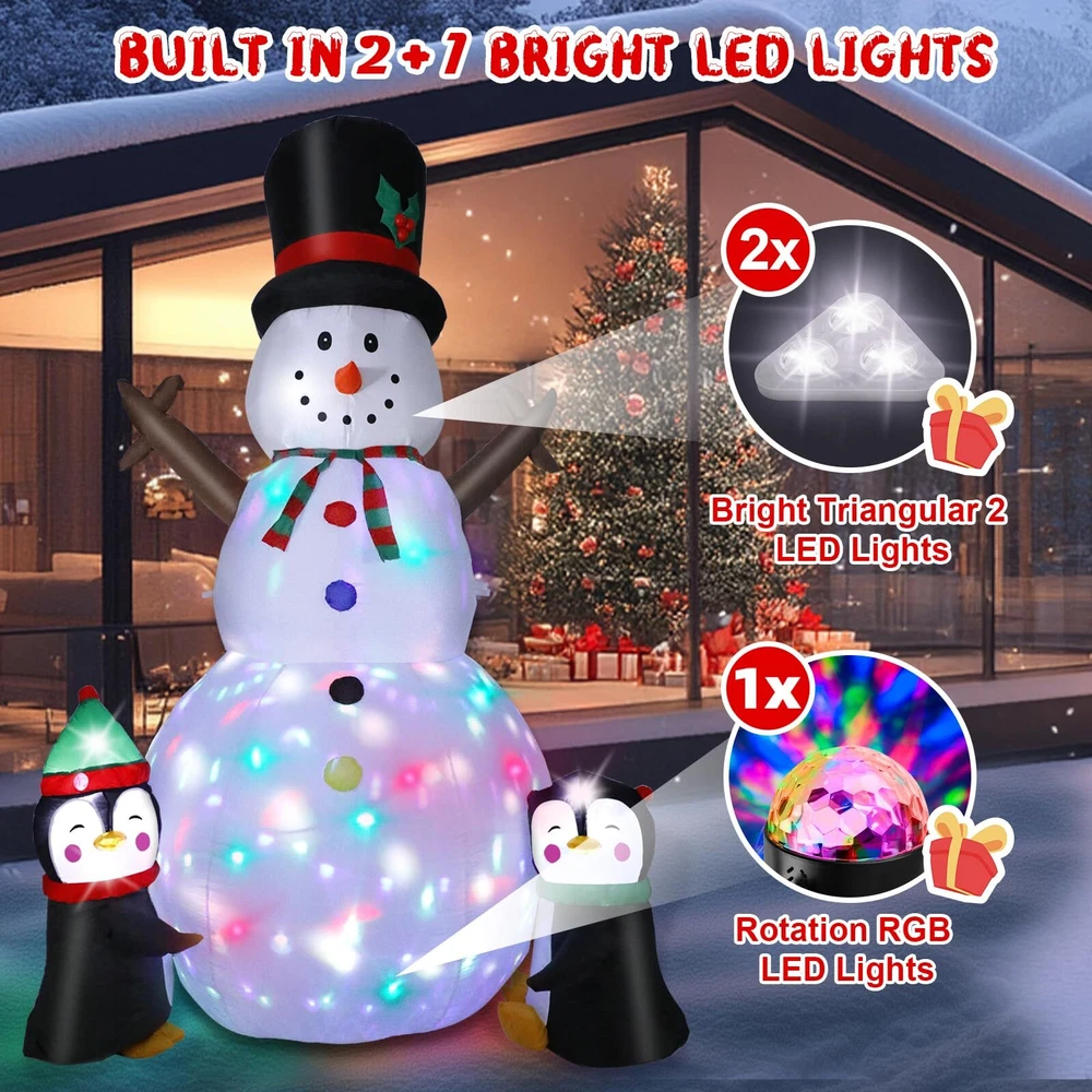 Inflatable Christmas snowman with 2 cute penguins-Inflating in minutes when plugged into any stanadard electrical outlet. Great for Any Occasion: Wonderful for yard decoration, home, garden, lawn, holiday, indoor, outdoor Christmas decorations. The festive atmosphere of Christmas will revolve around your family. Specifications: Material: Polyester Fabric Model: RH-120-1250U4-1 Product Size: Height: 243.8cm/8FT, Length:150cm/4.9FT, Width:85cm/2.79FT Power Cord Length: 2m Package Included: 1 * Inflatable Snowman with Two Penguins 4 * Stakes 2 * Ropes 1 * Blower 1 * Power Adapter 1 * Instruction Manual Note 1. Be sure the zipper is full closed before inflating 2. Do not put anything into the blower. 3. Do not place the plug in the rain or snow, which will cause a short circuit. 4. Turn the blower outlet towards the product so that it will inflate much faster. 5. Please dry before storage. 6. Please keep away from sharp tools when inflating. 7. Protect the blower and power cord from water, fire, and severe weather. 8FT Christmas Inflatable Snowman: giant snowman wears an exquisite hat and a pretty scarf, and two adorable penguins hug him, adding a touch of liveliness and charm to the overall design. Its towering size and cute appearance instantly attract children and neighbors' attention. Dazzling Colorful LED Lights: Our inflatable snowman is built-in multicolored LED lights, as if it comes to life in a kaleidoscope of colors. The enchanting lights can rotate and caste a warm and inviting glow that beckons everyone to gather 'round and soak in the holiday spirit. Superior Quality Materials: Made of high-quality waterproof polyester cloth, weather-resistant, fade-resistant, ensuring it remains vibrant and eye-catching even in rainy or snowy conditions, providing years of joyful celebrations. Besides, the UL listed adapter ensures safety for outdoor use. Quickly Inflation & Well Steady: The powerful blower can make the inflatable snowman blow up in minutes once plug into an outlet. Come with 4 ground stakes and 2 ropes for added stability, even sewed 3 pockets for sandbags inside to ensure it stands firmly even in windy weather. Perfect Outdoor Christmas Decorations: Our Xmas inflatable snowman is great choice for yard, garden, lawn, indoor/outdoor holiday party, Christmas night event, amusement park and shopping mall etc. You can also give it as a Christmas gift to your family and friends to celebrate Christmas together!