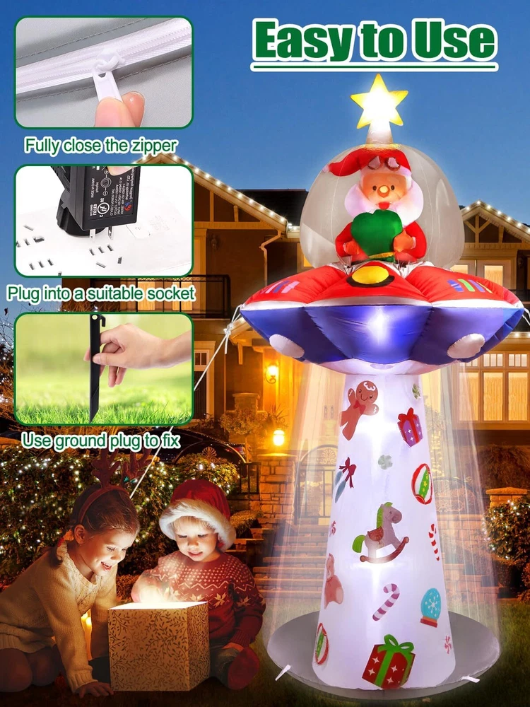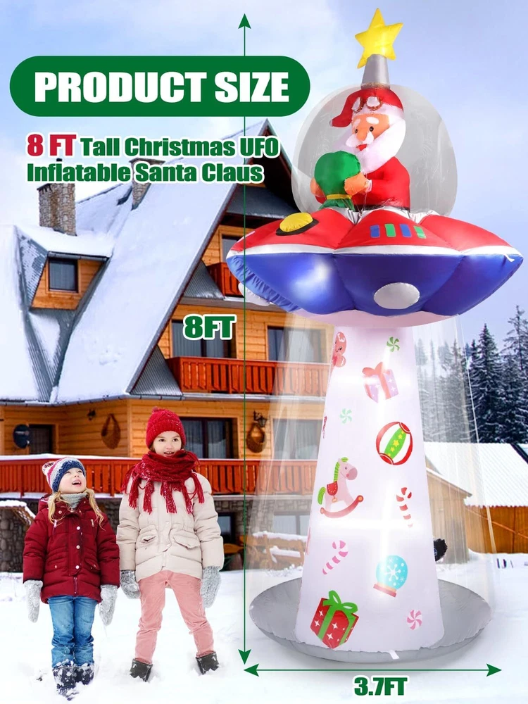 8FT Christmas Santa Claus UFO Blow Up Decoration with Built-in LED Lights for Outdoor and Indoor Feature: 1.Santa Claus inflatable decoration are made of high quality, polyester material, reliable and reusable, sturdy and watertight, easy to use and strong, not easy to break, tear or fade. 2.The unique design style, Santa Claus riding a UFO spaceship, full of childlike appearances, is charming and Imaginative. 3.In a short time, the Christmas Inflatables UFO Santa can be inflated and stand up. Turn on the switch to light up the night, enjoy yourself and guests. Package Includes: 1 x Blow up UFO Santa Claus 5 x LED lights 6 x Ground stakes 2 x Carabiners clips 2 x 2.5 Meters long ropes 1 x Sand bag 1 x UL adapter 1 x Built-in fan 2 x Patch Specification: Type: UFO with Santa Claus Inflatable Material: Watertight polyester and pvc Color: Red, green, white, blue,yellow Size: App.3.8ft long x 3.8ft wide x 8ft tall (Please allow 1-3cm error due to manual measurement. please make sure you do not mind before you want.) How to Inflate: 1.Be sure the zipper is closed in order to figure to fully inflate 2.Plug in and allow to inflate 3.Secure tethers and stakes 🎅🏻【Christmas Inflatables Outdoor Decorations】Eye-catching design 8FT high Christmas Santa Claus on UFO yard decoration, is perfect for Christmas use indoor or outdoor decor, Christmas party and Christmas haunted house. Use it for a party, stage prop, office, yard and more. Light up the night with the internal LED light and give the scenes a glowing spirit. Bring extra holiday cheer to your home and yard. 🎅🏻【Built-in 5 LED Lights】The Christmas inflatables UFO Santa Claus holding a gift bag outdoor decorations build-in eye-catching white LED Lights glow in the dark, creating a very festive and imaginative atmosphere, catching your eyes at the first sight. 🎅🏻【Watertight & Sturdy】Christmas yard inflatables is made of high strength watertight material which is sturdy, reliable and reusable against rips and tears, the excellent stitching improves the durability of the inflatable decoration. In addition, this outdoor inflatable is providing with a powerful-duty blower to continuous airflow inflate the decoration, it also come with a storage box for you. 🎅🏻【Easy to Inflate & 】Inflate the blow up Christmas decorations until there is enough air inside. Then fix it to the ground with stakes and sand bag to keep stable. Zip up the bottom zipper to avoid air leakage or open the zipper for fast deflation, and it is easy to fold up and after holiday. 🎅🏻【Perfect Size & Components】The Christmas Santa Outdoor Indoor Decorations, is 3.8ft long x 3.8ft wide x 8ft tall. Except the blower, transformer and storage box, it comes with 6*stakes, 2*hook up, 2*8.2ft ropes, 2*patch and 1* sand bag to secure it on the ground or wall. No worries about if the Santa Claus inflatable might fly away by the wind.
