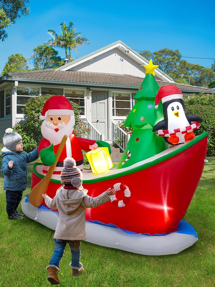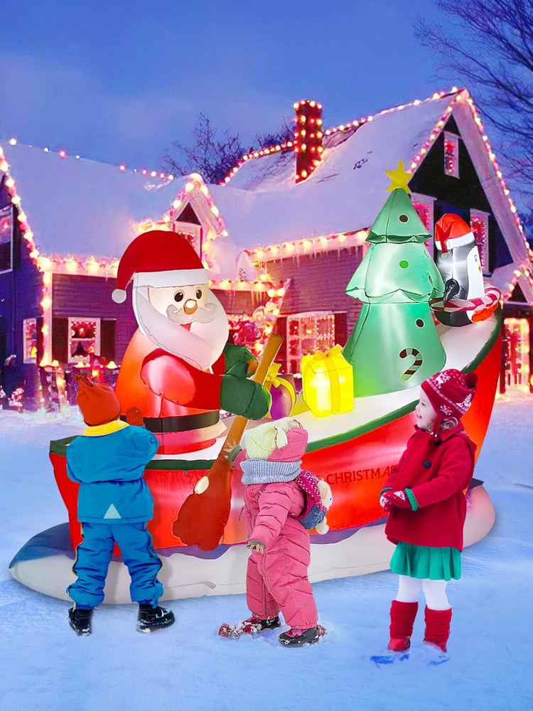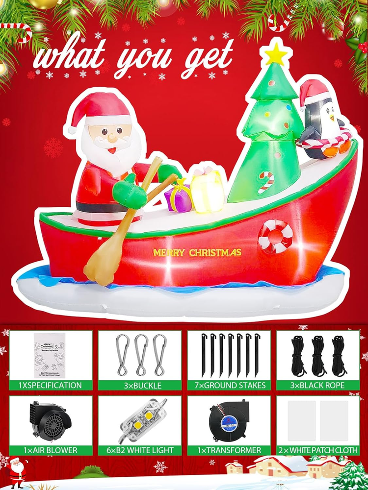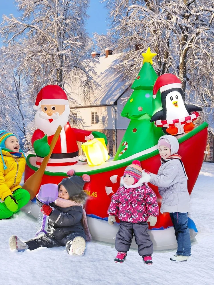 Warm & Cute Design: Santa Claus is rowing, with Christmas trees and gifts on the boat, and a cute little penguin. Putting our Christmas inflatable outdoor decoration into your yard will definitely look particularly warm, especially suitable for Christmas decoration! Durable Material: The Christmas inflatable decoration is made of polyester, it is reusable and fade resistant. The lightweight material make the inflatable decoration not take up space after deflation, you can place it easily! Eye-Catching Light: Christmas inflatable have built-in 6pc LED lights to make our inflatable look more real. It can light up the yard and easily attract the guest’s attention. You can enjoy your Christmas party! Stable Components: 3pcs 5FT black PP ropes, 7pcs plastic ground plug, and 3pcs metal buckles in our package, which can fix the decorations to the ground firmly. Don't worry that this inflatable tombstones decoration will fly away with the wind. Perfect Christmas Outdoor Decorations: You can place it outdoor, such as yard, garden, lawn, patio, etc. Decor your house out with this cute decoration, it will light up your yard and welcome your neighbors. Package Includes: 1 PCS Inflatable decoration 7 PCS Plastic ground stakes 3 PCS Black ropes 3 PCS Metal buckles 6 PCS B2 light Specification: Item Type: Inflatable Outdoor Holiday Decorations Shape: Boat Color: As picture shown Feature: - It is especially suitable for Christmas party and Christmas yard decoration. - LED lights can bring better night viewing effects. - Made of high-quality material, the holiday decoration is recyclable and safe to use. Note: 1.Do not get close to the sharp objects to avoid air leakage problems happen. 2.Please don't use it on a windy and heavy rainy day. 3.Do not leave it outdoors for a long time in bad weather. 4.Zip up the bottom zipper to avoid air leakage.