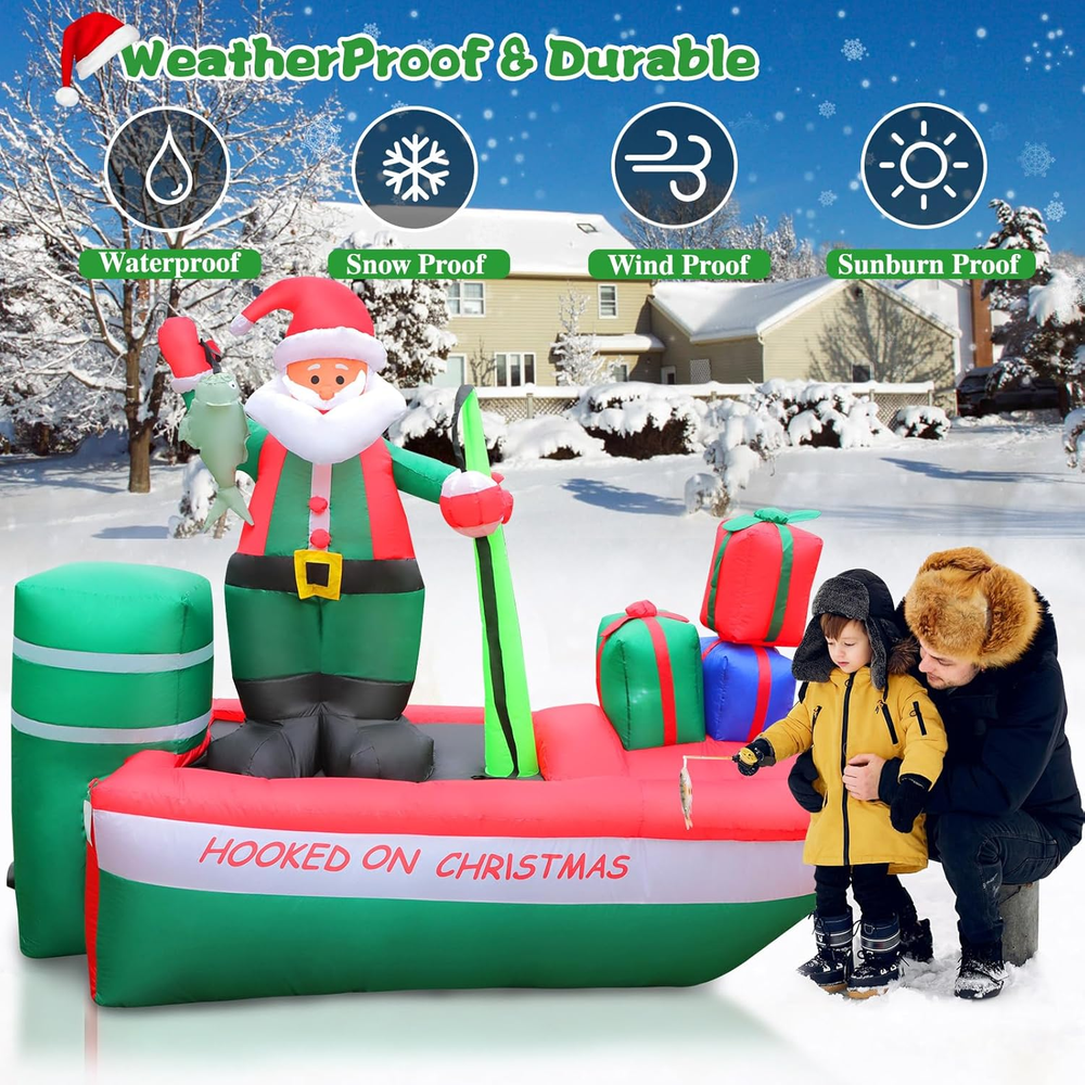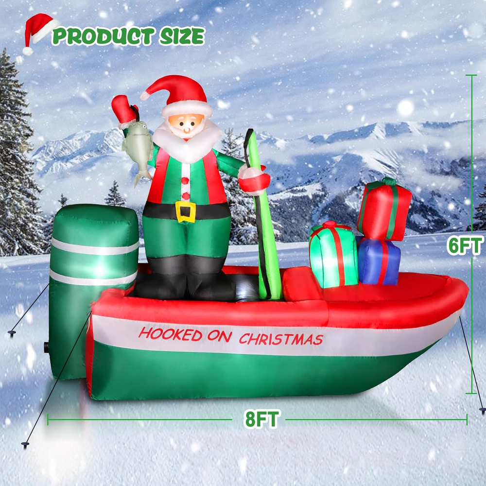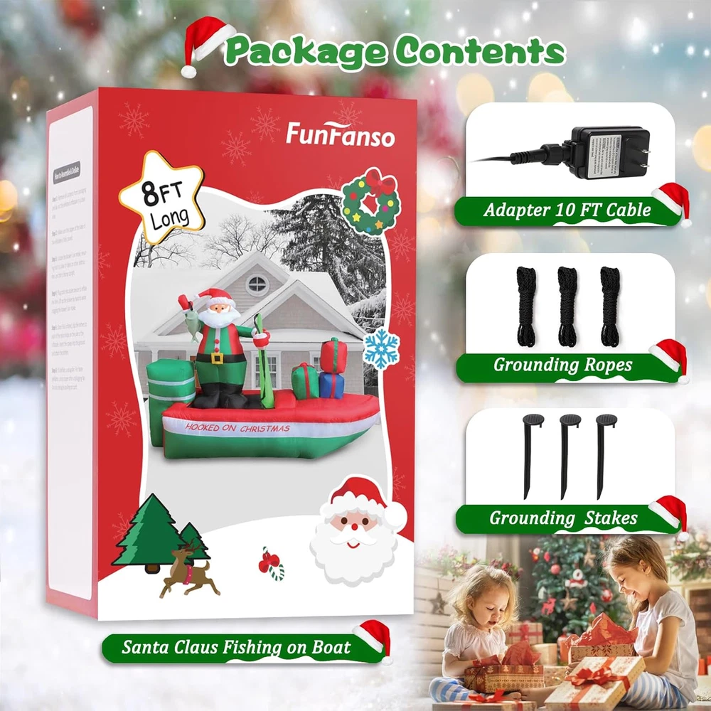 🎅【UNIQUE CHRISTMAS DECORATION】 - Inflatable Christmas santa is standing on a fishing boat with a lot of gift boxes on board, Santa is holding a fish in his hand and happily greeting guests. When your family or guests come to your home or garden, they will be attracted by this novelty inflatable Christmas santa decoration and happily respond to santa's greeting. Perfect for winter Christmas outdoor yard decorations, Christmas event decorations, holiday parties, Christmas Eve night decorations. 🎅【BUILT-IN LED LIGHTS 】- This 8FT long blow up santa fishing has built-in bright white strip of lights that will look sparkling and beautiful even on a dark night. Suitable for front yard, lawn, garden, patio, balcony, Christmas party, it adds an eye-catching centerpiece to your holiday seasonal layout and welcome your guests with warm wishes. 🎅【EXCELLENT CRAFTING 】 - FunFanso Giant Inflatable santa claus fishing on boat is made of IP44 waterproof 190T high-density thick polyester material, which is very wrinkle-resistant and not easy to be pierced by sharp and hard things. Tight stitching increases the durability of this inflatable Christmas yard decoration. With a 10 foot power cord, you can flexibly inflate the inflatable santa fishing near your house, or add an extension cord to decorate anywhere in your yard. 🎅【STABLE ENOUGH】- This beautiful inflatable santa fishing on boat comes with 3 stakes, 3 ropes, and built-in sandbags to hold this inflatables firmly in the ground. In addition, to enhance the Christmas inflatable decoration, the built-in sandbags allow the inflatable santa decoration to stand unsupported without wind. It is a perfect gift for family and friends! 🎅【EASY TO USE 】 - Equipped with a powerful blower, it inflates quickly without making too much noise. Simply plug it in and the Christmas inflatables will automatically inflate within 1 minute. It can also be deflated easily when unplugged. After deflated, it is easy to store and save space, waiting for next Christmas and winter use. 🎁【Beautiful Gift Box:】- Our Christmas inflatables are packaged in a delicate box, perfect as Christmas gifts for your family and friends. Let these Christmas blowups bring more joy to their Christmas holiday! Product description